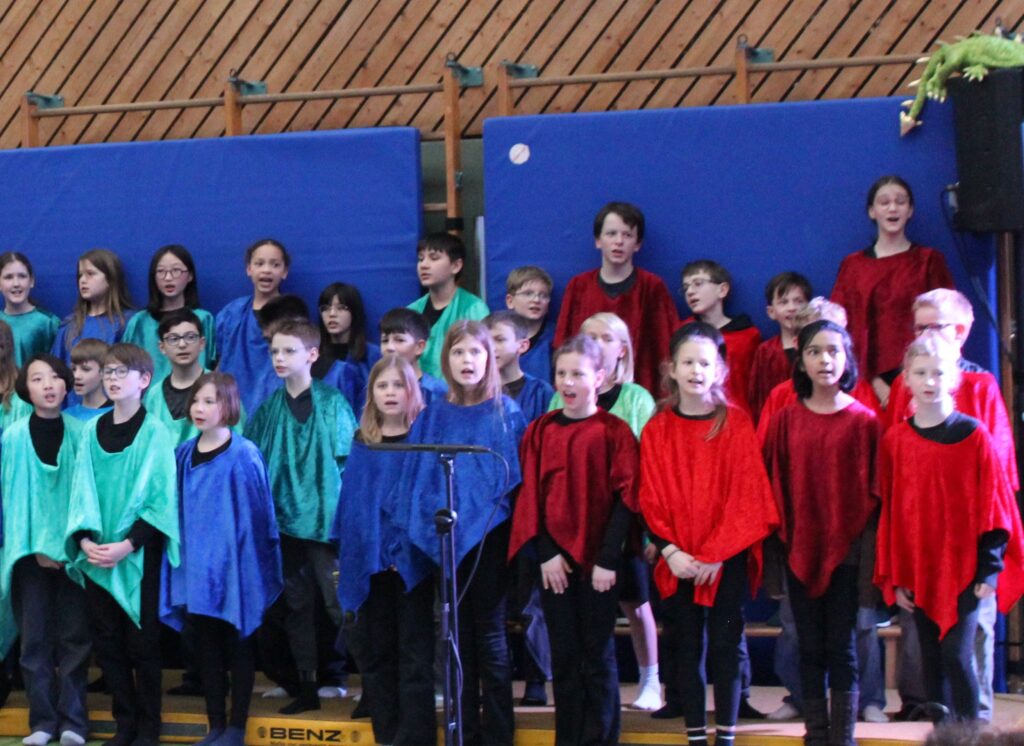 Empfangen wurden die Zuschauer:innen von den Schüler:innen der Klassen 5b, 5d und 6e, die als Chor in farbenfrohen Gewändern und in von der Jungen Oper zur Verfügung gestellten Kostümen bereits ihre Plätze eingenommen hatten. Gespannte Stille herrschte im Publikum und bei den jungen Sänger:innen, als dann die ersten Takte der Ouvertüre erklangen. Fünf Erzähler:innen führten das Publikum in das Bühnenbild ein- den Baum des Lebens, der das Königreich der Nacht mit dem Königreich des Tages verbindet und stellten die wichtigsten Personen vor: Die Königin der Nacht, den Priester Sarastro, Prinzessin Pamina und Prinz Tamino. Den Prinzen bekam das Publikum gleich in der nächsten Szene zu Gesicht, er wurde von einem Drachen quer durch das Publikum verfolgt und wurde vor lauter Schreck ohnmächtig. Damit möglichst viele Schüler:innen eine Rolle außerhalb des Chores spielen konnten, wurden sämtliche Rollen mehrfach besetzt, so dass in fast jeder Szene eine andere Schüler:in einen Soloauftritt hatte. Die schwierigen Gesangsparts wurden vom Ensemble der Jungen Oper, Assumpta Munsi, Sopran (Pamina), Rodrigo Alegre, Tenor (Tamino), sowie Stefan Lindemann, Bariton (Papageno und Sarastro) übernommen.