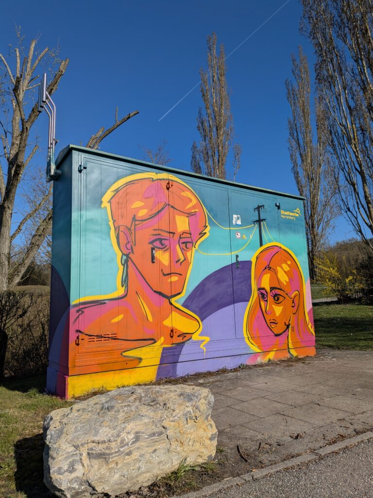 Sechs Schüler:innen der Klasse 9c nutzten in den vergangenen Wochen die Gelegenheit, ihre Kreativität auszuleben. Gemeinsam mit dem Streetart-Künstler Nathan Grant Kitch gestalteten sie im Auftrag der Stadtwerke Herrenberg zwei Gasdruckregelanlagen im Stadtgebiet mit Graffiti neu.