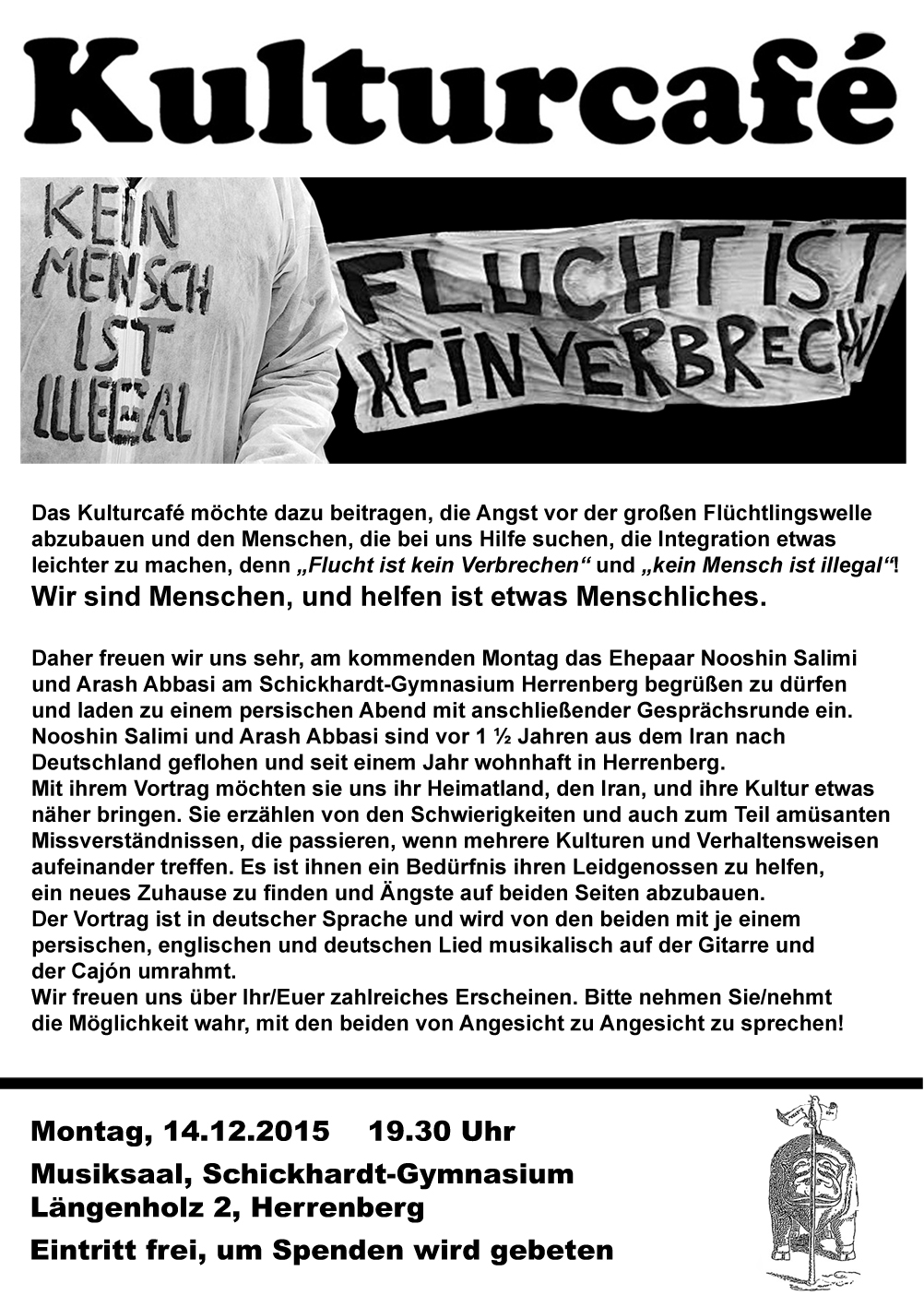 Das Kulturcafé möchte dazu beitragen, die Angst vor der großen Flüchtlingswelle abzubauen und den Menschen, die bei uns Hilfe suchen, die Integration etwas leichter zu machen, denn „Flucht ist kein Verbrechen“ und „kein Mensch ist illegal“!