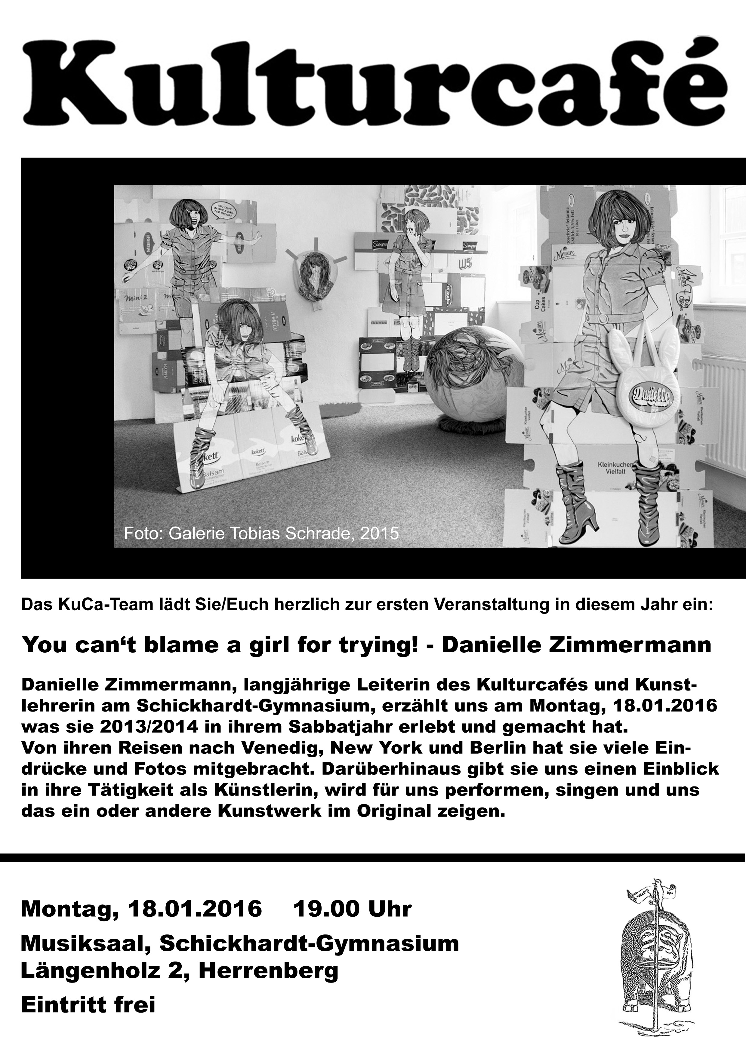 Danielle Zimmermann, langjährige Leiterin des Kulturcafés und Kunstlehrerin am Schickhardt-Gymnasium, erzählt uns am kommenden Montag, was sie 2013/2014 in ihrem Sabbatjahr erlebt und gemacht hat. Von ihren Reisen nach Venedig, New York und Berlin hat sie viele Eindrücke und Fotos mitgebracht. Darüberhinaus gibt sie uns einen Einblick in ihre Tätigkeit als Künstlerin, wird für uns performen, singen und uns das ein oder andere Kunstwerk im Original zeigen.