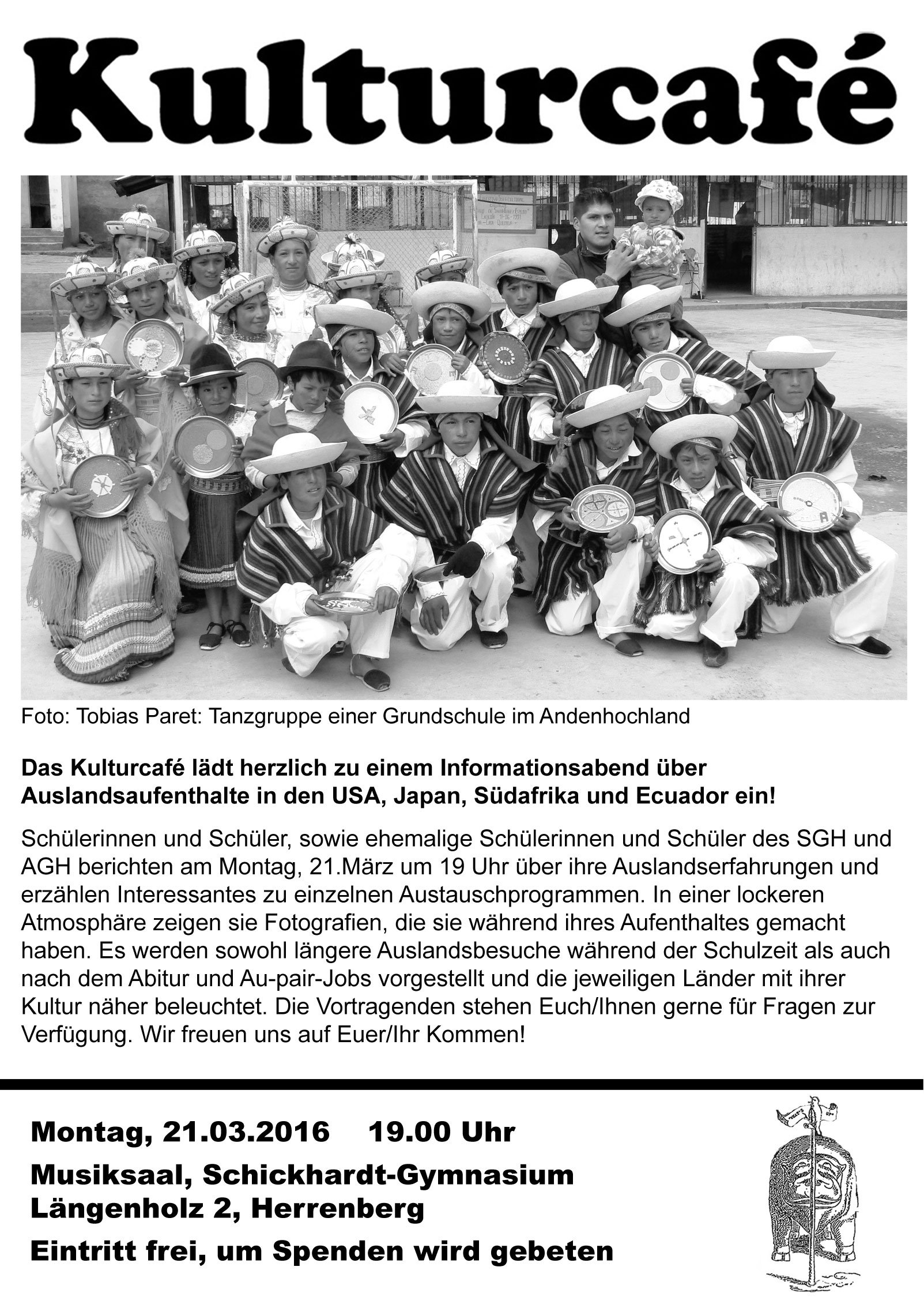 Schülerinnen und Schüler, sowie ehemalige Schülerinnen und Schüler des SGH und AGH berichten am Montag, 21.März um 19 Uhr über ihre Auslandserfahrungen und erzählen Interessantes zu einzelnen Austauschprogrammen. In einer lockeren Atmosphäre zeigen sie Fotografien, die sie während ihres Aufenthaltes gemacht haben. Es werden sowohl längere Auslandsbesuche während der Schulzeit als auch nach dem Abitur und Au-pair-Jobs vorgestellt und die jeweiligen Länder mit ihrer Kultur näher beleuchtet.