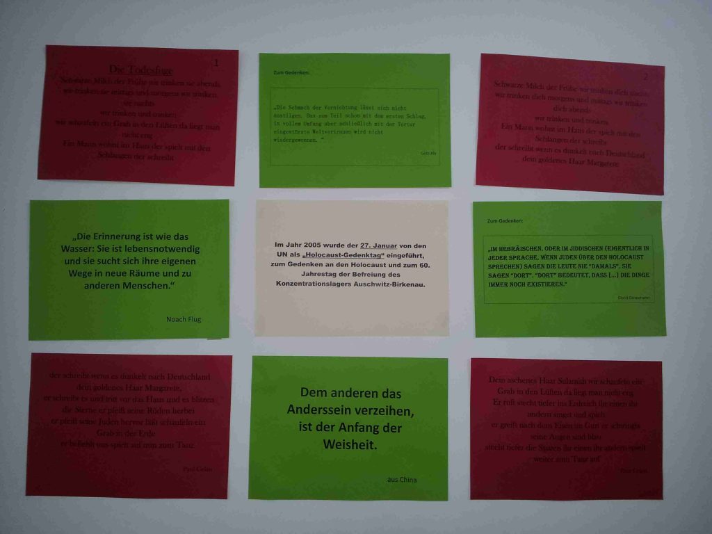 Der AK „Schule mit Courage“ erinnert am heutigen Holocaust-Gedenktag an die Opfer des Nationalsozialismus. Durch verschiedene Zitate, die im Schulhaus aufgehängt sind, soll zum Gedenken angeregt werden.