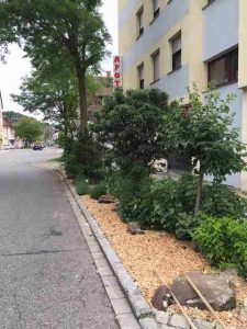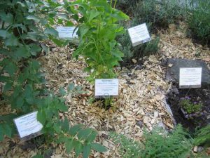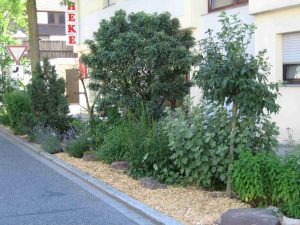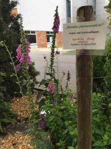 Im Sommer vergangenen Jahres präsentierte sich vor der Apotheke dank vieler fleißiger Hände ein Schaugarten in eindrucksvoller Vielfalt aus Katzenminze, Maggikraut, Zirtonenmelisse, Fingerhut, Beinwell, Boretsch, wildem Thymian und vielen anderen Heilpflanzen und -kräutern. 2-3 Mal im Jahr wird der Boden im Pflanzstreifen gelockert, Sand und Mineraldünger untergearbeitet. Außerdem hat Dr. Roland Feil für jede einzelne Pflanze Schildchen mit dem deutschen und lateinischen Namen sowie ihrer heilphysiologischen Verwendung gefertigt.