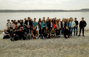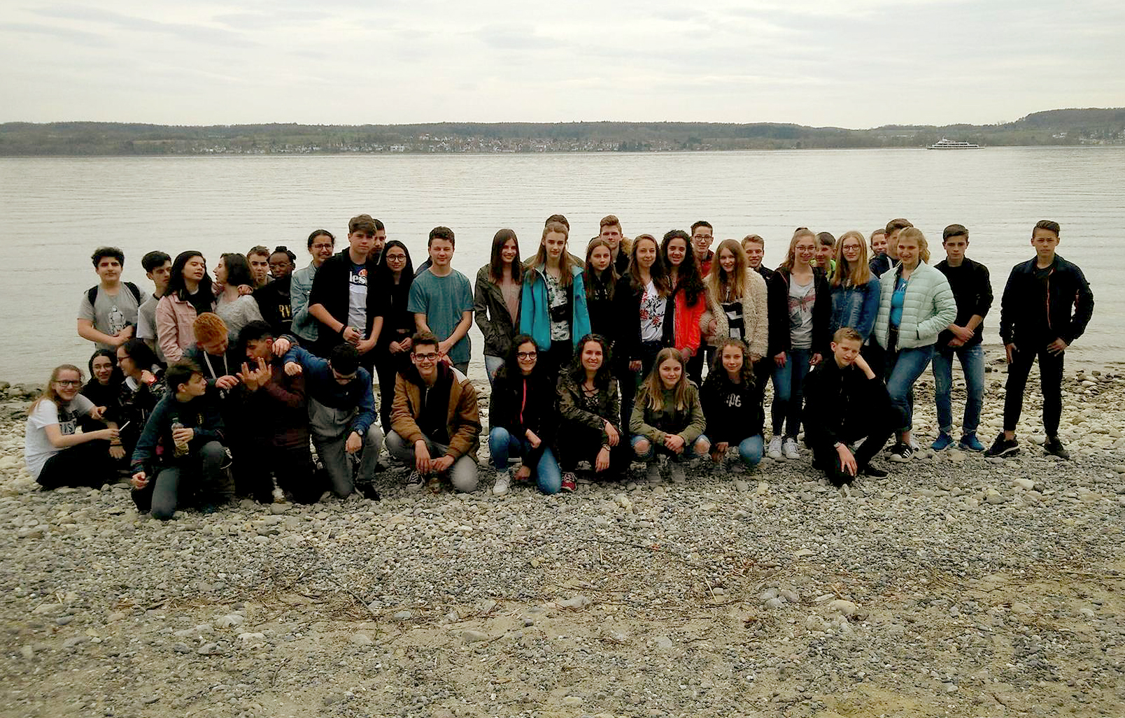 Am 9. April fuhren wir, 11 SchülerInnen der Klassenstufe 9 vom Schickhardt-Gymnasium Herrenberg und 13 SchülerInnen aus Renningen nach Überlingen. Wir fuhren mit dem Zug nach Überlingen und wollten unterwegs eigentlich unsere Partnerschüler aus Strasbourg treffen, aber wegen des Streiks der Bahn in Frankreich trafen die Franzosen vom Collège Fustel de Coulanges erst mit Verspätung ein. Wir waren in der Jugendherberge in Überlingen-Nußdorf untergebracht – super gelegen, mit Blick auf den Bodensee. Als endlich alle da waren, gab es zuerst ein kleines Picknick und dann lernten wir Überlingen bei einem Stadtspiel kennen. Die Zimmeraufteilung in der Juhe blieb unsere Entscheidung, solange Deutsche und Franzosen gemischt waren. Überhaupt stand alles unter dem Motto „franco-allemand“. Nach der Ankunft in der Jugendherberge in Überlingen mussten wir unsere Handys abgeben – was dann eigentlich gar nicht so schlimm war! Wir kannten unsere französischen Partner schon, weil sie uns im März besucht hatten, und so konnten wir gleich nach dem Stadtspiel mit der Arbeit über das Thema „Europa“ beginnen. Schon vor der Fahrt nach Überlingen mussten wir nämlich eine Präsentation vorbereiten: von deutsch-französischen Paaren sollten alle Länder der Europäischen Union vorgestellt werden. Am Montag und Dienstagnachmittags und abends waren diese Präsentationen dran. Am Dienstag waren wir nach dem Frühstück im Abenteuerpark Immenstad zum „Teamtraining“ und machten tolle Spiele und lösten zum Teil ganz schön schwierige Aufgaben. Am Mittwoch kam ein Beamter der Bundespolizei und informierte uns über das Thema „Grenze“ allgemein und ganz besonders am Bodensee. Danach fuhren wir mit dem Schiff zunächst nach Unteruhldingen und hatten dort eine Führung im Pfahlbaumuseum, danach ging es wieder mit dem Schiff weiter nach Meersburg und dort durften wir bei schönstem Wetter unsere Freizeit genießen. Abends spielten wir gemeinsam mit den Franzosen noch Fußball, Basketball und machten dann ein Gruppenspiel bzw. arbeiteten an zwei kreativen Angeboten von Frau Zimmermann und Madame Thiébaux: bei der einen stellten wir aus Tesafilm und Zeitungstexten mit einer besonderen Technik Heftumschläge her, bei der anderen wurden „Light paintings“ gemacht, also eine Art überbelichtete Fotos.