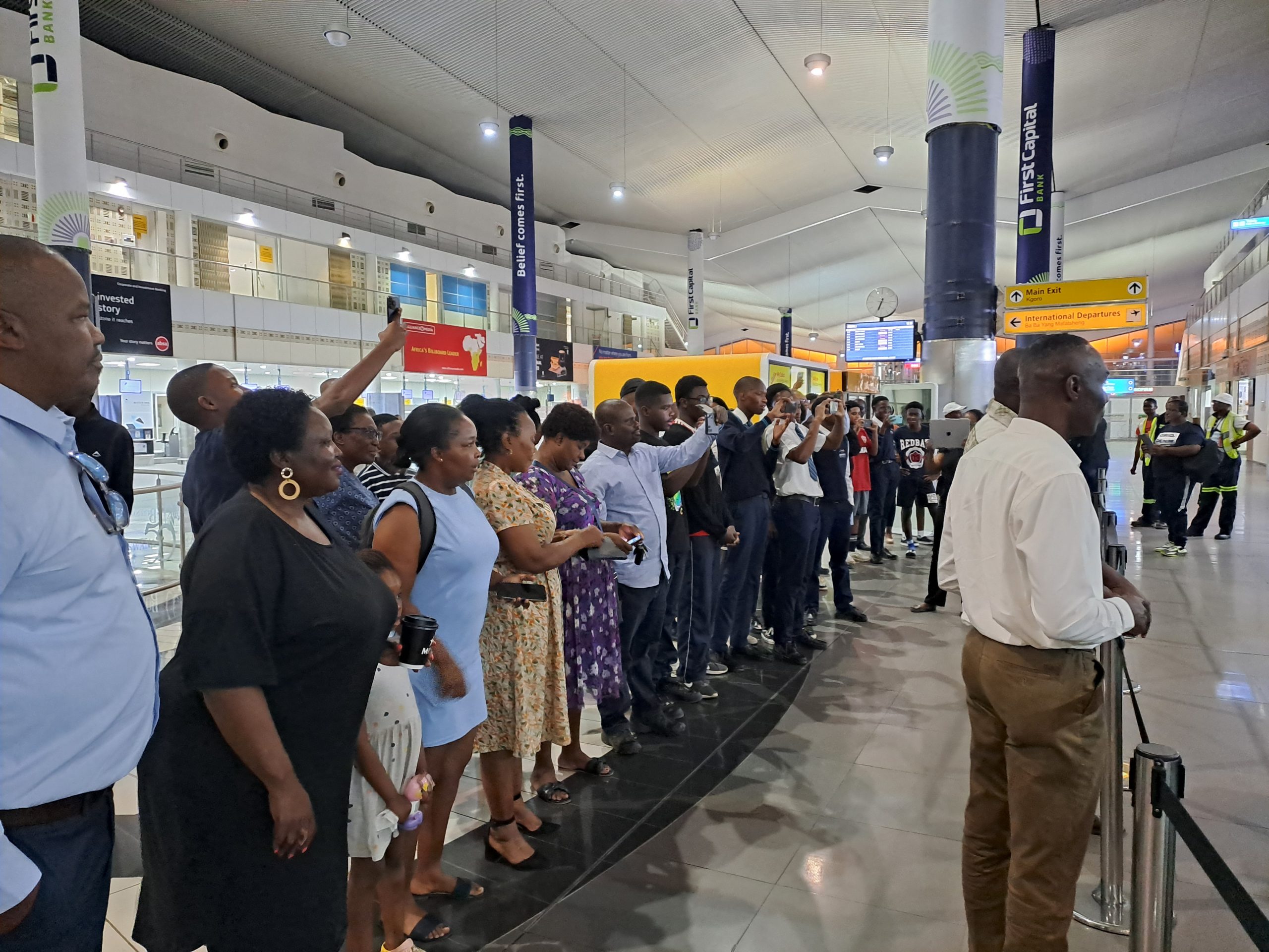 Morgens um 8:30 fuhr unsere Bahn in Herrenberg los nach Stuttgart. Alle sind aufgeregt und gespannt auf das Abenteuer, das auf uns zukommt. Doch der Beginn ist anstrengend. Nachdem wir mit dem ICE von Stuttgart nach Frankfurt angekommen waren, ging es kurz darauf ab zum Flieger und nach Doha (Qatar). Im Voraus aß jeder noch etwas und manche verbrachten ihre Zeit noch auf dem Aussichtsdeck an den Landebahnen. Der Flug nach Doha war lang, doch jeder fand in den 5 Stunden Flugzeit eine Beschäftigung. Sei es die Zeit vor dem Bildschirm, mit dem Nebensitzer oder mit schlafen. Schließlich kamen wir um ca. 0 Uhr in Doha an, einem riesigen Flughafen mit Caws und- Teddybärfiguren, sicher 20 Meter hoch. Doha erstaunte uns, da es schon echt eine mächtige und für diese Region untypische Anlage ist. Den Hallen fehlte nichts an großen Bildschirmen und Geschäften. Nun ging dann der Flug von Doha nach Johannisburg um ca. 2:30 Uhr ab und für manche war dieser im Gegensatz zum ersten Flug wesentlich anstrengender. Schlafen ging jedoch ganz gut. Wir flogen 7 1/2 Stunden und der Service bei Qatar Airways war recht gut, abgesehen vom Essen. Angekommen in Johannisburg sind wir gerade in einem Terminal, manche aßen noch etwas und haben gechillt, bis es jetzt zur letzten Runde nach Gaborone geht. Kurz darauf setzten wir uns in den Flieger, landeten in Gabrone und wurden schließlich jubelnd von den Gastfamilien begrüßt. Nach dem Fotoshooting und dem erneuten kurzen Kennenlernen gingen wir alle getrennte Wege zu unseren Gastfamilien und ließen den anstrengenden Tag ausklingen. Jeder von uns war sehr froh, endlich angekommen zu sein und es war ein sehr eindrückliches erstes Erlebnis mit neuen Eindrücken. (Konstantin Glückler und Levin Yesil)