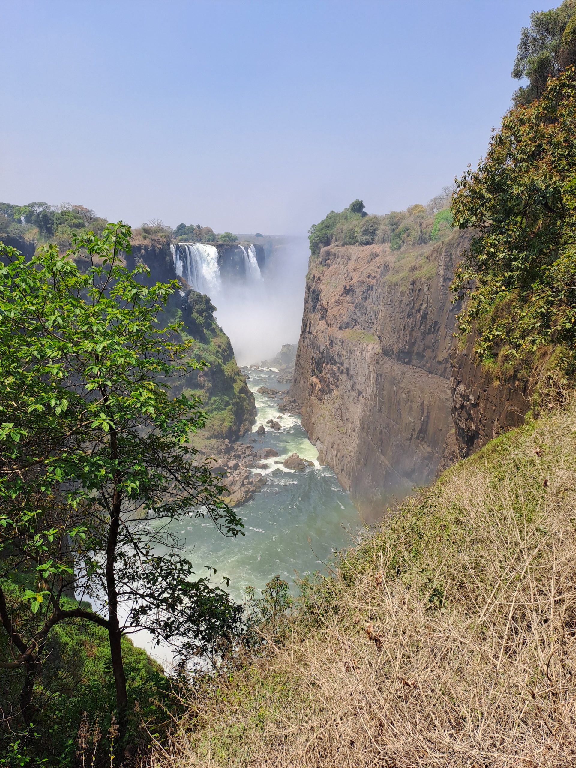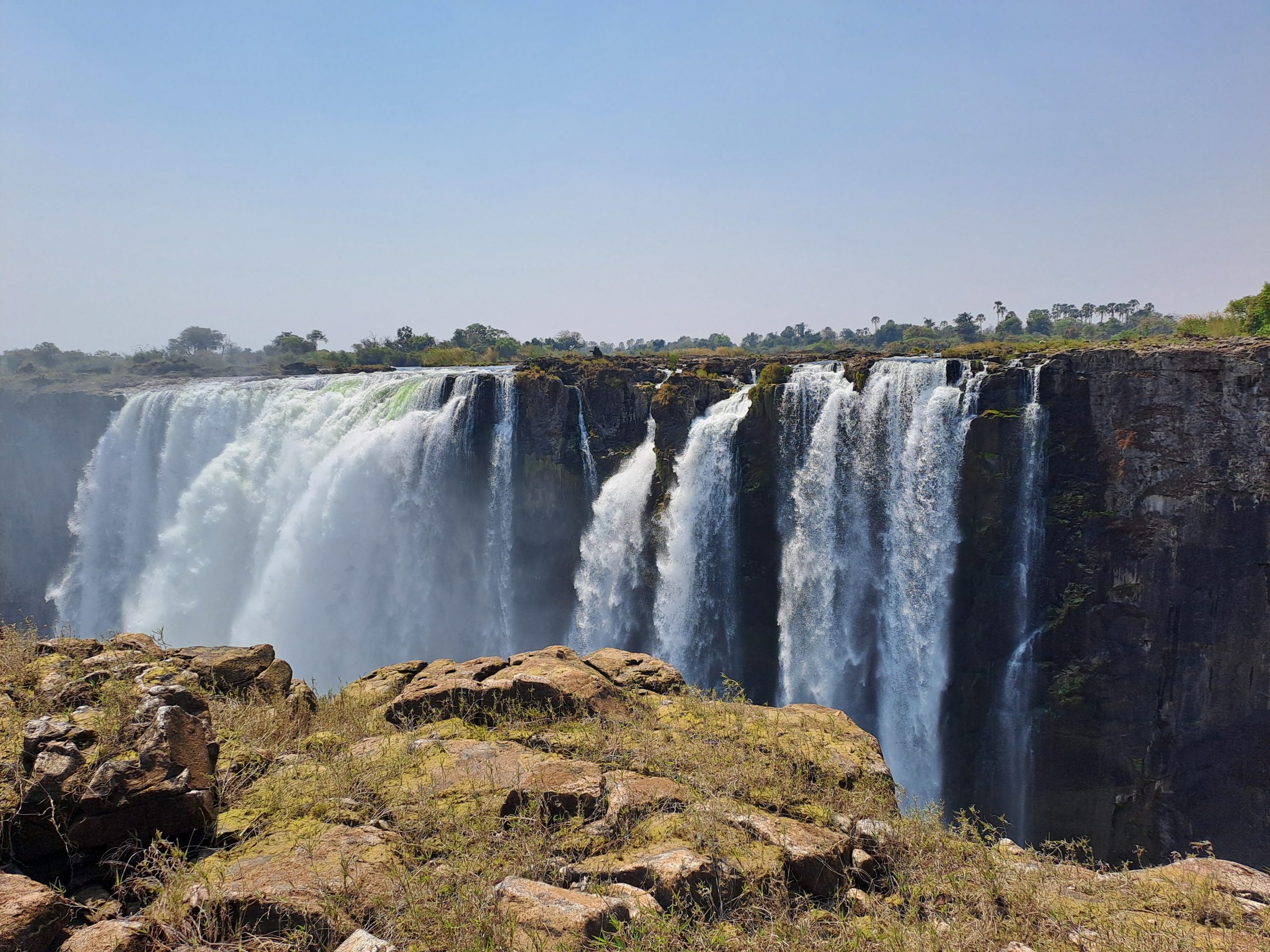 Am 6. Tag in Kasane gab es um 7 Uhr Frühstück. Danach fuhren um 8 Uhr zu den Victoria Fällen los. Als wir an der Grenze zwischen Botswana und Zimbabwe ankamen mussten wir uns zunächst in Botswana abmelden und kurz darauf in Zimbabwe anmelden, indem wir Zettel mit unseren Passdaten ausfüllten und diese mit den Pässen an den Schaltern kontrollieren und stempeln ließen. Nach ungefähr 2,5 Stunden kamen wir an unserem Ziel an, den Victoria Fällen. Als wir dort ankamen gingen wir zunächst zum ersten Checkpoint, wo wir die atemberaubenden Victoria Fälle sahen. Die Victoria Fälle gehen circa 100 bis 110 Meter in die Tiefe. Anschließend gingen wir zu den folgenden Checkpoints, welche uns weitere fantastische Fotos ermöglichten. Die Victoria Fälle bestehen aus mehreren kleinen und große Wasserfällen und gehört zu den Weltwundern. Nachdem wir den letzten Checkpoint besichtigen gingen wir Pommes und Chicken Wings essen welche, uns für die Rückfahrt stärkten. Bei unserer Fahrt stoppten wir an der Kazungula Brücke und bekamen eine Führung während wir sie besichtigen. Danach fuhren wir zurück nach Kasane wo wir unser Abendessen bekamen. Nach dem Abendessen kamen uns traditionelle Tänzer besuchen welche uns einheimische Tänze vorführten. Zudem tanzten wir danach noch einen Tanz mit ihnen, dies machte unheimlich Spaß. Damit nahm der Tag langsam aber sicher sein Ende und wir gingen ins Bett, da wir für die Rückfahrt fit sein wollten. In der Nacht waren jedoch viele Schreie von Tieren zu hören (Adrian Bräuning-Limon).