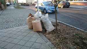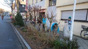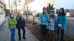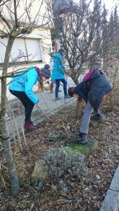Bevor die Erde von fleißigen Schülerhänden gemischt und untergearbeitet wird, muss Unkraut gejätet werden, damit der Garten abschließend mit Rindenmulch abgedeckt werden kann. Hierdurch kann der Boden die Feuchtigkeit besser speichern und der Unkrautwuchs eingedämmt werden.