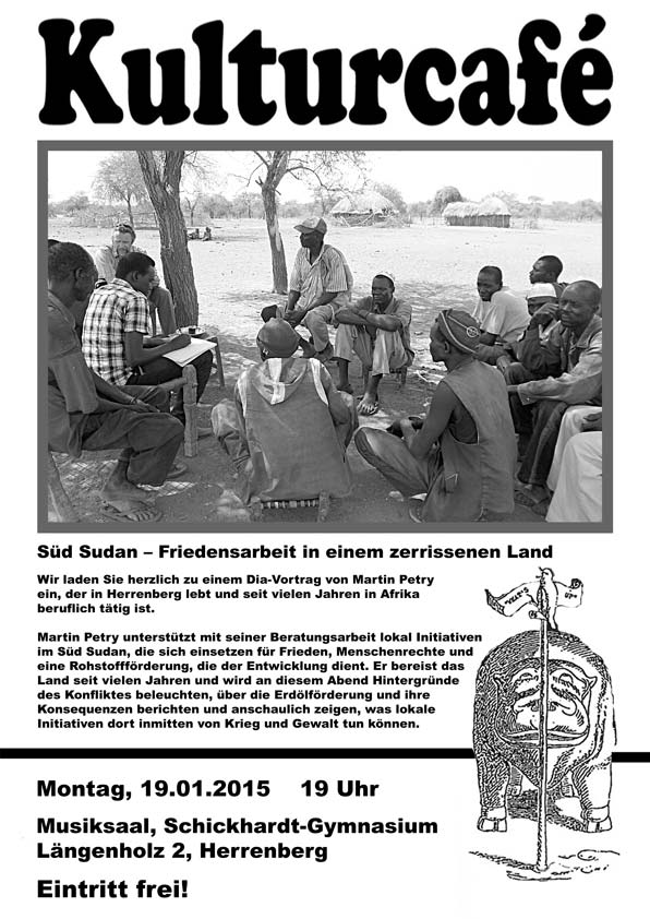 Martin Petry unterstützt mit seiner Beratungsarbeit lokal Initiativen im Süd Sudan, die sich einsetzen für Frieden, Menschenrechte und eine Rohstoffförderung, die der Entwicklung dient. Er bereist das Land seit vielen Jahren und wird an diesem Abend Hintergründe des Konfliktes beleuchten, über die Erdölförderung und ihre Konsequenzen berichten und anschaulich zeigen, was lokale Initiativen dort inmitten von Krieg und Gewalt tun können.