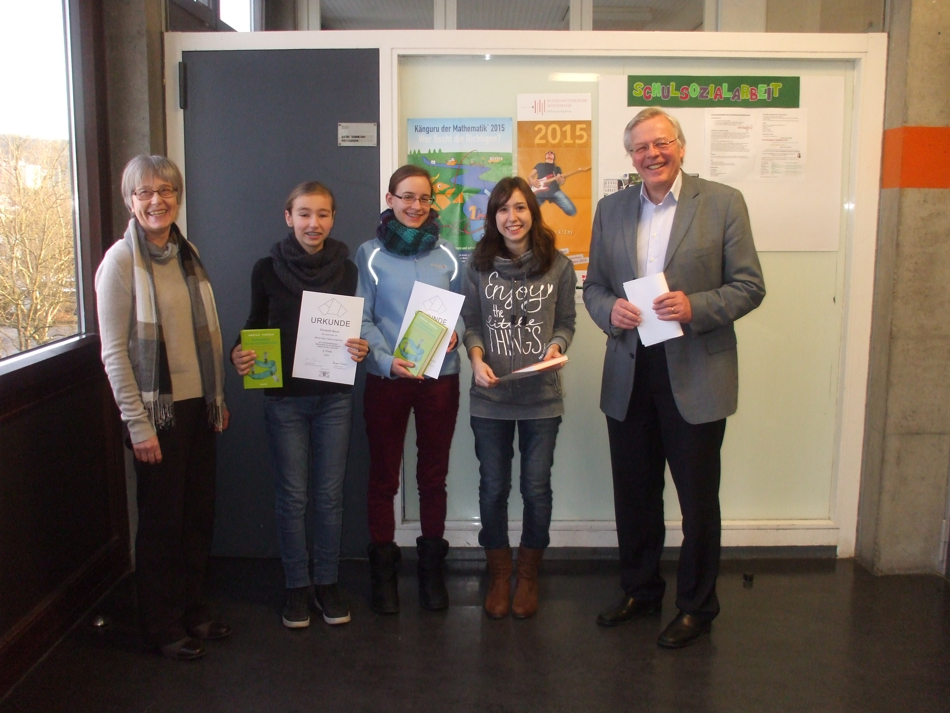 Nachdem die Arbeitsgruppe kurz vor den Weihnachtsferien erfahren hatte, dass ihre Lösungen offensichtlich doch trotz der zeitlichen Enge recht gut gewesen sind und ihnen ein 2. Preis beim Landeswettbewerb zuerkannt worden ist, sind in den letzten Tagen auch die Urkunden eingetroffen, so dass Herr Drocur zusammen mit Frau Riester die kleine Ehrung vornehmen konnte. Da beim Landeswettbewerb nur für Einzelteilnehmer Preisbücher vorgesehen sind, nicht aber für Gruppen, ließ es sich Gudrun Riester nicht nehmen, auch für diese drei Schülerinnen entsprechende Buchpreise auszuloben, worüber sich die drei Schülerinnen natürlich sehr gefreut haben.