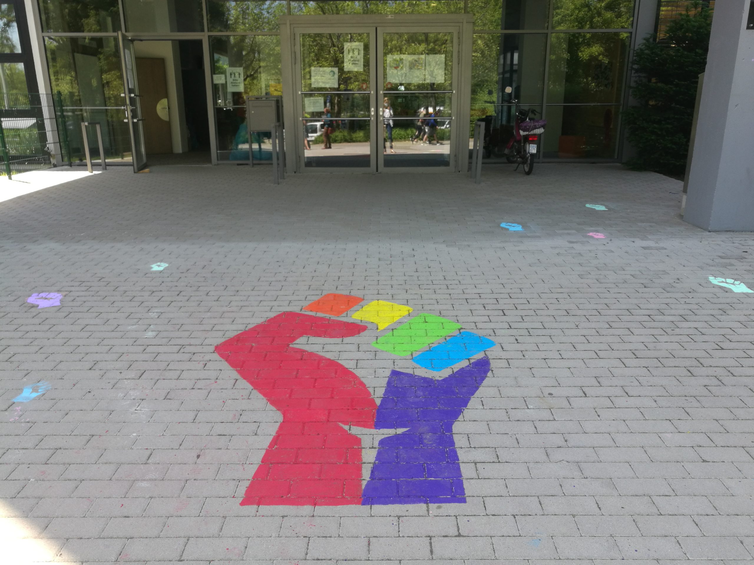 Schüler*innen der Klasse 10 gestalten, unterstützt von der Schulleitung und dem AK Courage, verschiedene Projekte wie das Sprühen eines Symbols für Vielfalt und Akzeptanz vor dem Haupteingang oder das Anbringen von Plakaten im Schulgebäude mit Erklärungen und Zitaten rund um das Thema LGBTQ+.