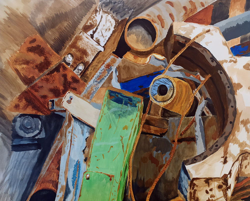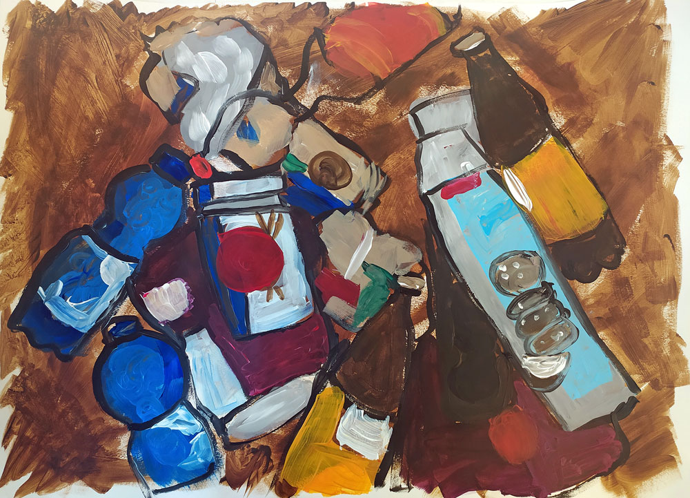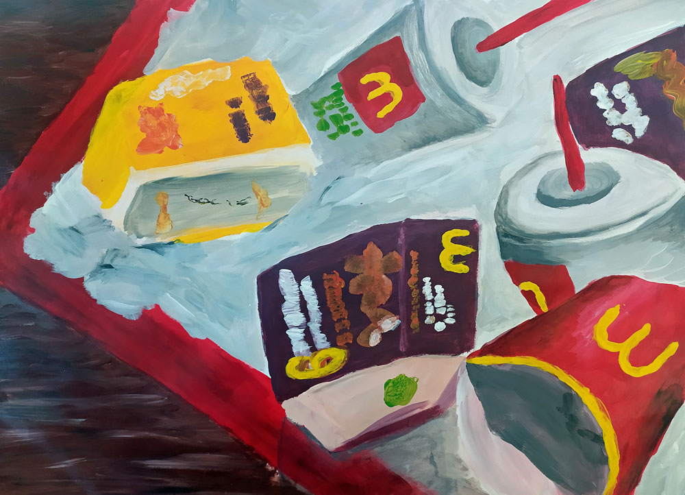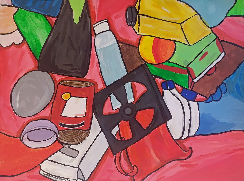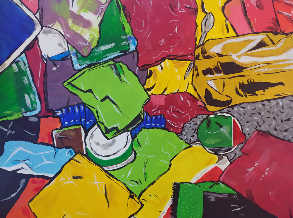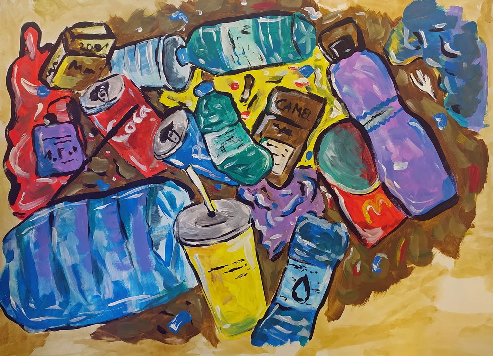 Mit Gabriele Münter als Vorbild malten wir Ausschnitte von Müllhalden. Die expressionistische Malweise Münters genau zu imitieren, war nicht sehr einfach, aber die für den Expressionismus typische vereinfachte Darstellung machte es uns deutlich leichter. Es war uns freigestellt, ob wir das Motiv eines Ausschnitts vom Schrottplatz oder eines Blickes in die Mülltonne wählen, um es danach mit Acrylfarben zu verbildlichen. Durch die freie Motivwahl fielen die Werke teilweise sehr unterschiedlich aus, im Grunde war diese Aufgabe jedoch bei allen eine unserer buntesten Übungen.