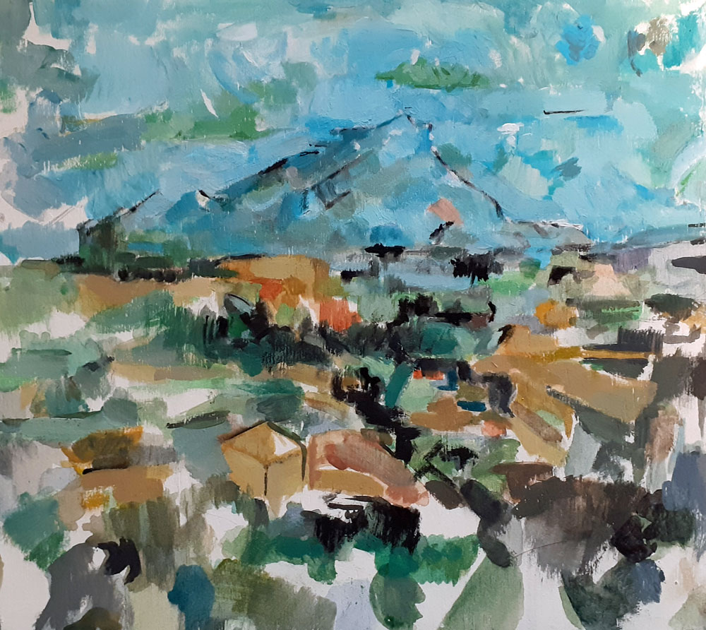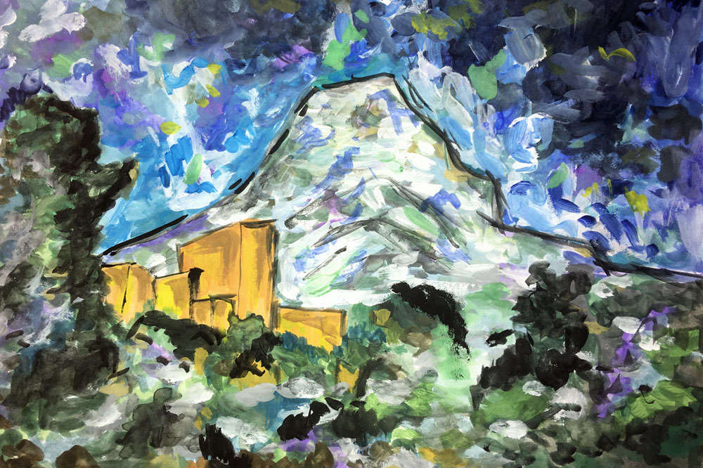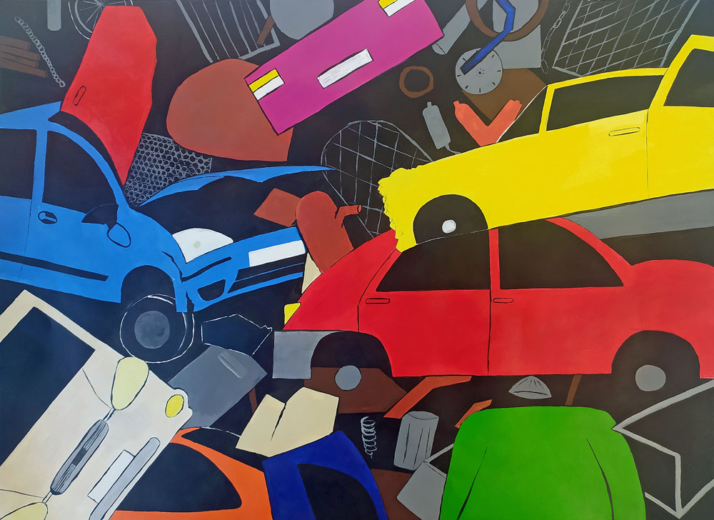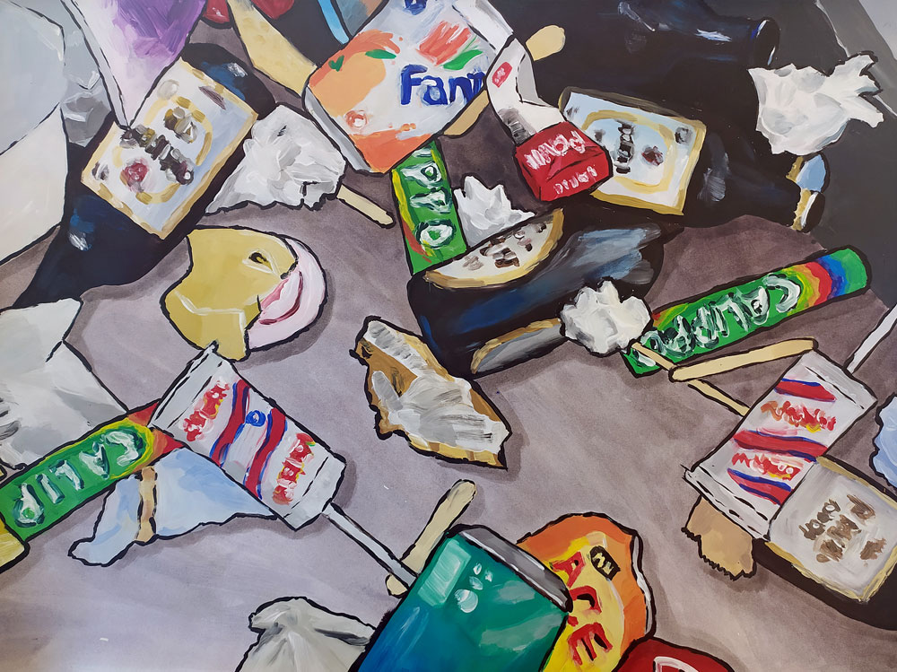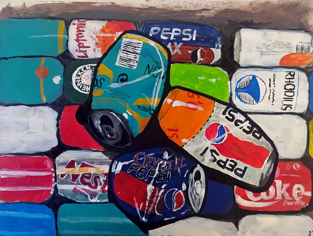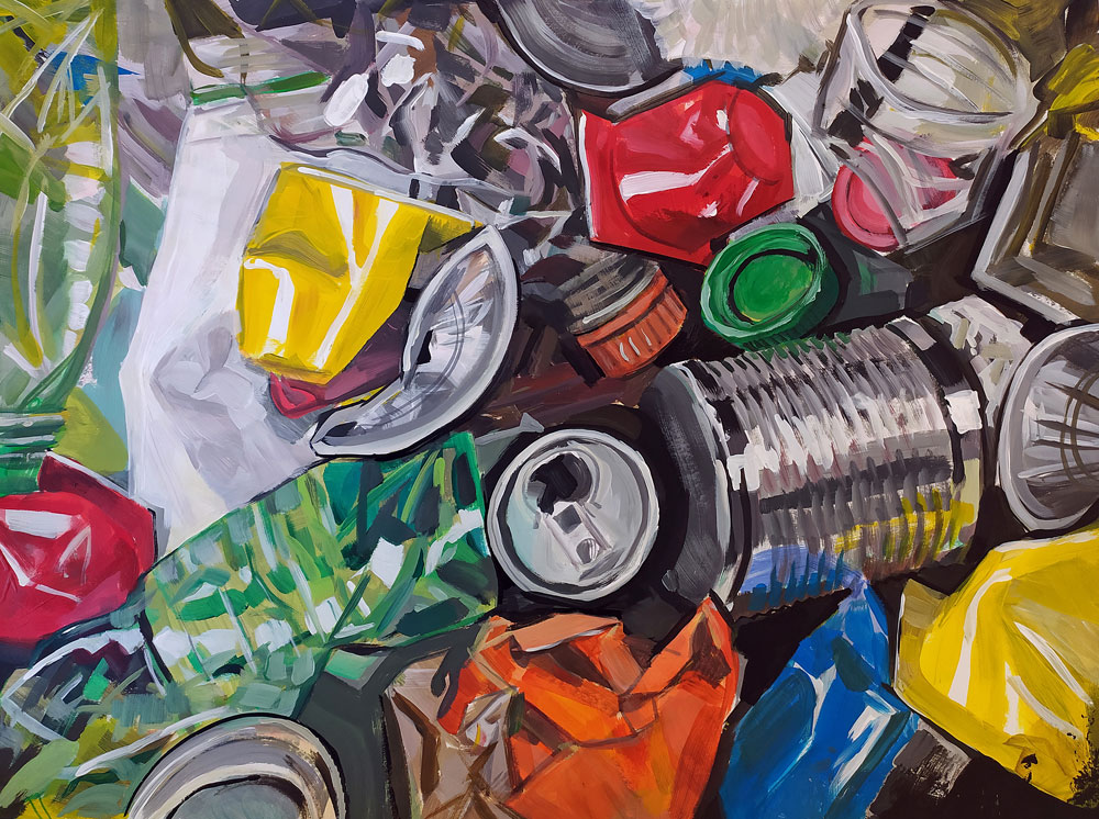 Mit Gabriele Münter als Vorbild malten wir Ausschnitte von Müllhalden. Die expressionistische Malweise Münters genau zu imitieren, war nicht sehr einfach, aber die für den Expressionismus typische vereinfachte Darstellung machte es uns deutlich leichter. Es war uns freigestellt, ob wir das Motiv eines Ausschnitts vom Schrottplatz oder eines Blickes in die Mülltonne wählen, um es danach mit Acrylfarben zu verbildlichen. Durch die freie Motivwahl fielen die Werke teilweise sehr unterschiedlich aus, im Grunde war diese Aufgabe jedoch bei allen eine unserer buntesten Übungen.