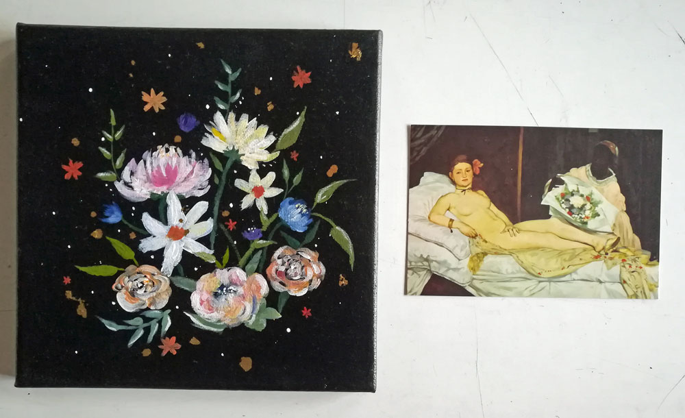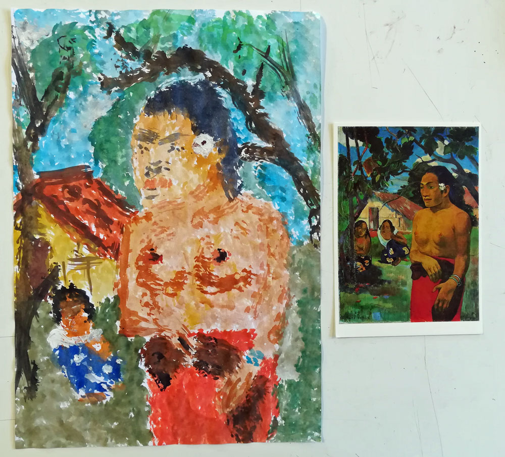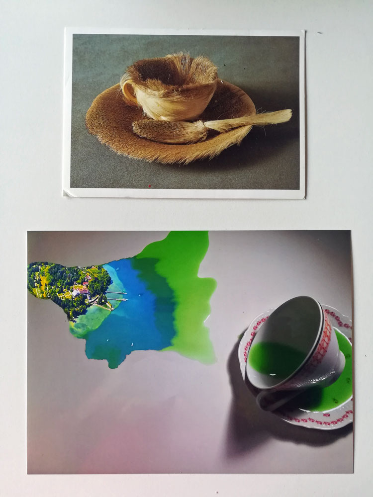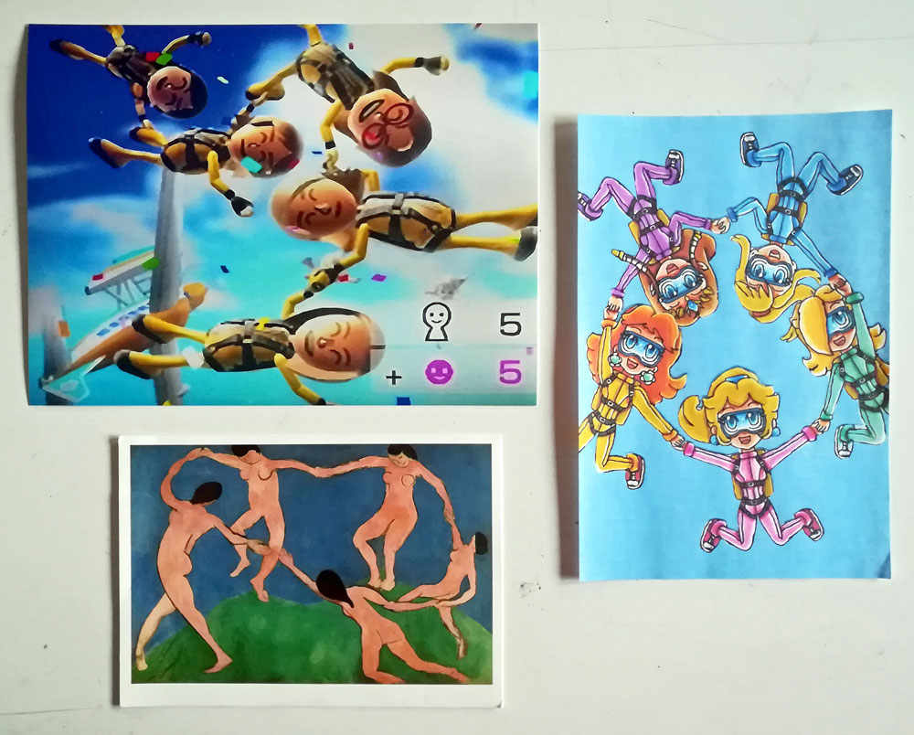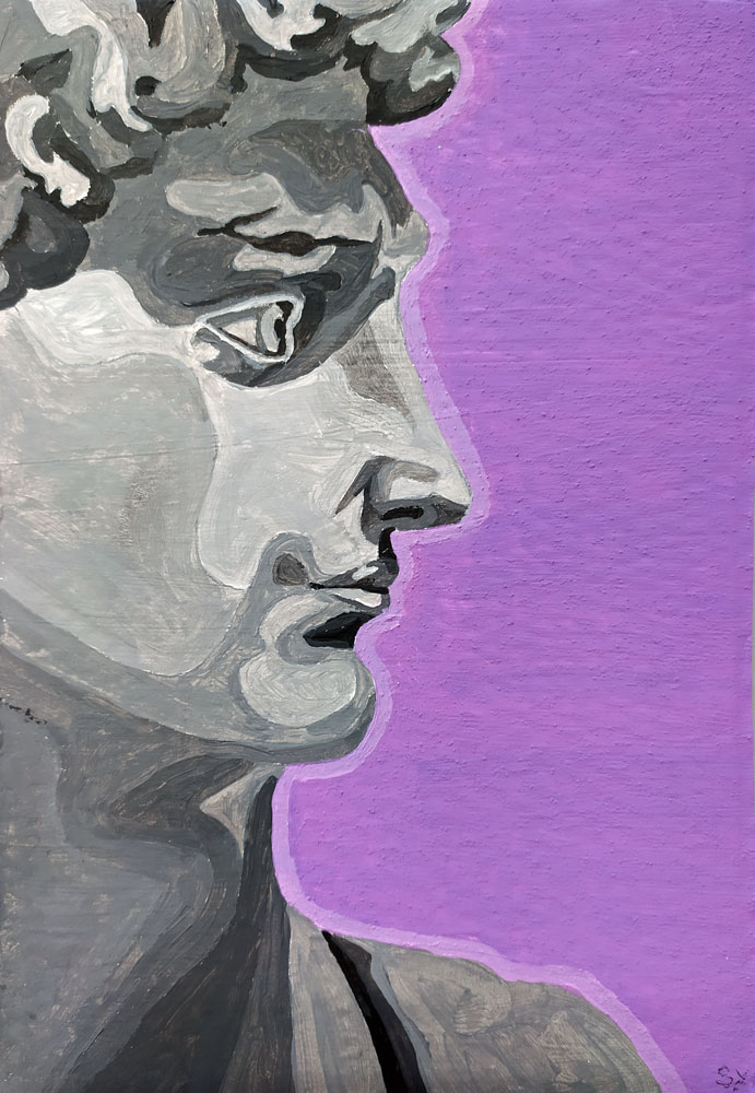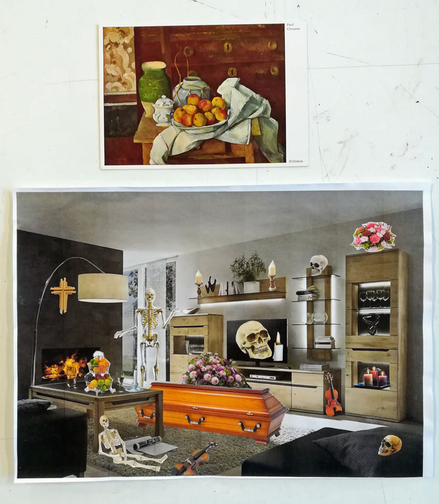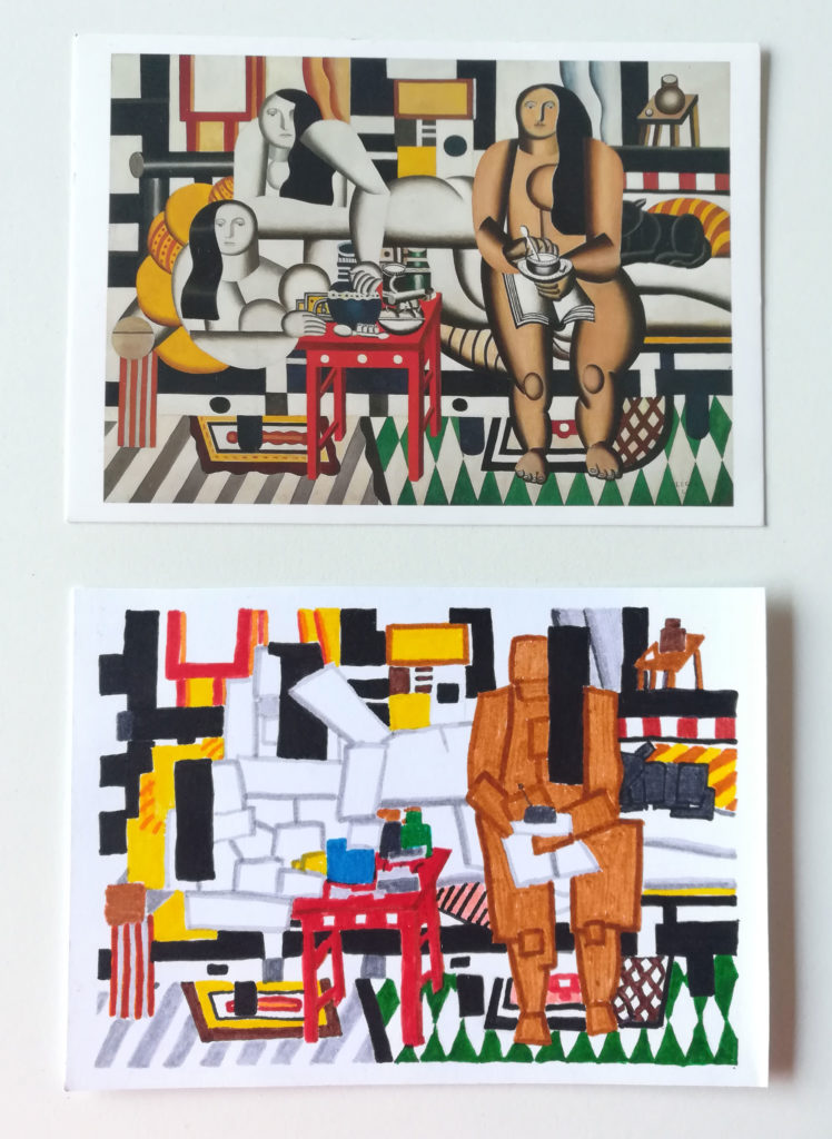 „Unsere Lieblingsaufgabenstellung war das „Postkartenprojekt“, bei dem wir uns drei Postkarten aussuchen durften, die jeweils berühmte Kunstwerke zeigten. Dazu sollten wir je 3 Neuinterpretationen gestalten. Inspiriert wurden wir dafür auf unserer Exkursion in die Kunsthalle Tübingen, wo in der Ausstellung „COMEBACK – Kunsthistorische Renaissance“ eine Vielzahl kunsthistorisch bekannter Werke neu interpretiert zu sehen waren. Diese waren dann eine Inspiration für unsere eigenen Arbeiten. Das Endergebnis musste jedoch keine offensichtliche Referenz zu dem Bild auf der Postkarte zeigen, sondern man sollte durch die Postkarte lediglich einen Gedanken- und Ideenanstoß bekommen. Auch die Wahl der Technik war uns freigestellt. Besonders an dieser Aufgabenstellung hat uns gefallen, dass man in seinem Arbeiten sehr frei war und dass man gleichzeitig auch berühmte Kunstwerke und Künstler*innen kennengelernt hat, da auch jeder von uns eine kurze Präsentation über die Künstler*in der jeweiligen Postkarte halten musste.“