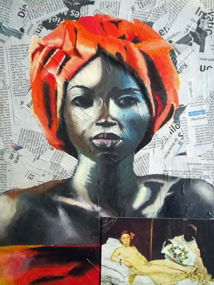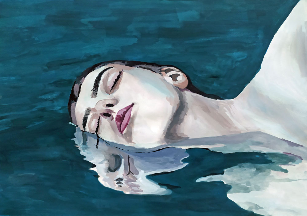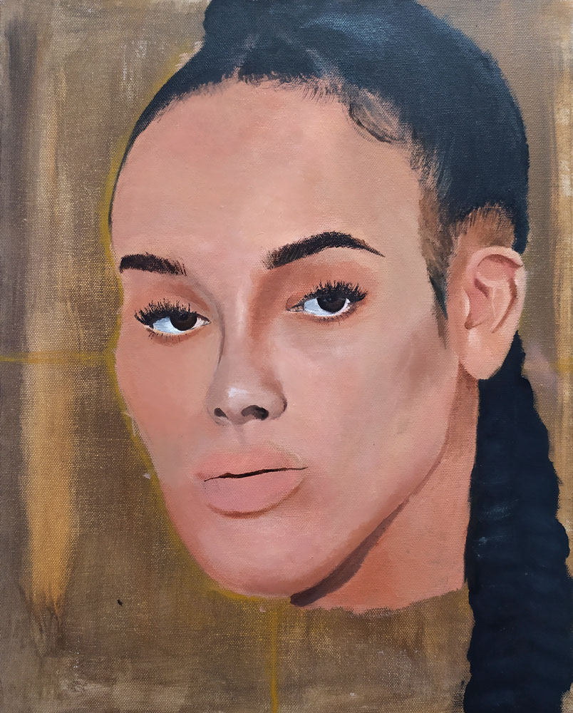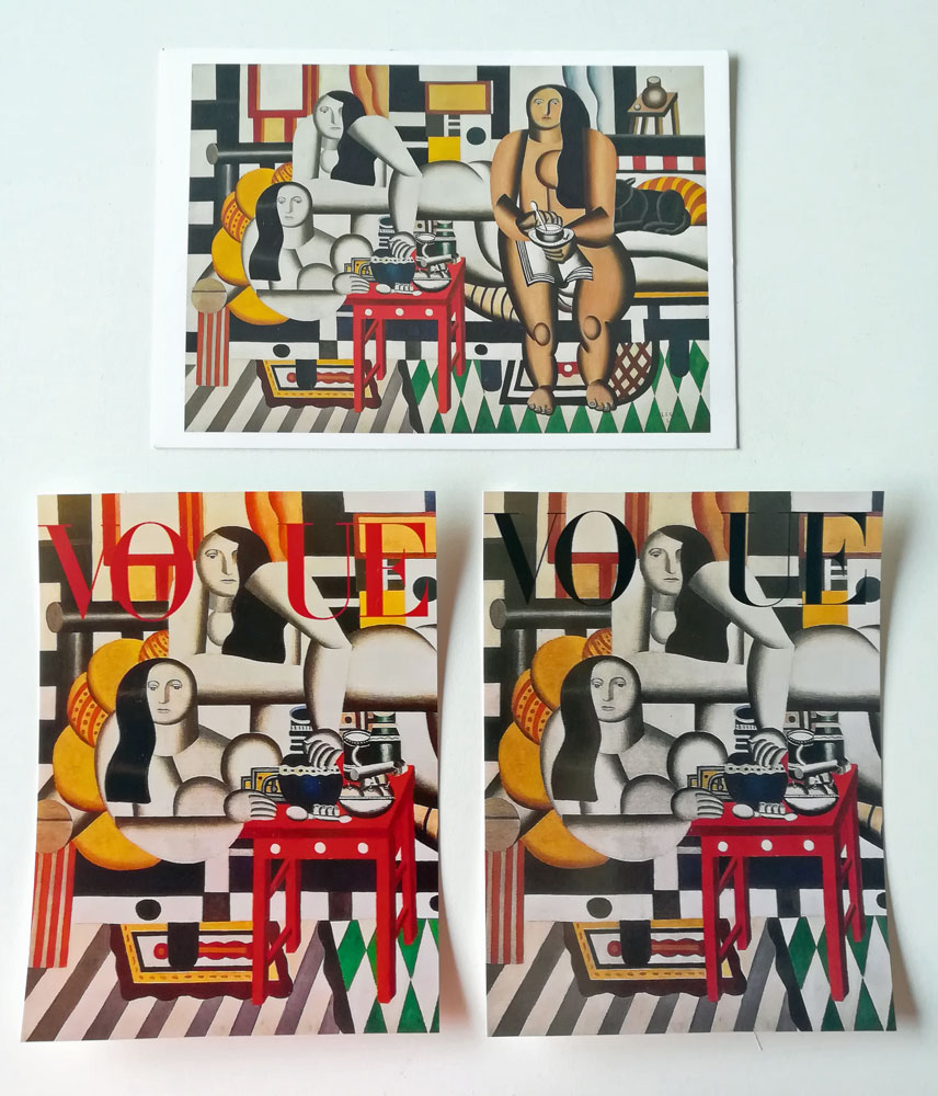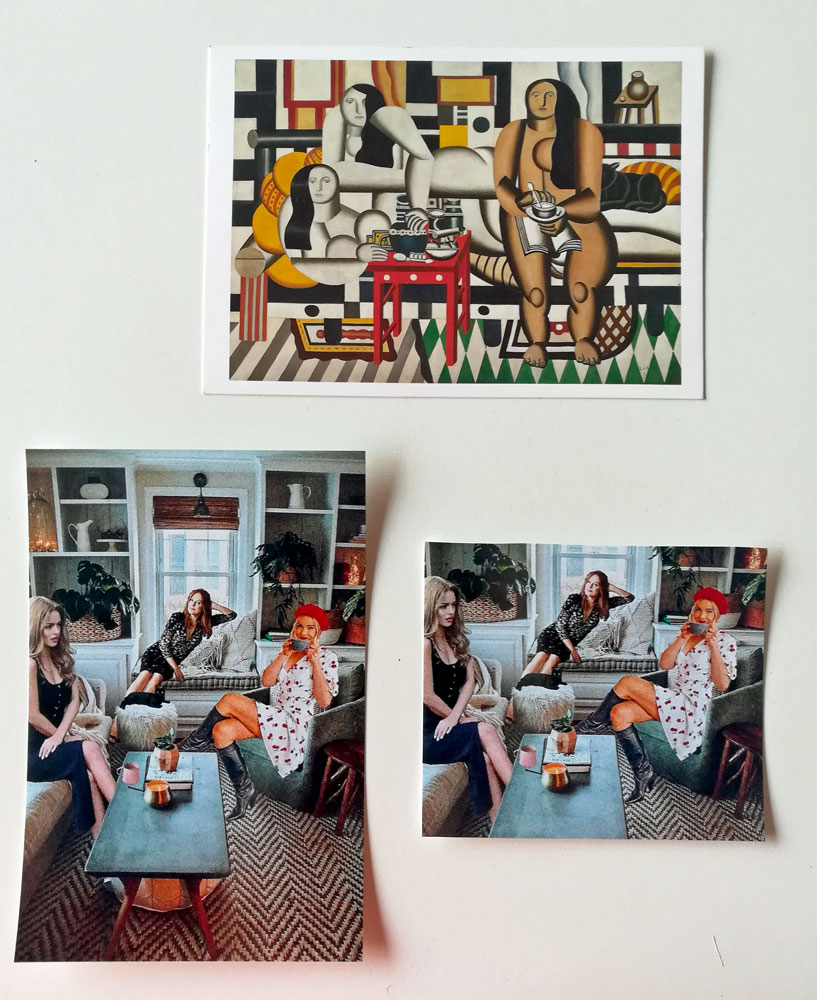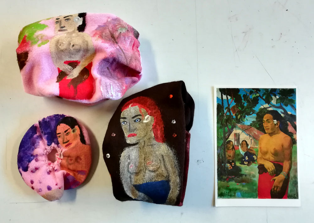 „Unsere Lieblingsaufgabenstellung war das „Postkartenprojekt“, bei dem wir uns drei Postkarten aussuchen durften, die jeweils berühmte Kunstwerke zeigten. Dazu sollten wir je 3 Neuinterpretationen gestalten. Inspiriert wurden wir dafür auf unserer Exkursion in die Kunsthalle Tübingen, wo in der Ausstellung „COMEBACK – Kunsthistorische Renaissance“ eine Vielzahl kunsthistorisch bekannter Werke neu interpretiert zu sehen waren. Diese waren dann eine Inspiration für unsere eigenen Arbeiten. Das Endergebnis musste jedoch keine offensichtliche Referenz zu dem Bild auf der Postkarte zeigen, sondern man sollte durch die Postkarte lediglich einen Gedanken- und Ideenanstoß bekommen. Auch die Wahl der Technik war uns freigestellt. Besonders an dieser Aufgabenstellung hat uns gefallen, dass man in seinem Arbeiten sehr frei war und dass man gleichzeitig auch berühmte Kunstwerke und Künstler*innen kennengelernt hat, da auch jeder von uns eine kurze Präsentation über die Künstler*in der jeweiligen Postkarte halten musste.“