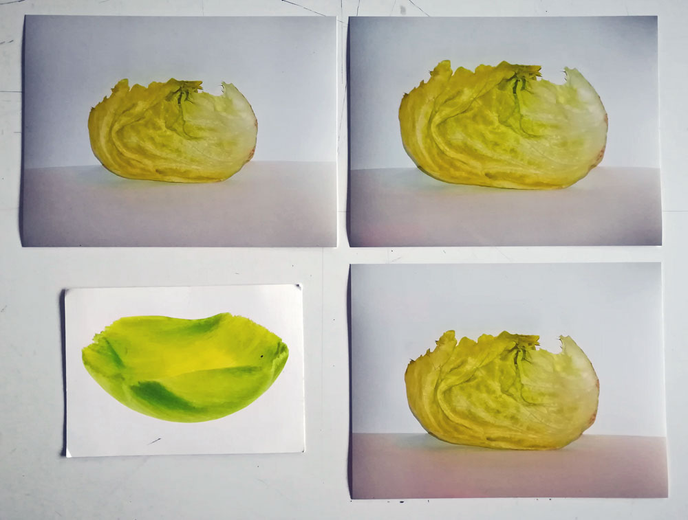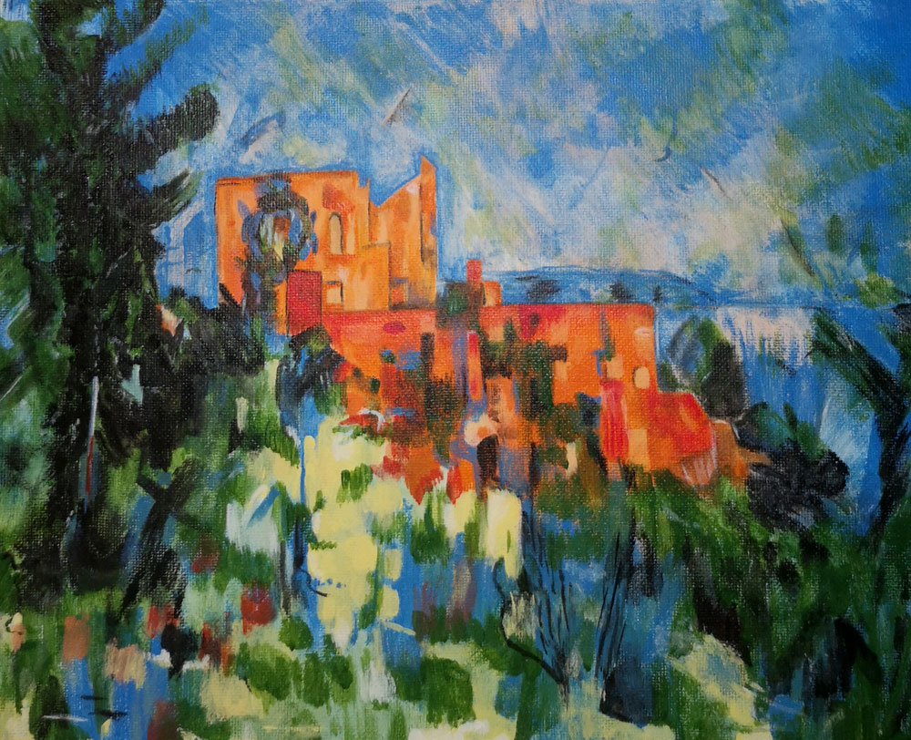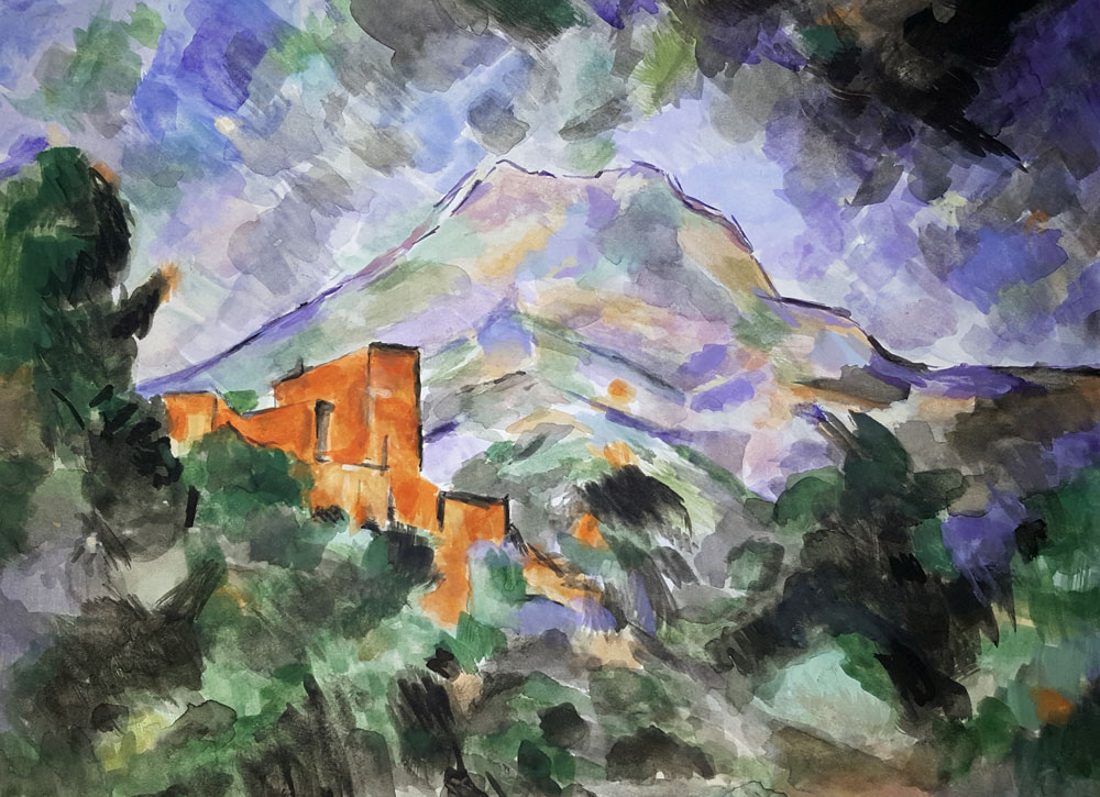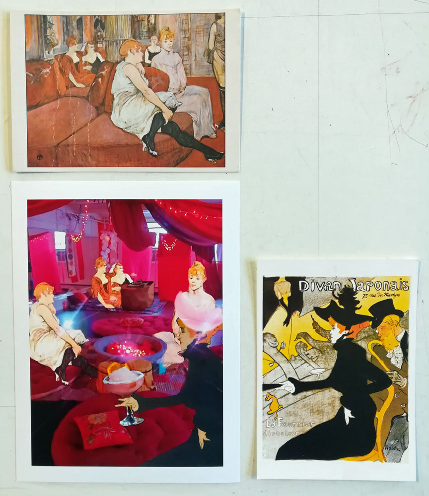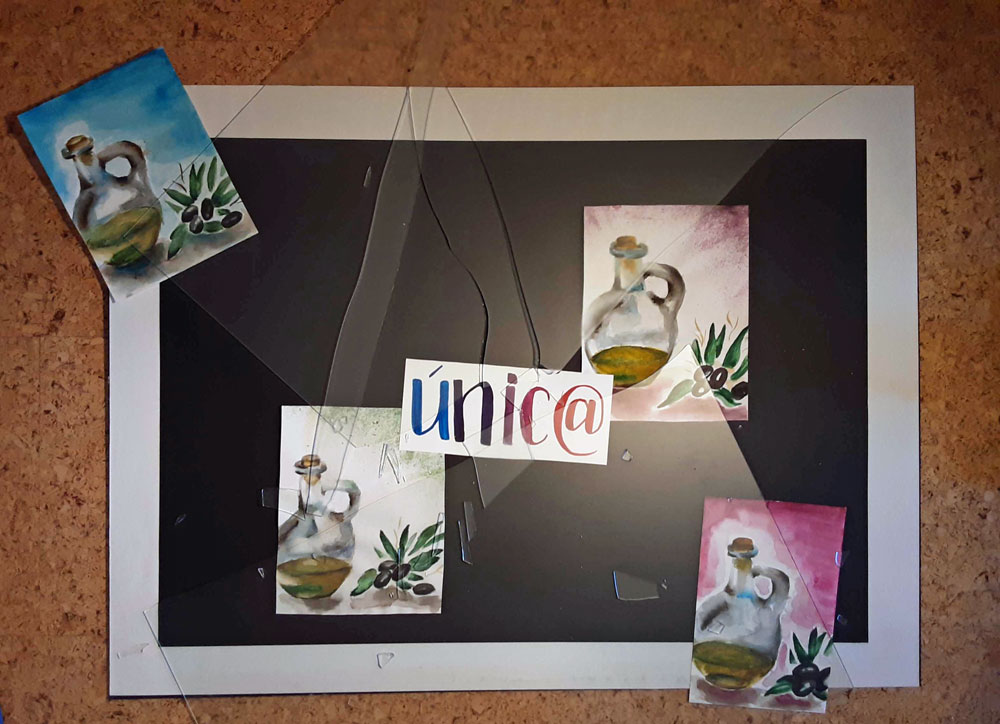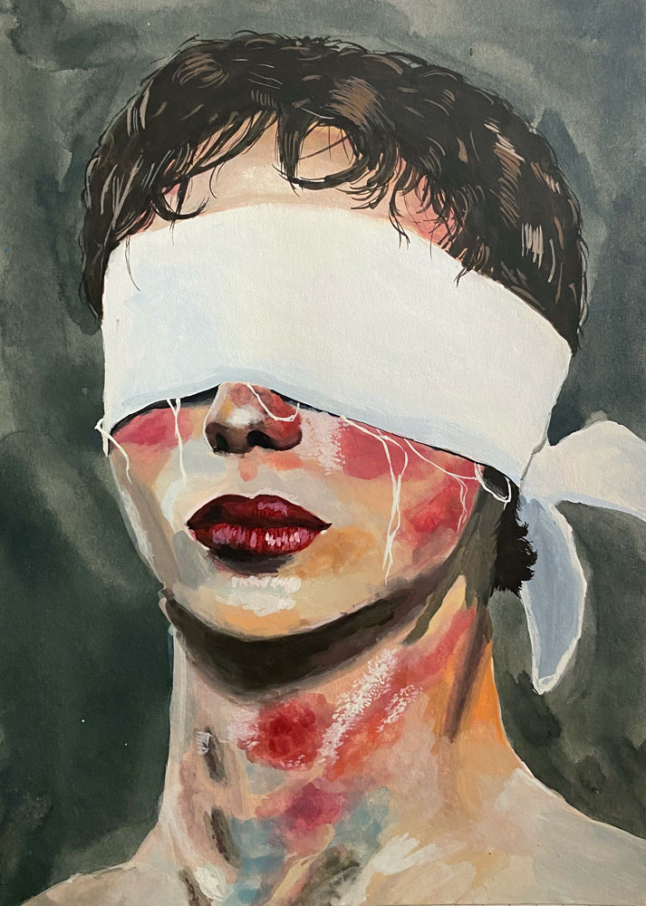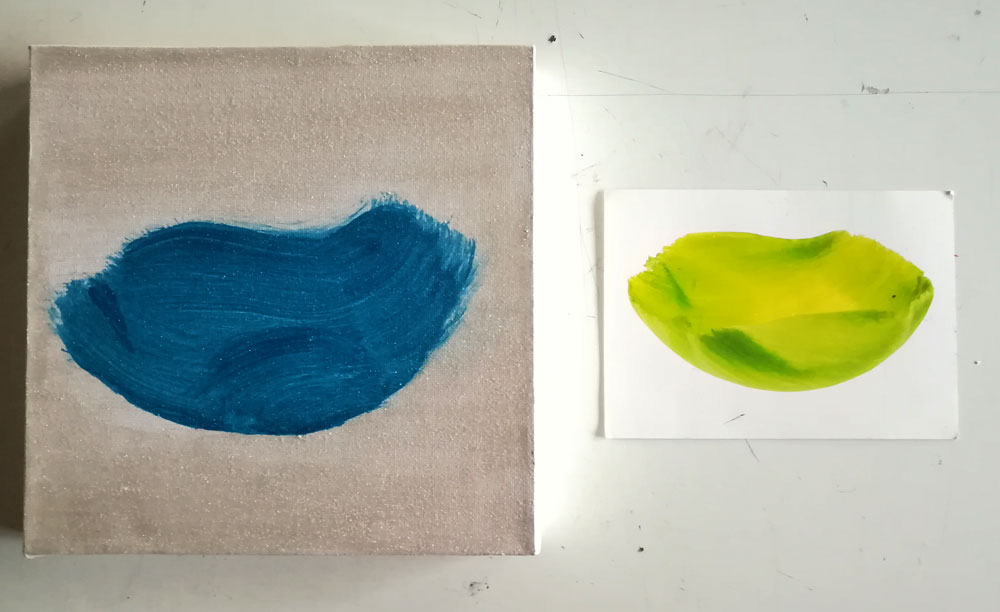 „Unsere Lieblingsaufgabenstellung war das „Postkartenprojekt“, bei dem wir uns drei Postkarten aussuchen durften, die jeweils berühmte Kunstwerke zeigten. Dazu sollten wir je 3 Neuinterpretationen gestalten. Inspiriert wurden wir dafür auf unserer Exkursion in die Kunsthalle Tübingen, wo in der Ausstellung „COMEBACK – Kunsthistorische Renaissance“ eine Vielzahl kunsthistorisch bekannter Werke neu interpretiert zu sehen waren. Diese waren dann eine Inspiration für unsere eigenen Arbeiten. Das Endergebnis musste jedoch keine offensichtliche Referenz zu dem Bild auf der Postkarte zeigen, sondern man sollte durch die Postkarte lediglich einen Gedanken- und Ideenanstoß bekommen. Auch die Wahl der Technik war uns freigestellt. Besonders an dieser Aufgabenstellung hat uns gefallen, dass man in seinem Arbeiten sehr frei war und dass man gleichzeitig auch berühmte Kunstwerke und Künstler*innen kennengelernt hat, da auch jeder von uns eine kurze Präsentation über die Künstler*in der jeweiligen Postkarte halten musste.“