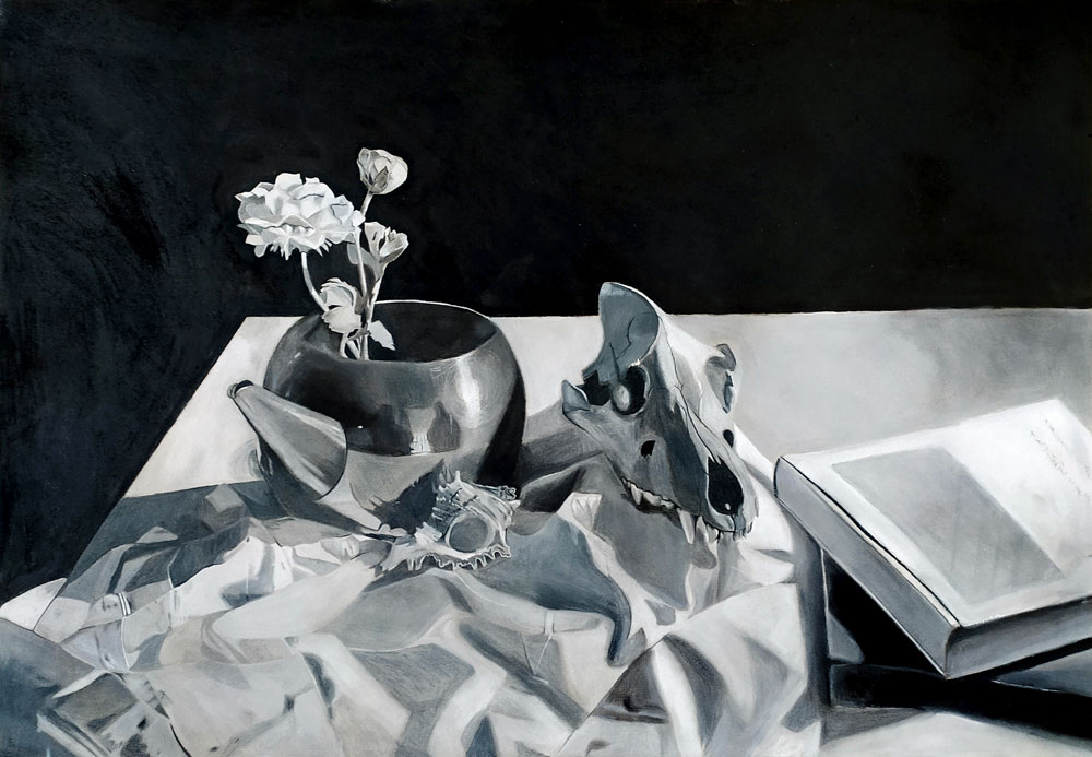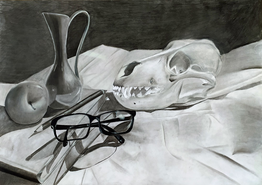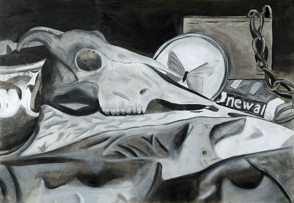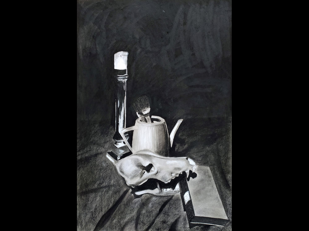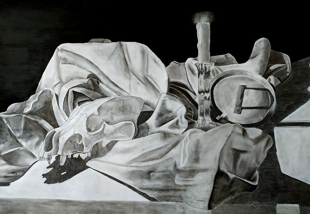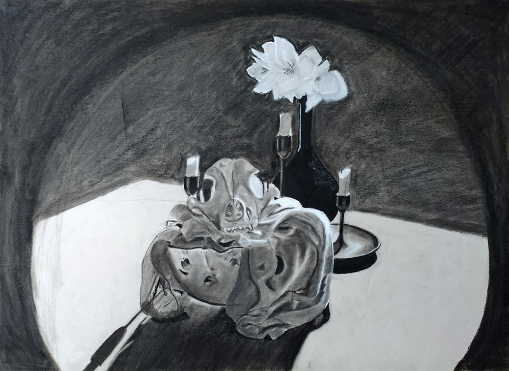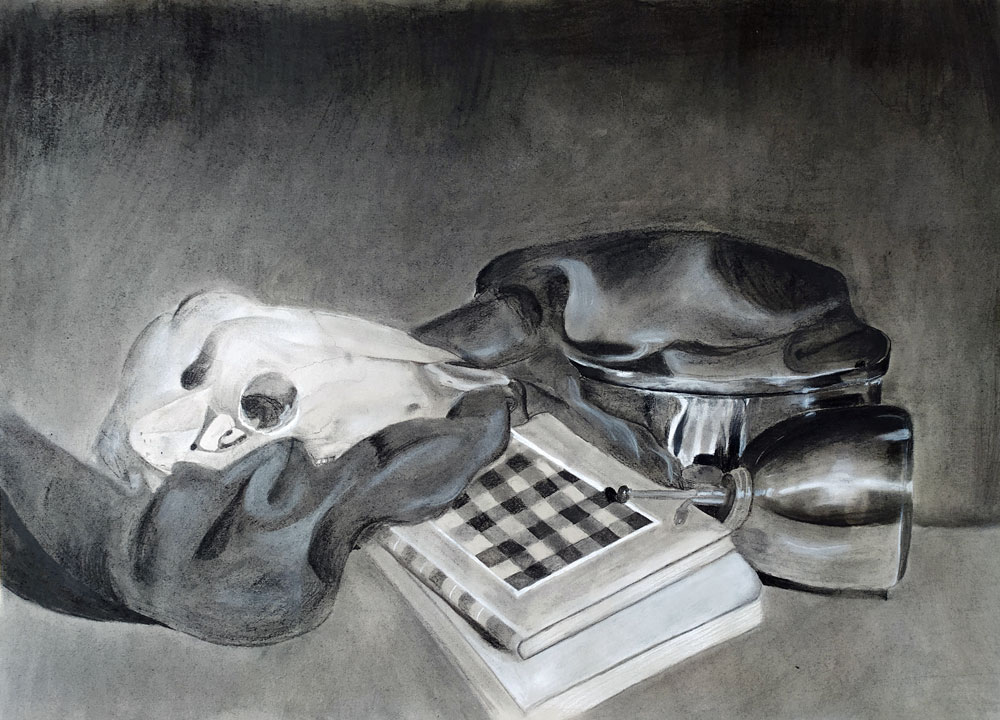 Im Stile barocker Vanitas-Stillleben und Prunkstillleben entstanden hier großformatige Kohlezeichnungen. Ähnlich zum Vorbild in Ölfarbe bildeten wir Objekte unterschiedlicher Textur und Form möglichst naturalistisch ab. Vorgegeben waren Schädel, Stoff und glänzende Gegenstände. Im Unterschied zu den Malereien des Niederländischen Barocks arbeiteten wir mit Zeichenkohle und Kreide. Wir ordneten zunächst die Gegenstände im Sinne unserer Komposition an, um sie dann zu fotografieren und abzubilden. Da die Technik für uns neu und das Format groß waren, brauchte es seine Zeit, im Unterricht und teilweise auch Zuhause.