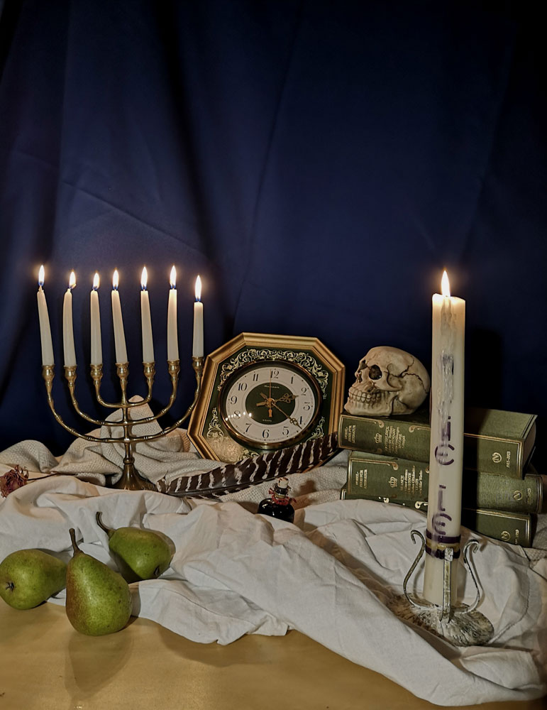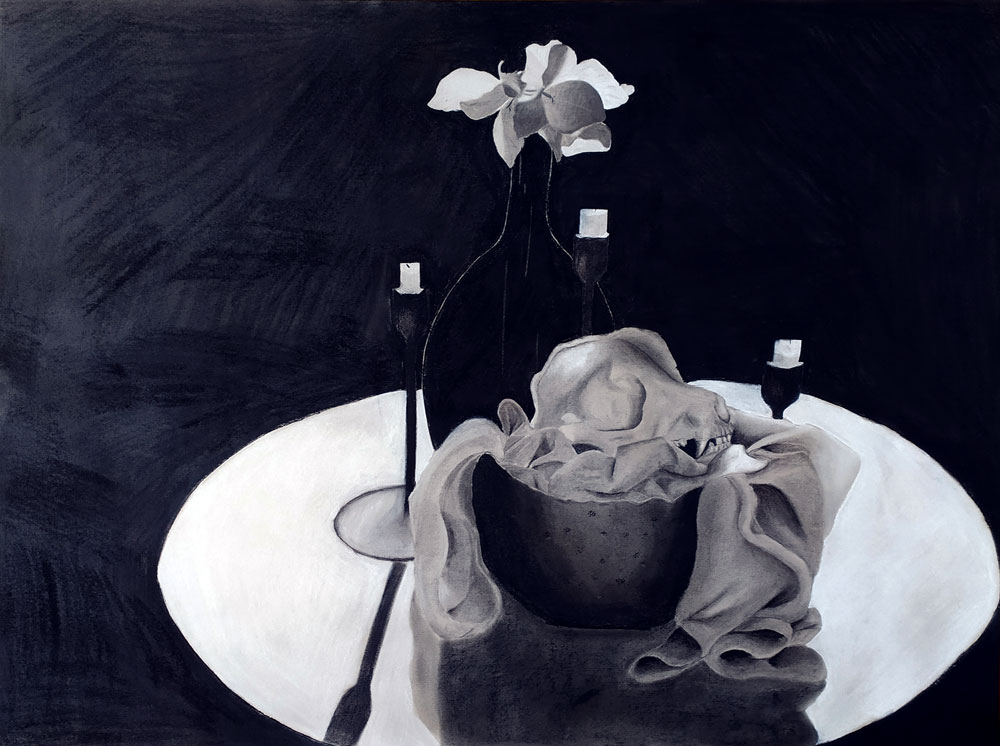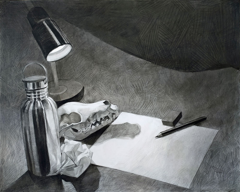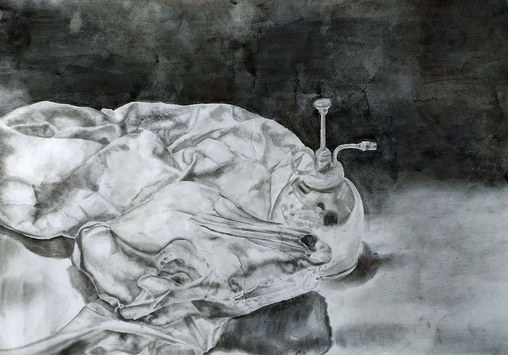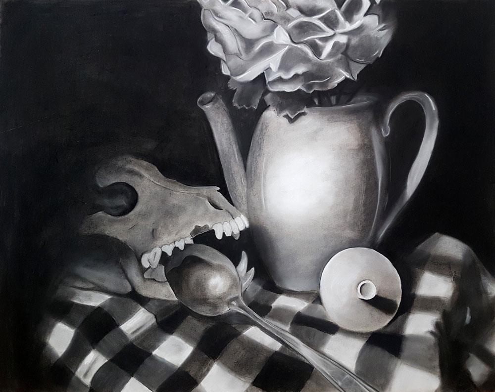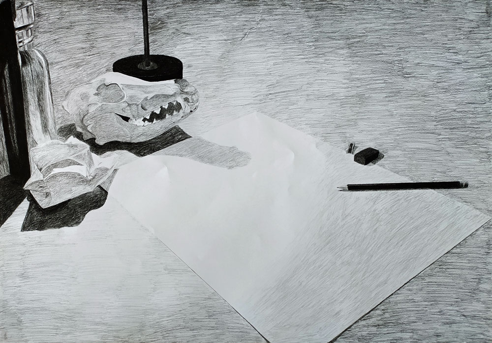 Im Stile barocker Vanitas-Stillleben und Prunkstillleben entstanden hier großformatige Kohlezeichnungen. Ähnlich zum Vorbild in Ölfarbe bildeten wir Objekte unterschiedlicher Textur und Form möglichst naturalistisch ab. Vorgegeben waren Schädel, Stoff und glänzende Gegenstände. Im Unterschied zu den Malereien des Niederländischen Barocks arbeiteten wir mit Zeichenkohle und Kreide. Wir ordneten zunächst die Gegenstände im Sinne unserer Komposition an, um sie dann zu fotografieren und abzubilden. Da die Technik für uns neu und das Format groß waren, brauchte es seine Zeit, im Unterricht und teilweise auch Zuhause.