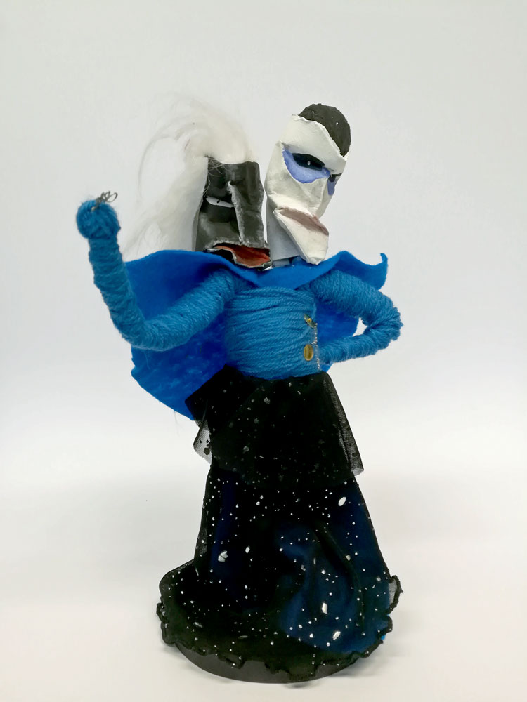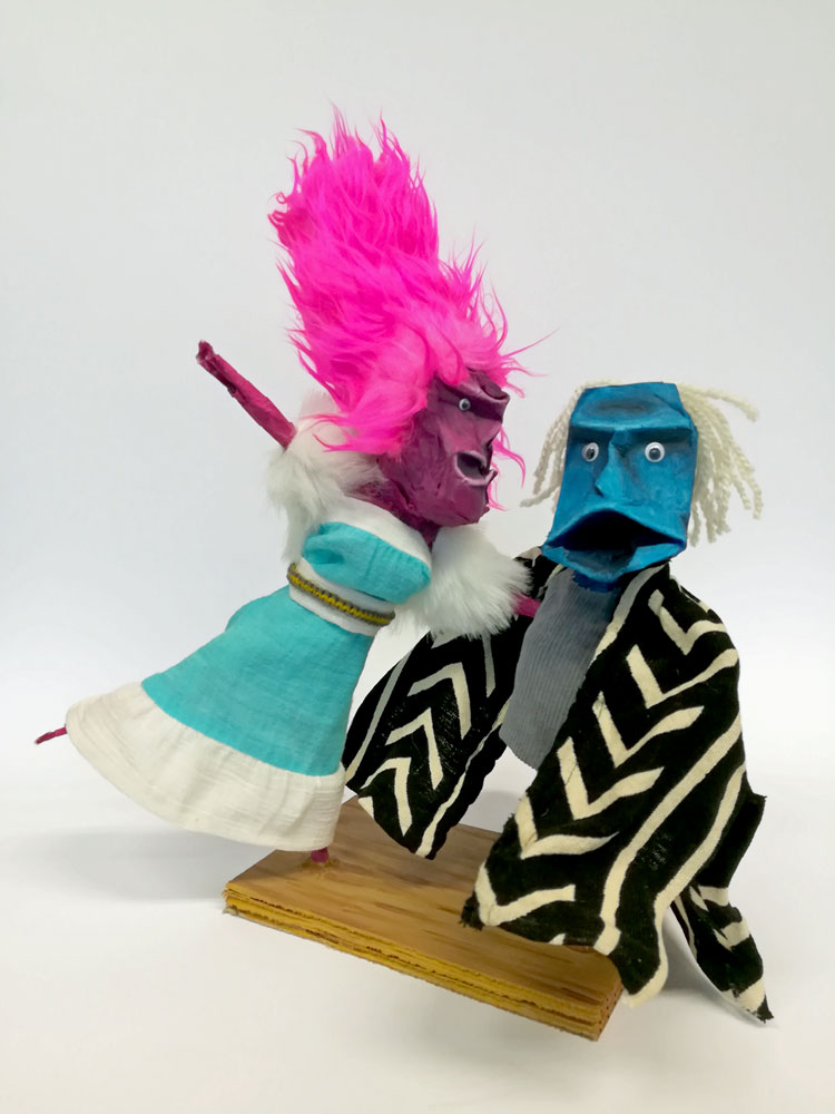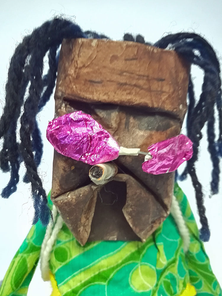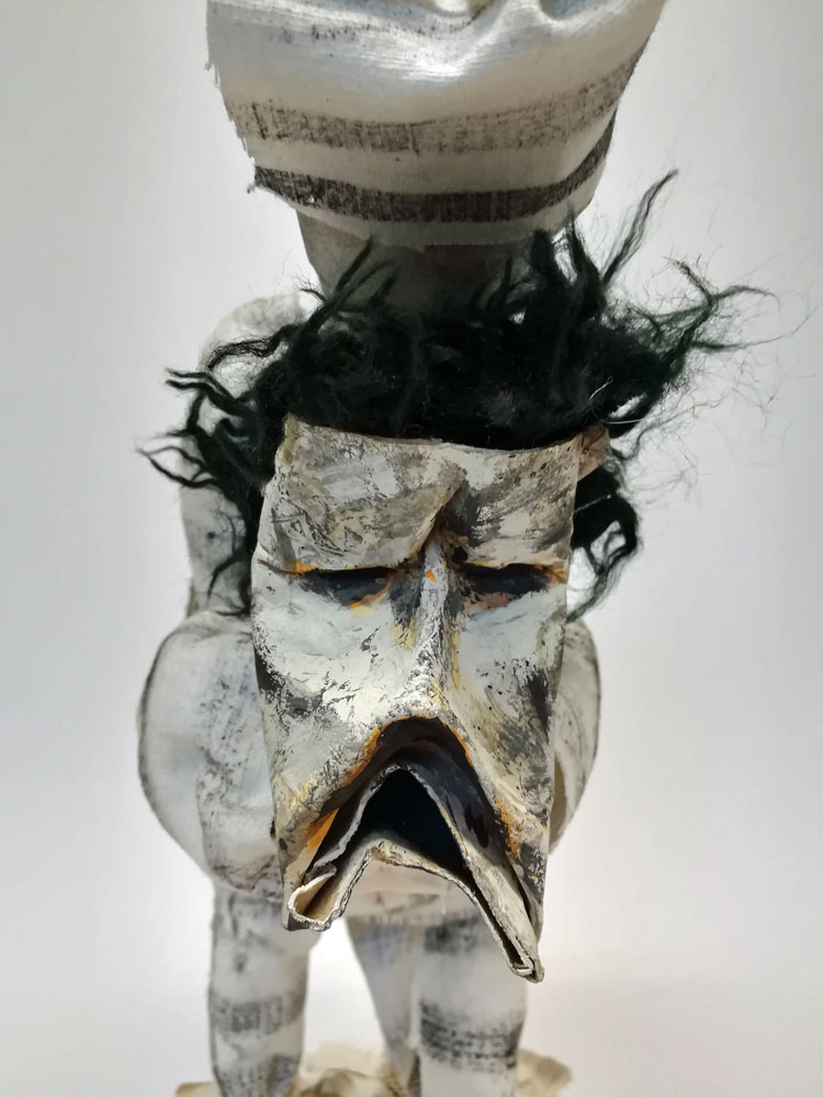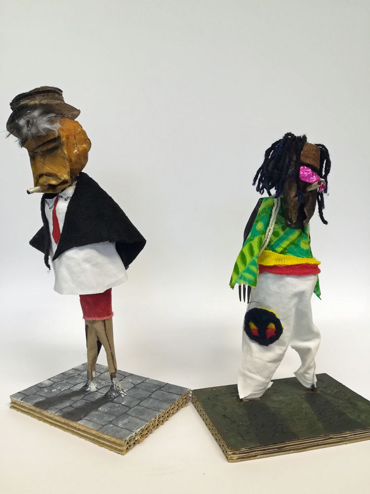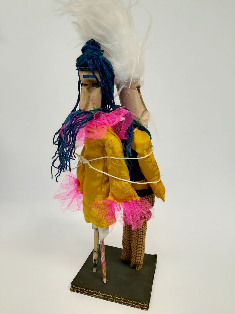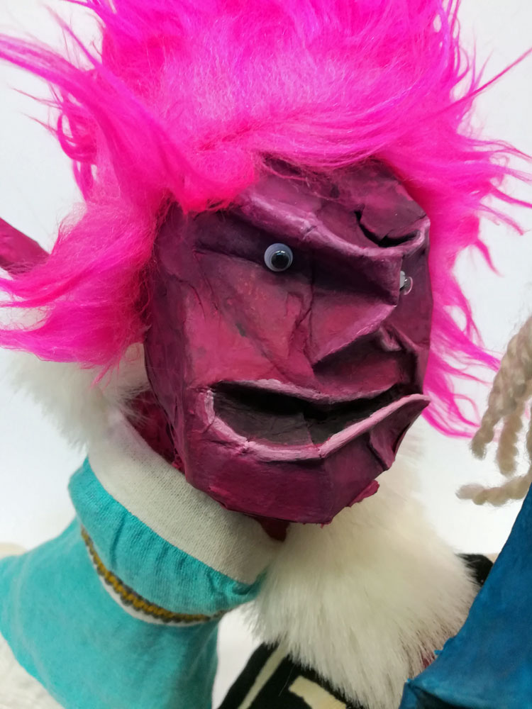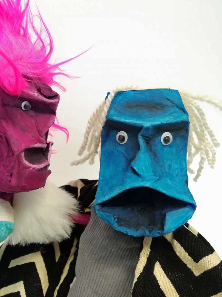 Der eigentliche Fokus bei dieser Aufgabenstellung lag auf den doppelköpfigen Gesichtern, welche aus Klopapierrollen gefaltet und anschließend mit ein wenig Farbe belebt wurden. Wir Schüler*innen haben jedoch, wie immer, unser eigenes Ding daraus gemacht und uns mehr auf das Kleidungsdesign aus alten upgecycelten Materialien fokussiert. Das war auch der amüsanteste Part der Aufgabe, da es da auf unsere individuelle Kreativität ankam und wir die Freiheit hatten, eigene Designs zu kreieren. Nachdem wir unsere Skulpturen fertiggestellt hatten, zeichneten wir mit Kohle eine comicartige Serie über unsere Frenemies.