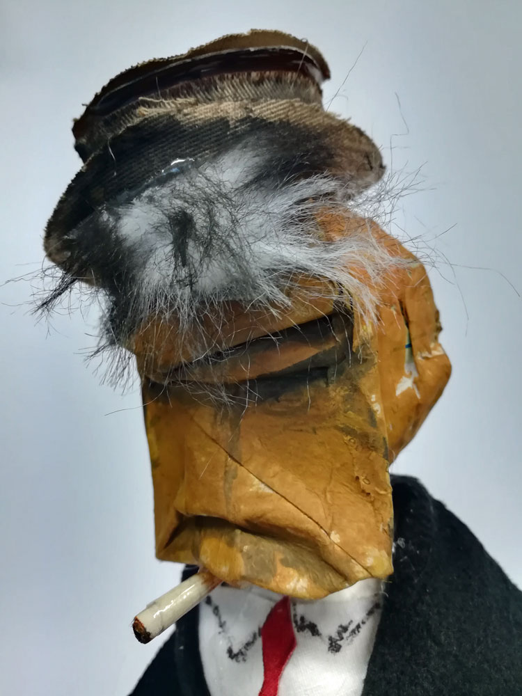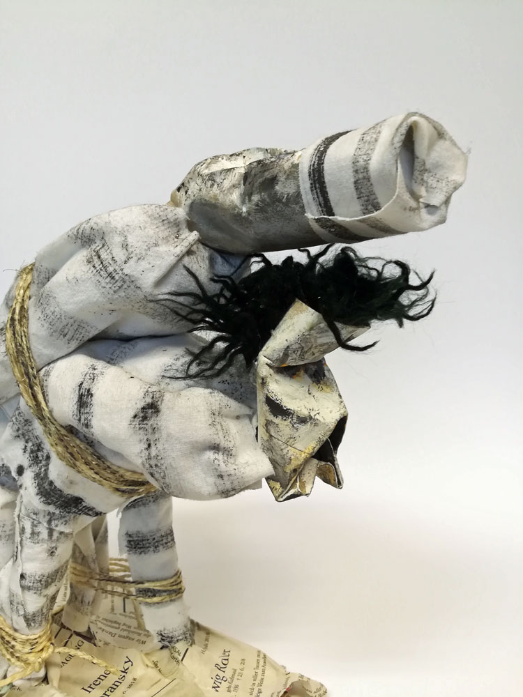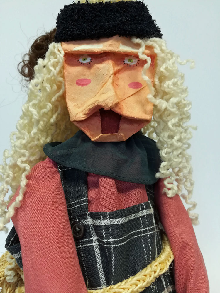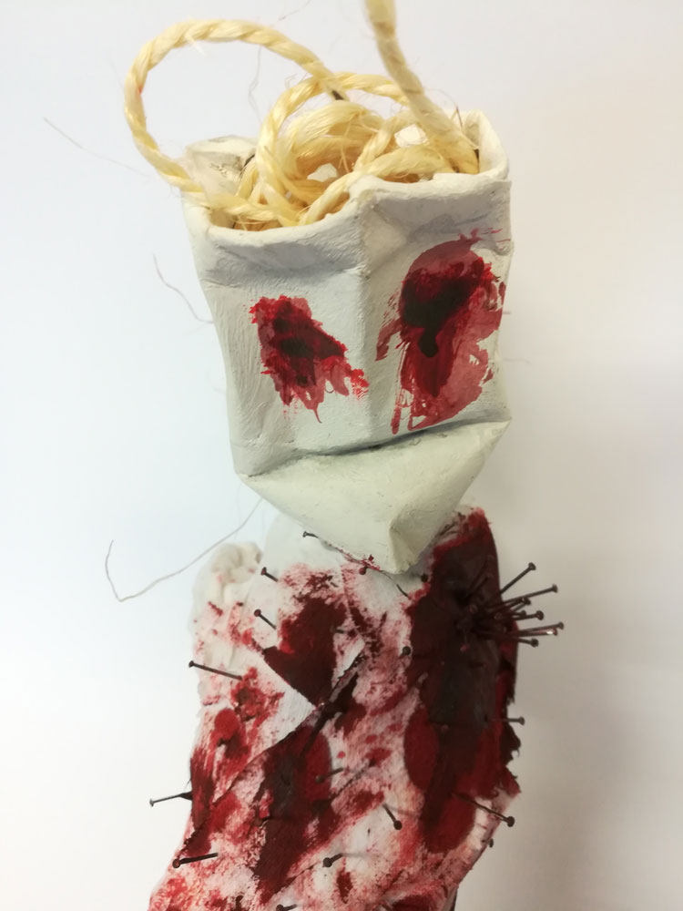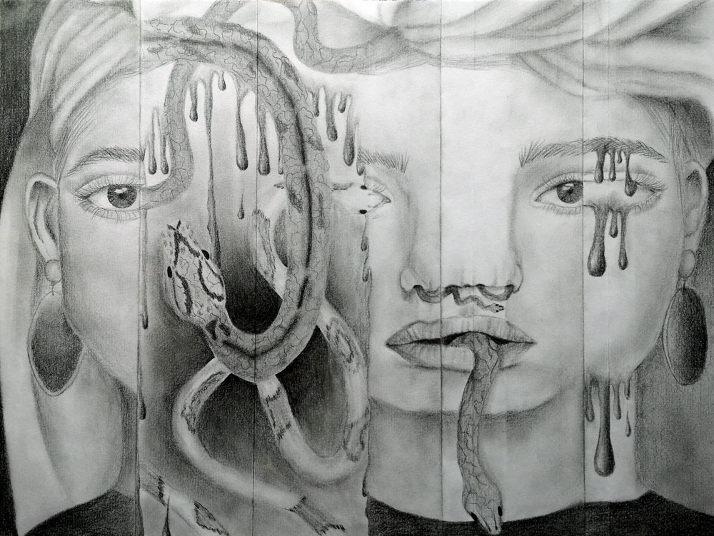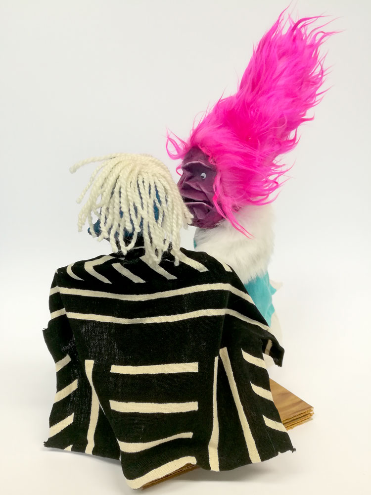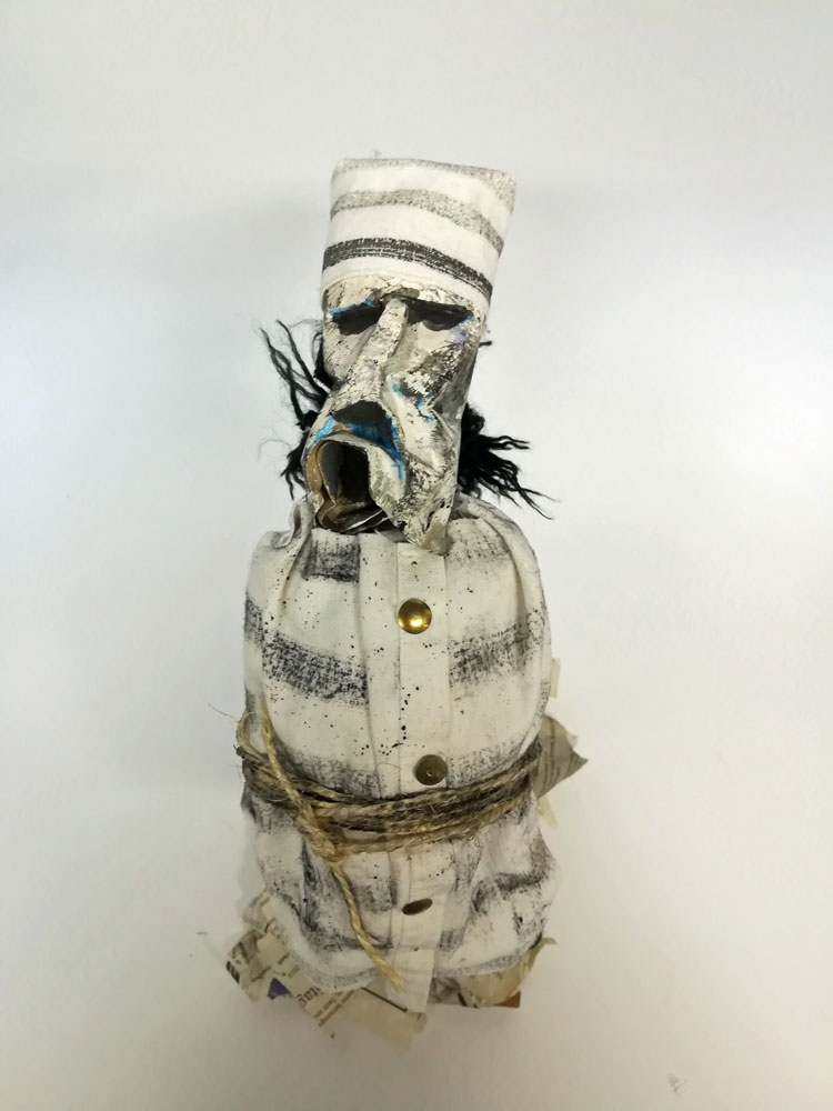 Der eigentliche Fokus bei dieser Aufgabenstellung lag auf den doppelköpfigen Gesichtern, welche aus Klopapierrollen gefaltet und anschließend mit ein wenig Farbe belebt wurden. Wir Schüler*innen haben jedoch, wie immer, unser eigenes Ding daraus gemacht und uns mehr auf das Kleidungsdesign aus alten upgecycelten Materialien fokussiert. Das war auch der amüsanteste Part der Aufgabe, da es da auf unsere individuelle Kreativität ankam und wir die Freiheit hatten, eigene Designs zu kreieren. Nachdem wir unsere Skulpturen fertiggestellt hatten, zeichneten wir mit Kohle eine comicartige Serie über unsere Frenemies.