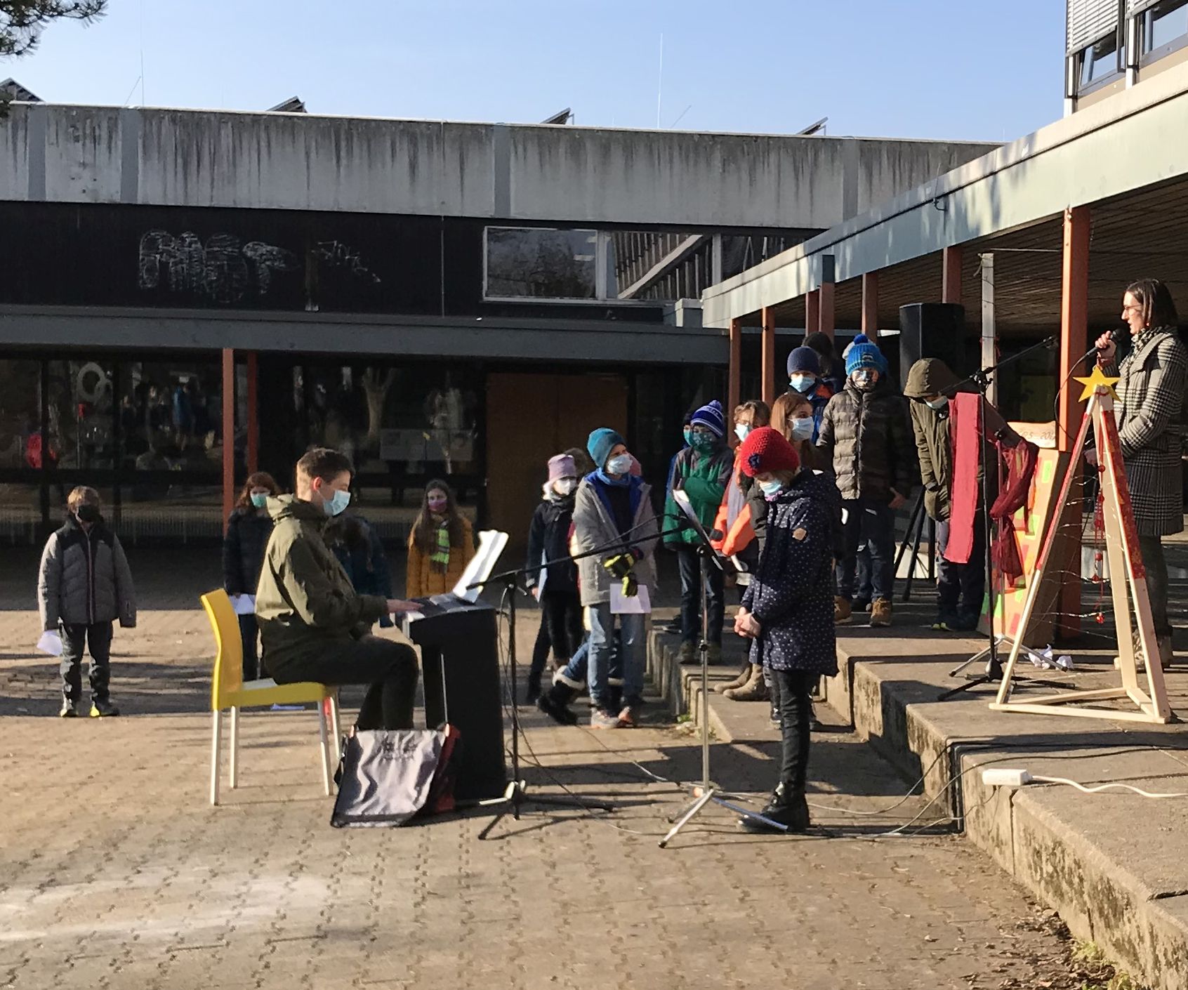 Wir wünschen allen Schüler*innen, Lehrer*innen und weiteren Mitarbeiter*innen und ihren Familien ein entspanntes und erholsames Weihnachtsfest und einen guten Rutsch ins neue Jahr! Trotz der erschwerten Bedingungen konnten noch verschiedene Aktionen im Advent stattfinden. Am letzten Schultag gab es im Freien noch eine kleine Andacht, die von Frau Dr. Kudella gestaltet und von Herrn Erhard und unserem Unterstufenchor musikalisch begleitet wurde.
