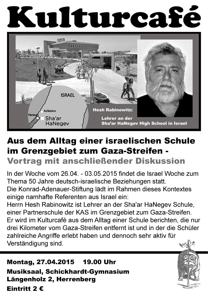 Herrn Hesh Rabinowitz ist Lehrer an der Sha’ar HaNegev Schule, einer Partnerschule der KAS im Grenzgebiet zum Gaza-Streifen. Er wird im Kulturcafé aus dem Alltag einer Schule berichten, die nur drei Kilometer vom Gaza-Streifen entfernt ist und in der die Schüler zahlreiche Angriffe erlebt haben und dennoch sehr aktiv für Verständigung sind.