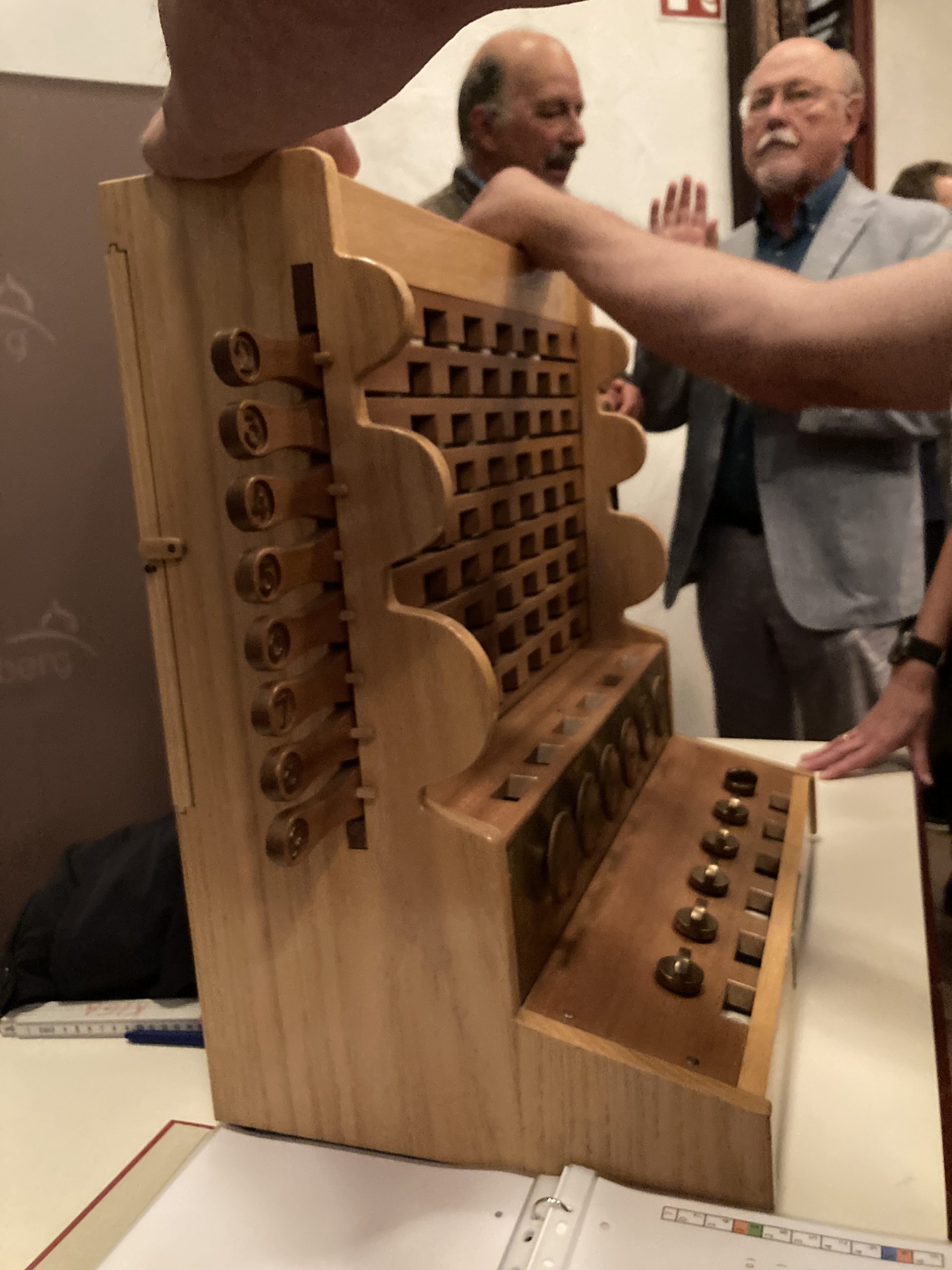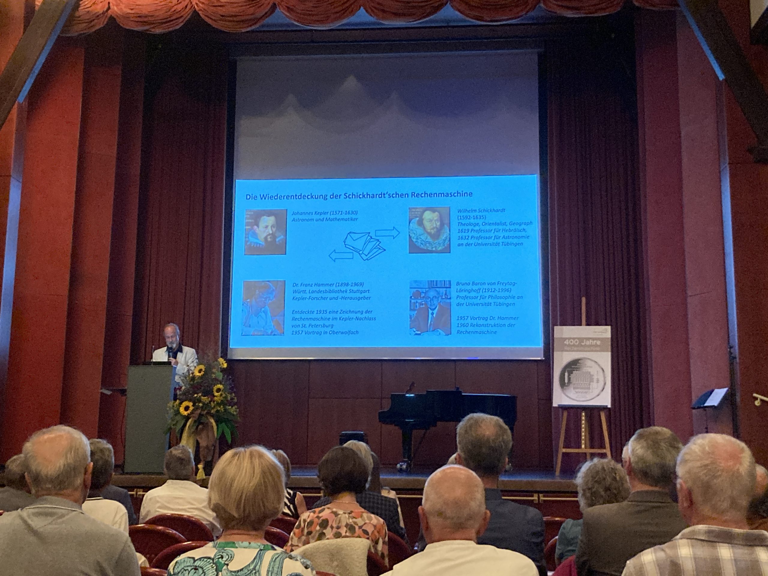 Zwischendurch gab es verschiedene offizielle Ansprachen. Es folgte ein Vortrag von Hansjörg Fromm vom Karlsruher Institut für Technologie, der den Gästen die Bedeutung und Wiederentdeckung der Rechenmaschine und die familiären Zusammenhänge der verschiedenen Schickhardts bildhaft näherbrachte.