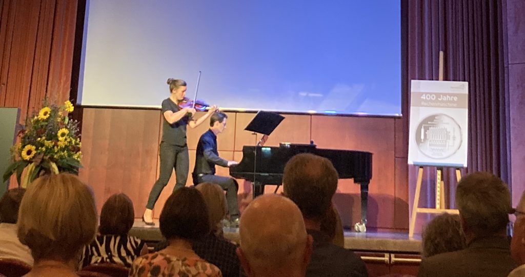 Die beiden Musiklehrer Miriam Klüglich und Patrick Erhard rundeten die Veranstaltung virtuos und mit viel Gefühl mit dem 1. Satz der Frühlingssonate für Violine und Klavier von Ludwig van Beethoven ab.