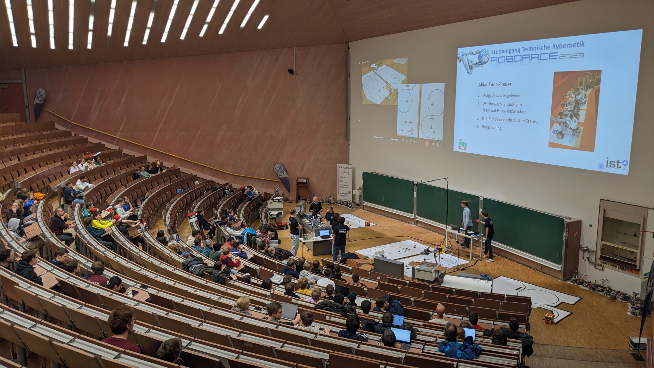 Das „Roborace“ ist ein Robotik-Wettbewerb, der von der Universität Stuttgart ausgerichtet wird und sich an Schüler*innen und Studierende gleichermaßen richtet. Die Teilnehmenden werden jedes Jahr mit einer neuen Aufgabe aus dem Bereich der Technischen Kybernetik herausgefordert. Nach der Startveranstaltung, bei der die Aufgabe bekannt gegeben wird, haben die Teilnehmenden etwa vier Wochen Zeit, in Teamarbeit auf Basis des LEGO-Mindstorms-EV3-Systems einen Roboter zu konstruieren, der die Aufgabe auf autonome Weise löst. Bei erfolgreicher Bewältigung der Qualifikations- und Vorrunde qualifizieren sich die besten Teams für das große Finale.