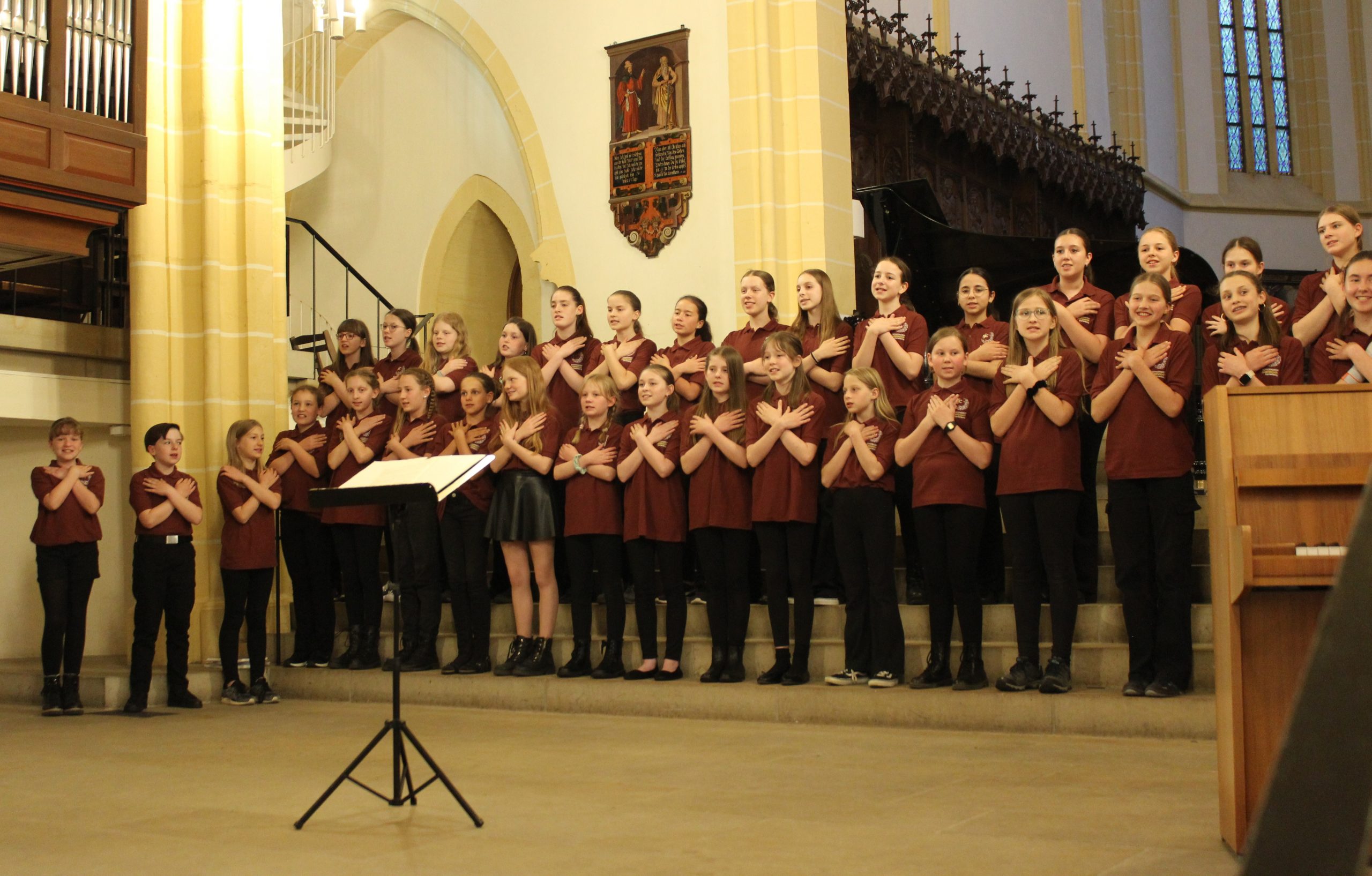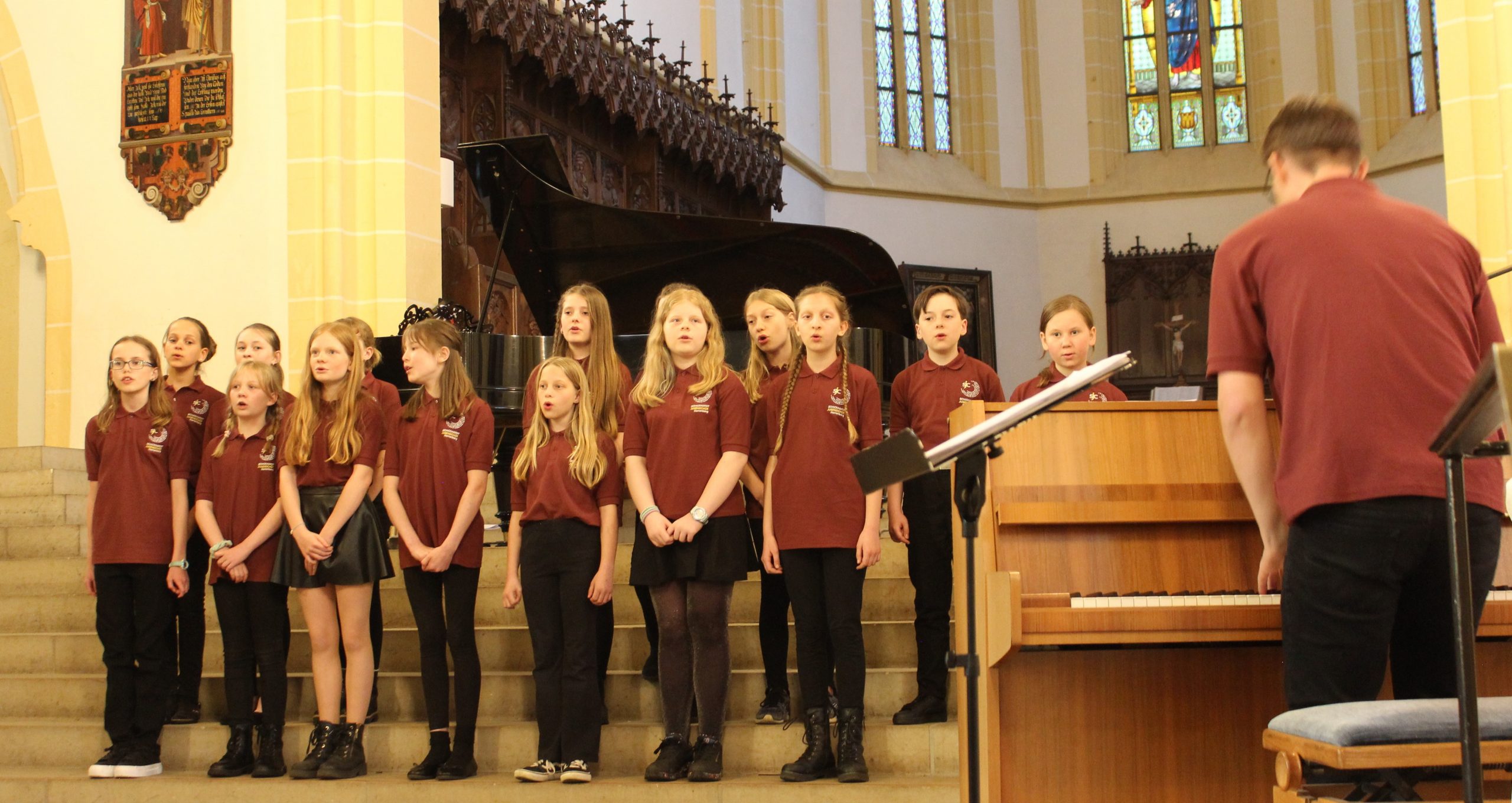 Nach der Begrüßung durch Christa Feige legten alle Chöre gemeinsam mit „Kyrie und Gloria“ von Leo Delibes einen schwungvollen Einstieg in das Konzert hin. Am Klavier begleitete Johannes Fiedler, der Kantor der Stiftskirche, alle Chöre. Als zweites Stück präsentierte die Kinderkantorei „Cantate Domino“ von Roger Emerson bevor die Jugendkantorei und das Junge Ensemble sie bei fünf Stücken von Felix Mendelssohn unterstützten. „Ubi caritas et amor“ von Audrey Snyder und „Lord, I stretch my hands to you” von Jay Althouse beschlossen den ersten Teil.