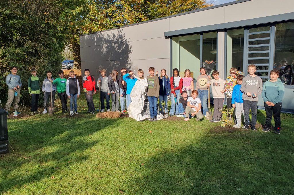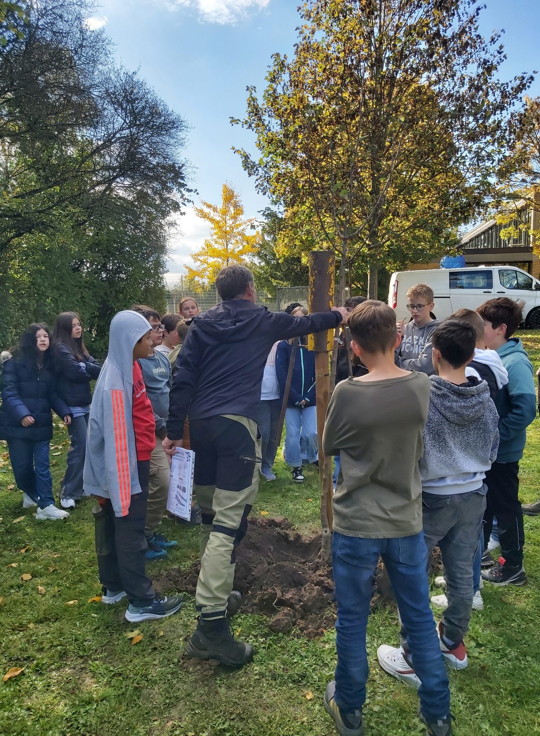 Hast du dich schon einmal gefragt, wie viele verschiedene Apfelsorten es weltweit gibt? Worauf man beim Pflanzen und Schneiden von Bäumen achten sollte? Oder wie viele Bäume auf dem Schulgelände stehen? Auf diese und viele weitere Fragen bekam die Klasse 6a am Mittwoch, den 23.10.2024 Antworten von Klaus Lüth. Herr Lüth ist Mitarbeiter des Amtes für Technik und Grün der Stadt Herrenberg und kümmert sich unter anderem um die Bäume auf unserem Schulgelände und auf vielen weiteren Grünflächen der Stadt Herrenberg. Die Schüler*innen der Klasse 6a und ihre Lehrkräfte Herr Geitz und Frau Friedrich unterstützten Herrn Lüth beim Pflanzen von zwei neuen Bäumen, einem Apfelbaum (Pinova) und einer Birne (Conference). Darüber hinaus legten die jungen Gärtner*innen einen Naschgarten mit verschiedenen Beerensträuchern neben den bestehenden Hochbeeten an. Der Naschgarten umfasst eine Stachelbeere sowie rote, schwarze und weiße Johannisbeeren. Wir hoffen, dass die Sträucher und Bäume gut wachsen und die Schulgemeinschaft in den kommenden Jahren mit ihren Früchten erfreuen werden. Ach ja, weltweit gibt es etwa 30 000 verschiedene Apfelsorten und auf unserem Schulgelände stehen etwa 80 Bäume und Sträucher, die regelmäßig von Herrn Lüth und seinem Team kontrolliert und gepflegt werden.