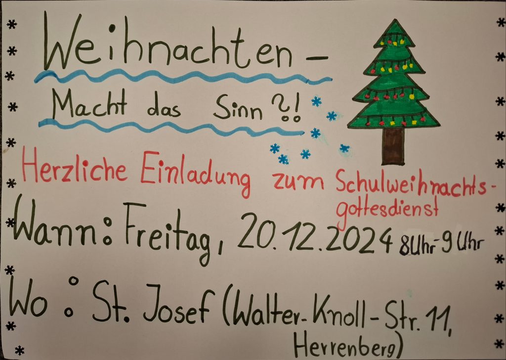 Letzter Schultag vor den Ferien 17. Dezember 202410. Dezember 2024 Redaktion Schulhomepage Am Freitag, den 20. 12. 24 endet der Unterricht für alle Klassen um 11:10 Uhr. In den ersten beiden Stunden findet der Weihnachtsgottesdienst in der Kirche St. Josef statt, anschließend eine Klassenlehrerstunde. Allgemein