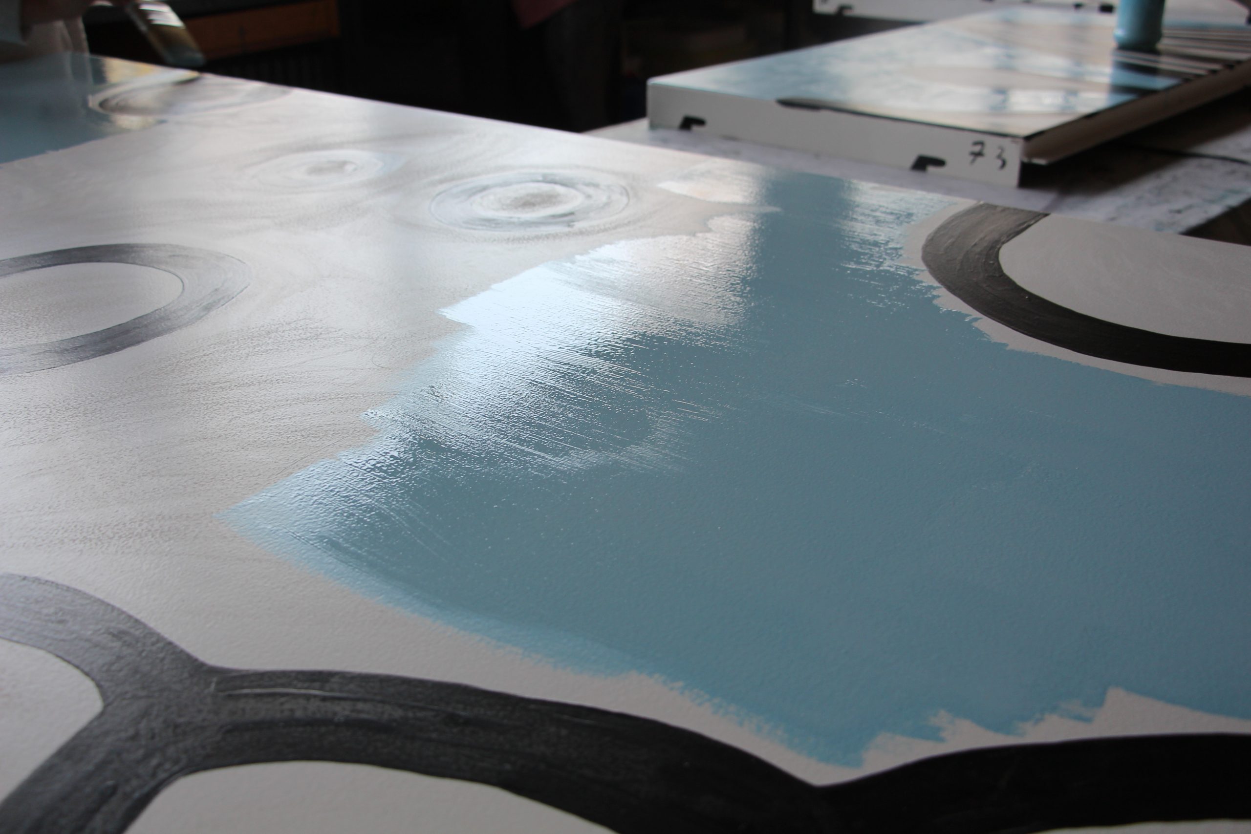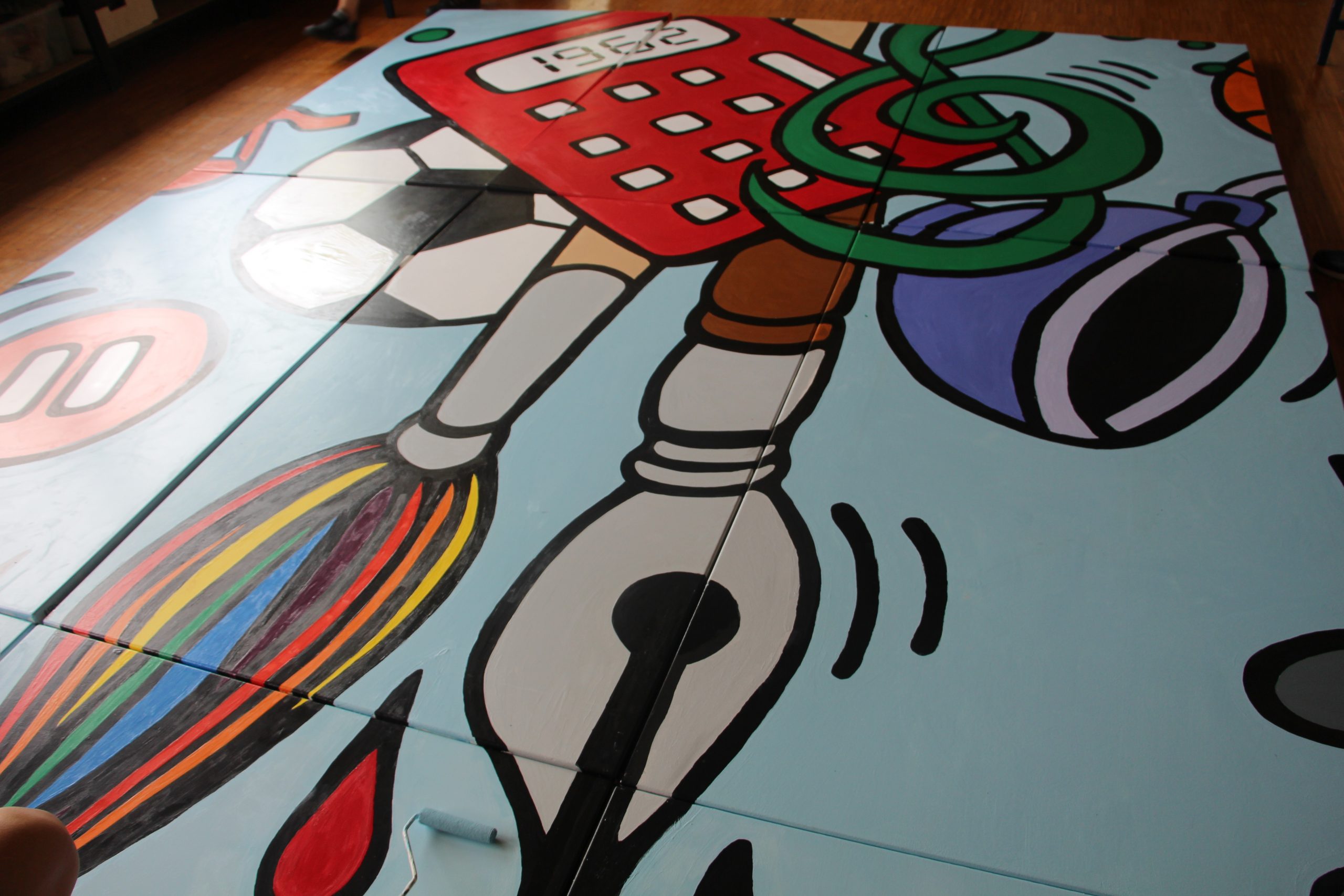 Eine besondere Herausforderung bei der Erstellung der Entwürfe und auch der Übertragung des Motivs war die schiere Größe der zu bemalenden Fläche. Jede der 80 Platten misst 1,75 m x 1,10 m, das komplette Motiv ist 11,39 m hoch und 10,90 m breit. Der Originalentwurf musste daher auch noch einmal komplett überarbeitet werden, damit auch alle Feinheiten und Details auch in der Größe gut zur Geltung kommen und alle Linien und Perspektiven stimmig sind. Diese Aufgabe hatte Danielle Zimmermann übernommen.