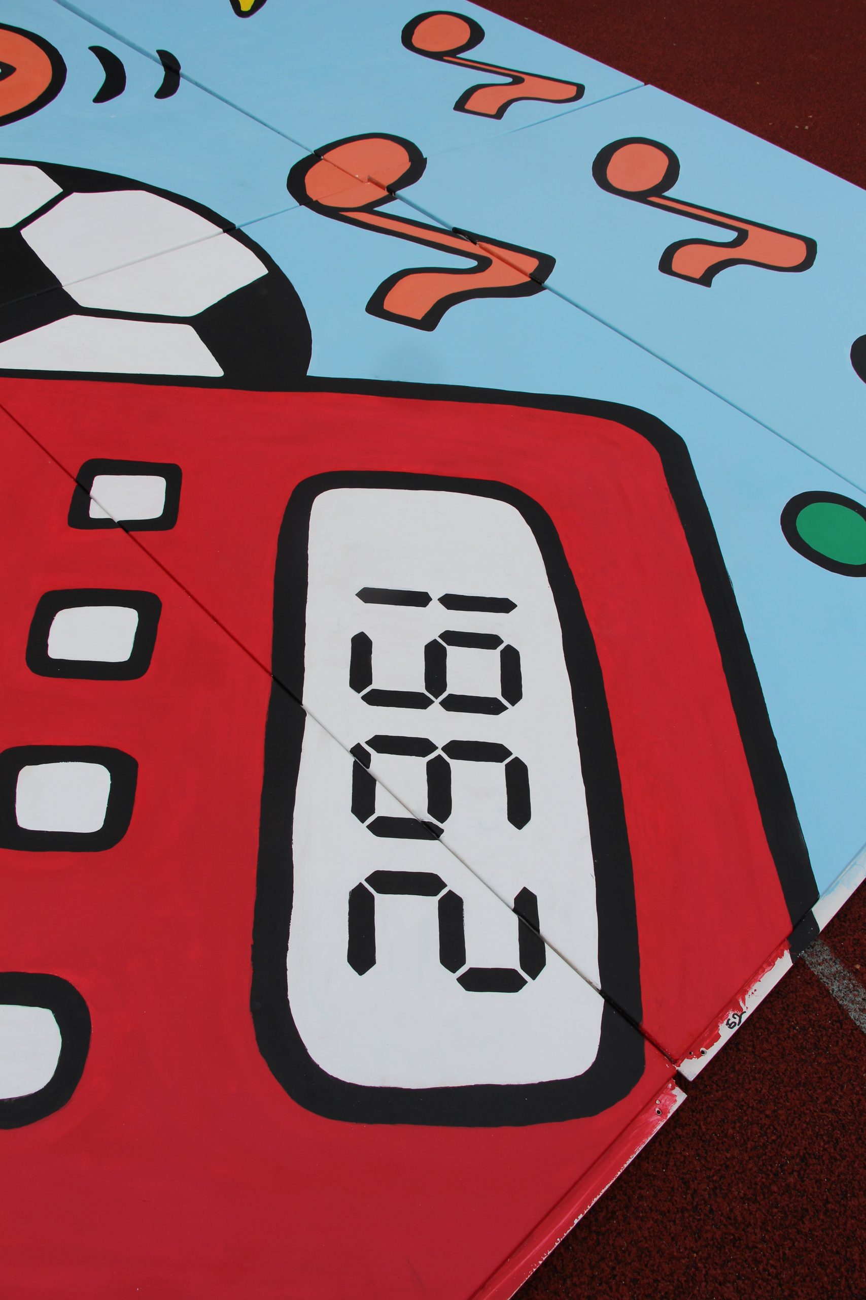 Das alte Motiv sollte aber nicht einfach nur aufgefrischt werden, nein. Es wurde nach einem ganz neuen Bild gesucht, das die Schulgemeinschaft heute repräsentiert. Alle Schülerinnen und Schüler, die zu diesem Zeitpunkt das Schickhardt besuchten, haben im Rahmen des BK- Unterrichts als Monatszeichnung einen Entwurf für die Neugestaltung der Fassade eingereicht. Grundlage für die Entwürfe war ein detailliertes Raster, an dem sich die Schülerinnen und Schüler orientieren konnten. Es folgte eine klasseninterne Abstimmung und am Ende wählte die gesamte Schulgemeinschaft aus den 37 besten Entwürfen über eine Onlineabstimmung ihren Favoriten. Wichtig war bei der Entscheidung, dass das Motiv die Schule und alle Menschen, die in ihr ein- und ausgehen repräsentiert, aber auch, dass es technisch umsetzbar ist. Der Entwurf, der mit Abstand die meisten Stimmen bekam, wurde von Tim Berger erstellt, der damals in der 9. Klasse war. Sein Bild zeigt zentral den als Graffiti gestalteten Schriftzug SGH umgeben von Symbolen für die einzelnen Schulfächer. Und auch der ikonische Schickhardt- Kopf als Logo der Schule darf natürlich nicht fehlen. Dieser wurde auf Wunsch der Freunde und der Schulgemeinschaft dem ursprünglichen Entwurf noch hinzugefügt. Besonders überzeugte Tims Entwurf, da er die Schule in ihrer Gesamtheit am besten widerspiegelt und eine zeitlose Ästhetik mit eindrucksvoller Fernwirkung bietet.