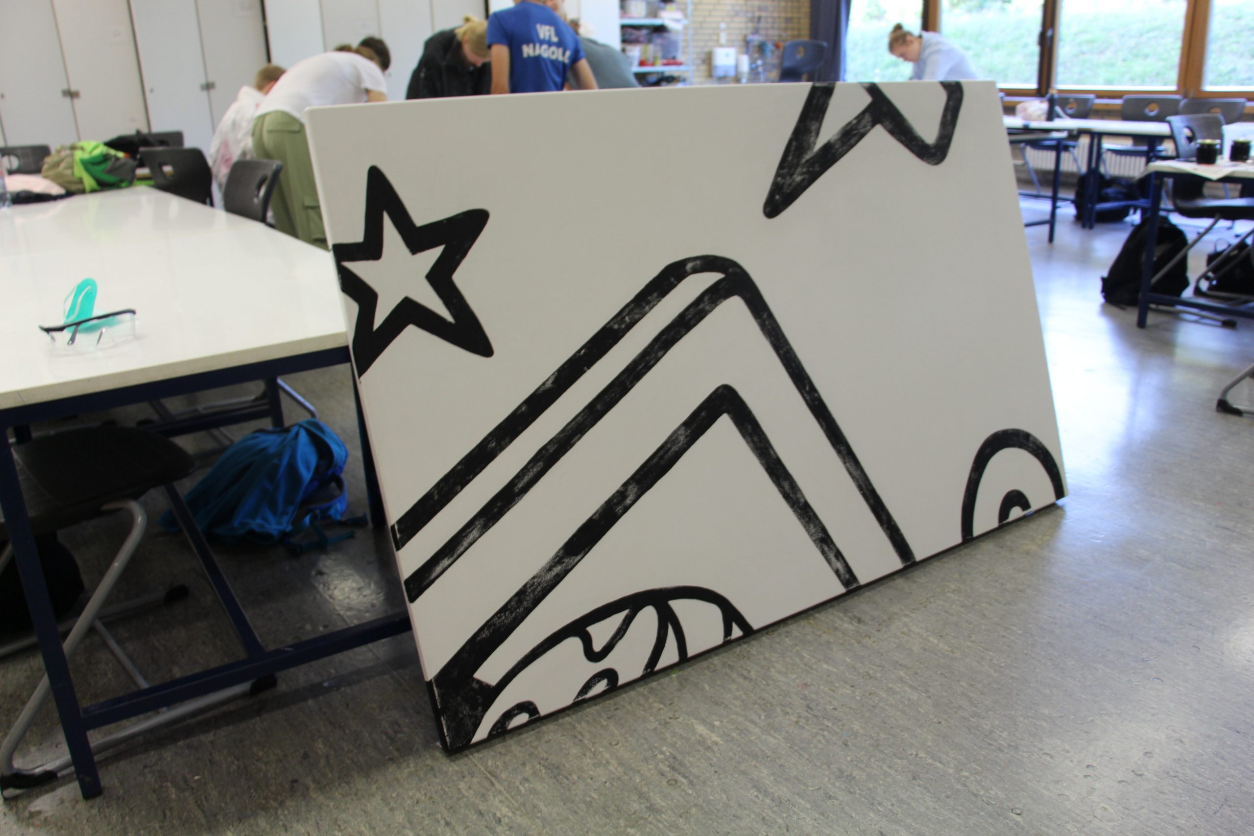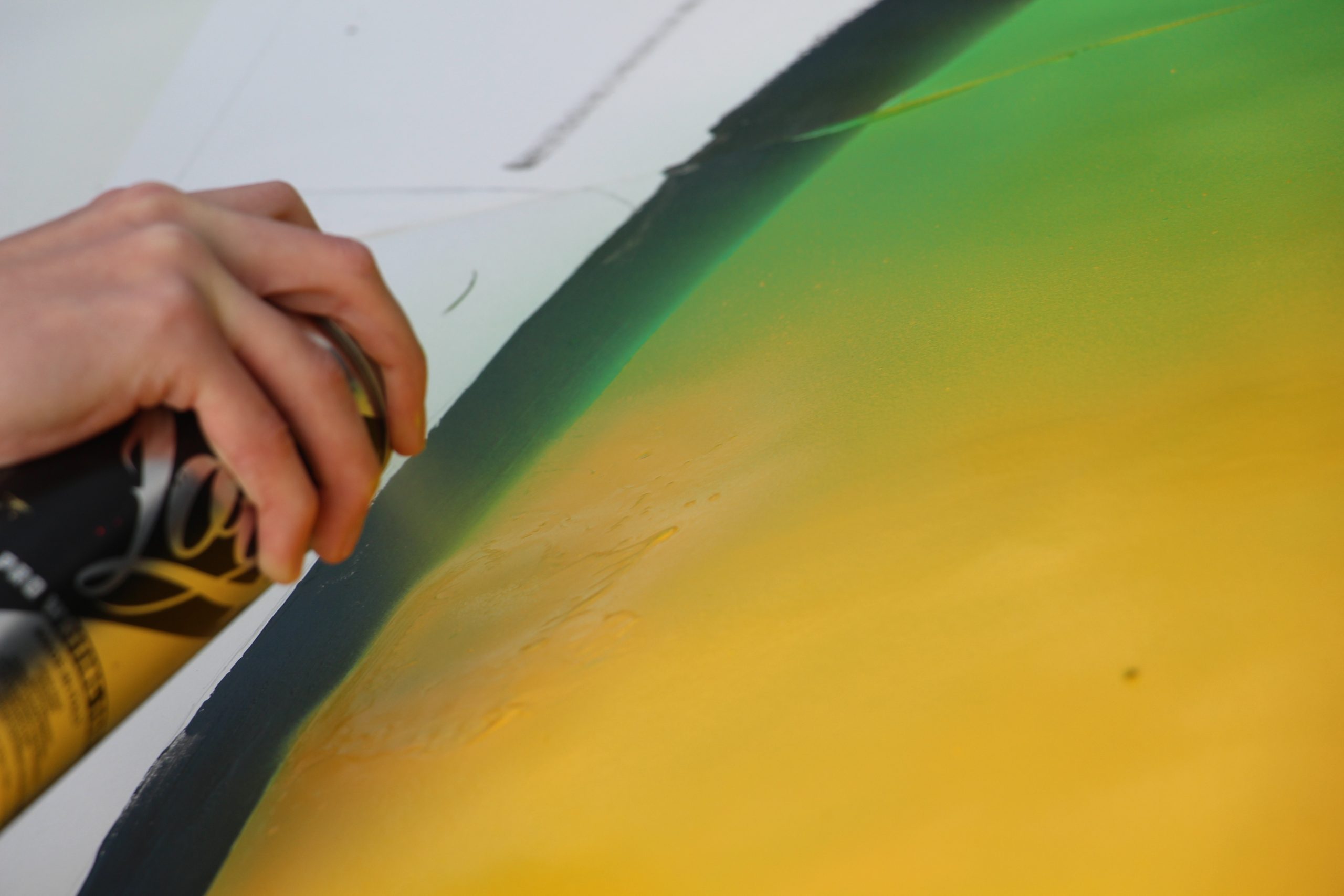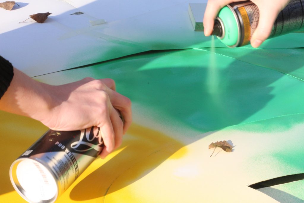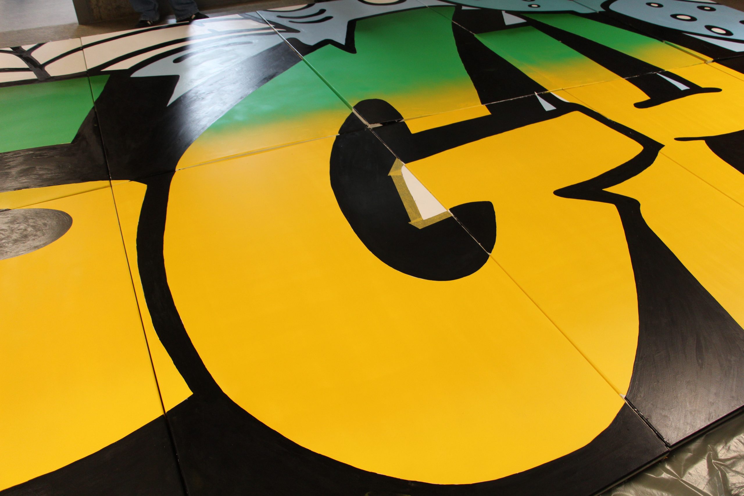 Den krönenden Abschluss bildete das Erstellen des SGH- Schriftzugs in Graffiti- Technik. Dazu wurden alle Platten, auf denen der Schriftzug zu sehen war, entlang der Buchstaben abgeklebt und besprüht. So konnte ein stufenloser Farbübergang innerhalb der Buchstaben erreicht werden.