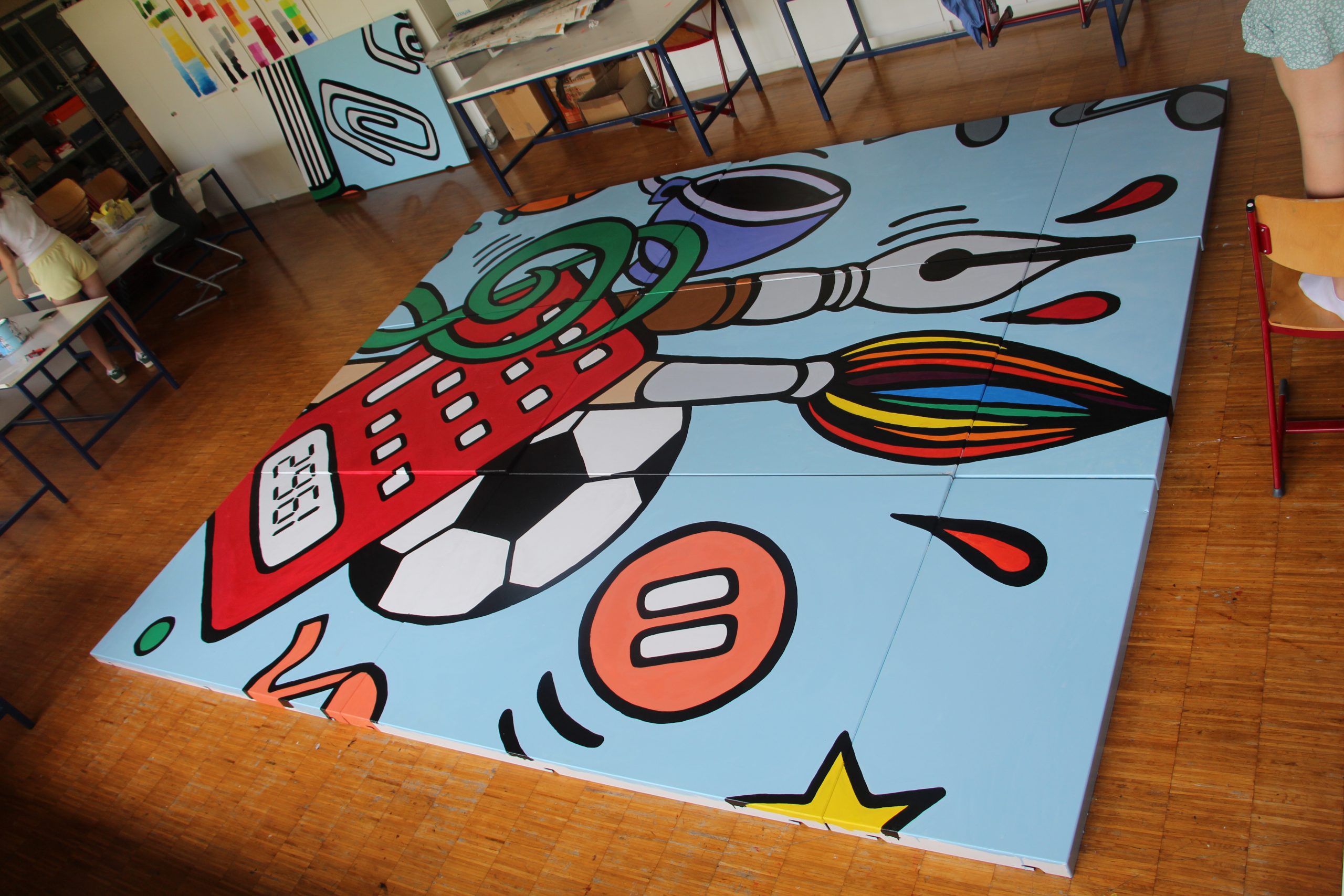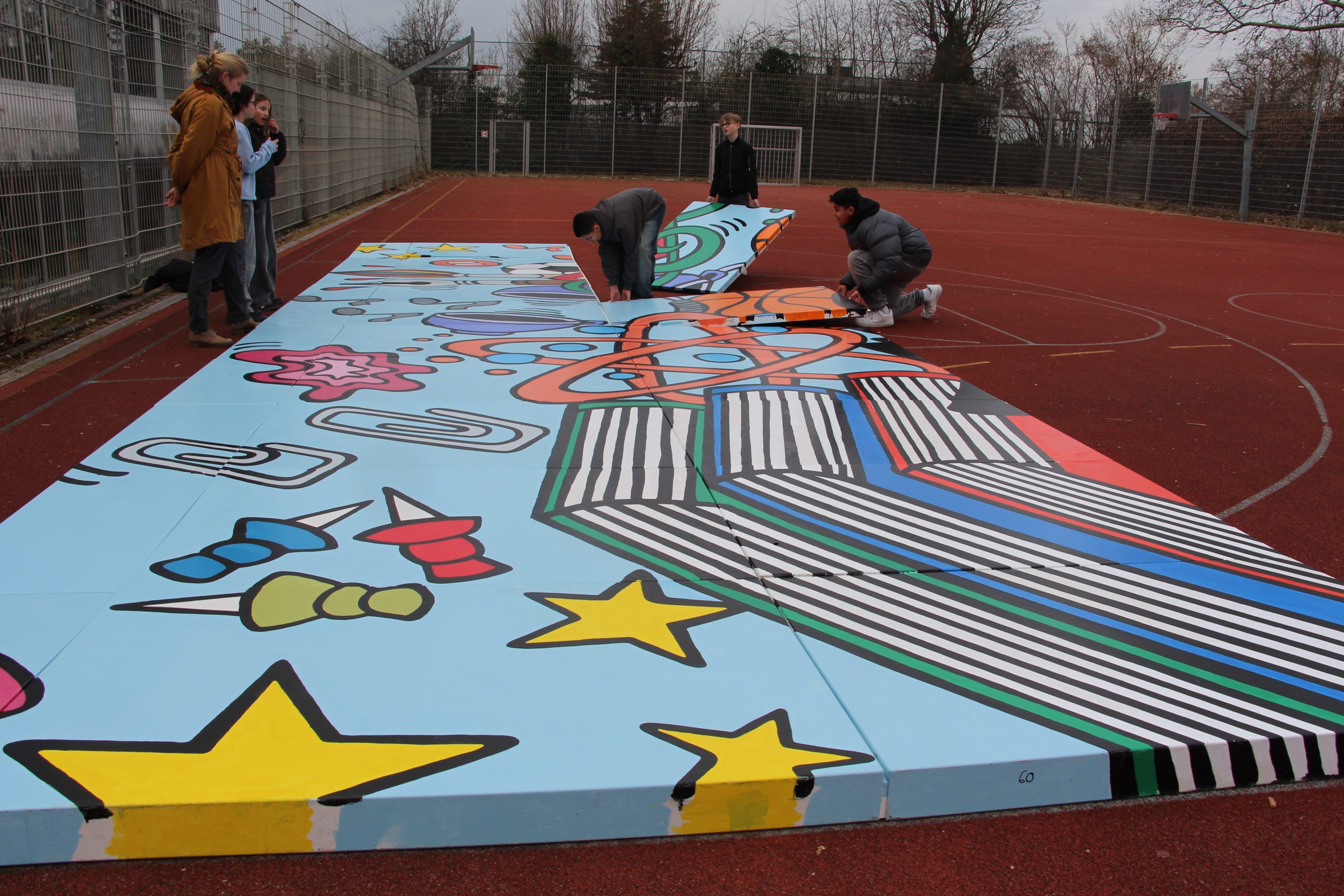 Über 150 Schülerinnen und Schüler aus den Klassenstufen 5- 12 arbeiteten in wechselnden Besetzungen jede Woche vier Stunden über zweieinhalb Schuljahre hinweg an der Übertragung des Motivs, auch an den Projekttagen wurde fleißig gemalt und immer wieder überprüft, ob das Motiv auf den Platten zusammenpasst. Bei den Projekttagen im Juli 2023 kam es zum ersten Test: die Platten wurden auf dem Schulhof aneinandergelegt und alle Umrisse passten wunderbar! Es folgte der nächste Schritt: die Auswahl der Farben und das Ausmalen der Outlines. Die Farben wurden ebenfalls von den Freunden des Schickhardt- Gymnasiums finanziert. Insgesamt hat sich der Förderverein das Projekt bis dahin 25.000 Euro kosten lassen.