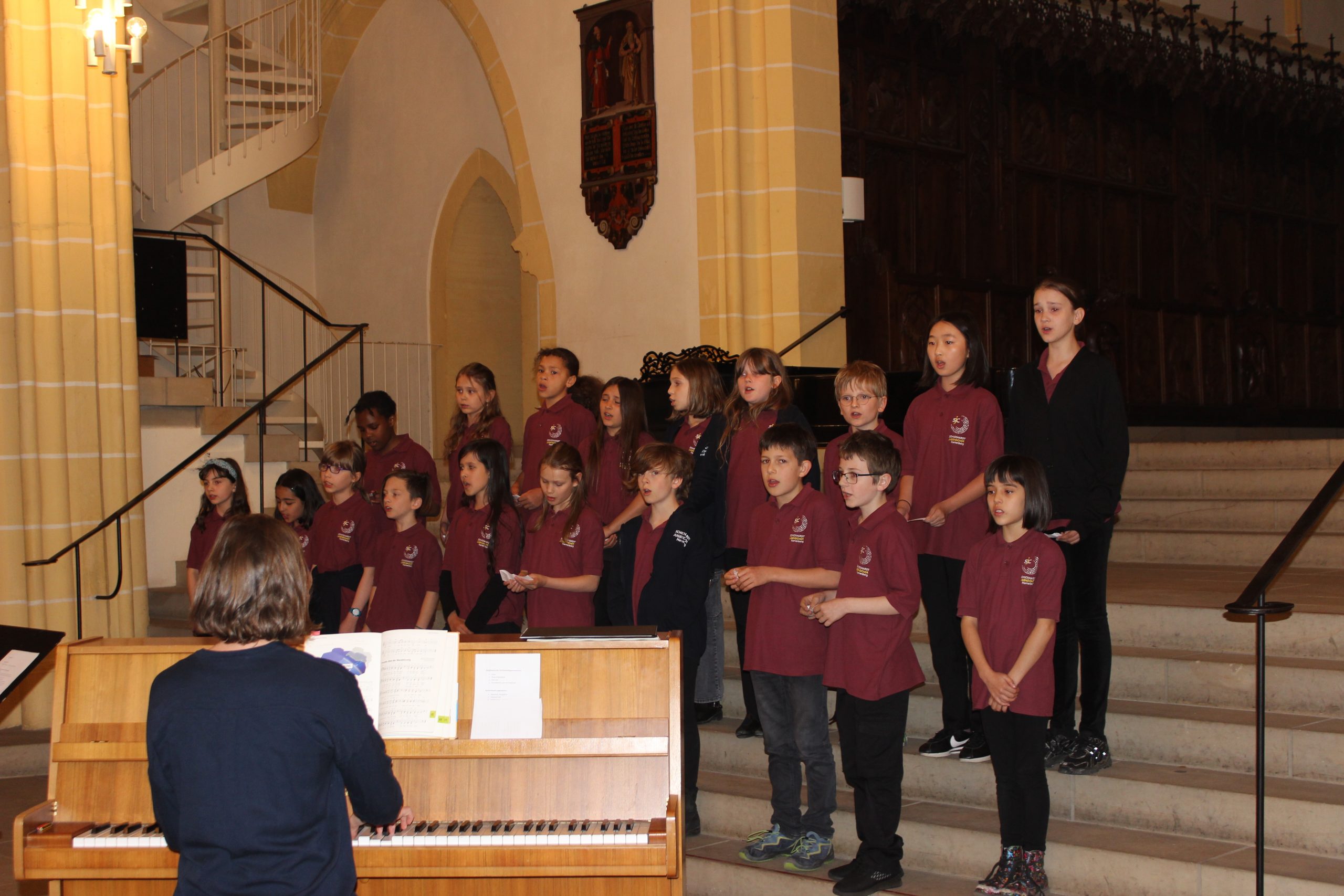 Der Oberstufenchor begann mit „April is in my Mistress‘ face“ gefolgt von „Ubi Caritas“ mit zwei ruhigeren Stücken. „Auld lang syne“ wurde abwechselnd von mehreren Mitgliedern des Chores dirigiert und brachte eine melancholische Stimmung zum Ausdruck. Der irische Segenswunsch „May the road rise to meet you“ brachte den Kirchenraum zum Klingen bevor mit „A million dreams“ ein harmonischer Abschluss gefunden wurde.