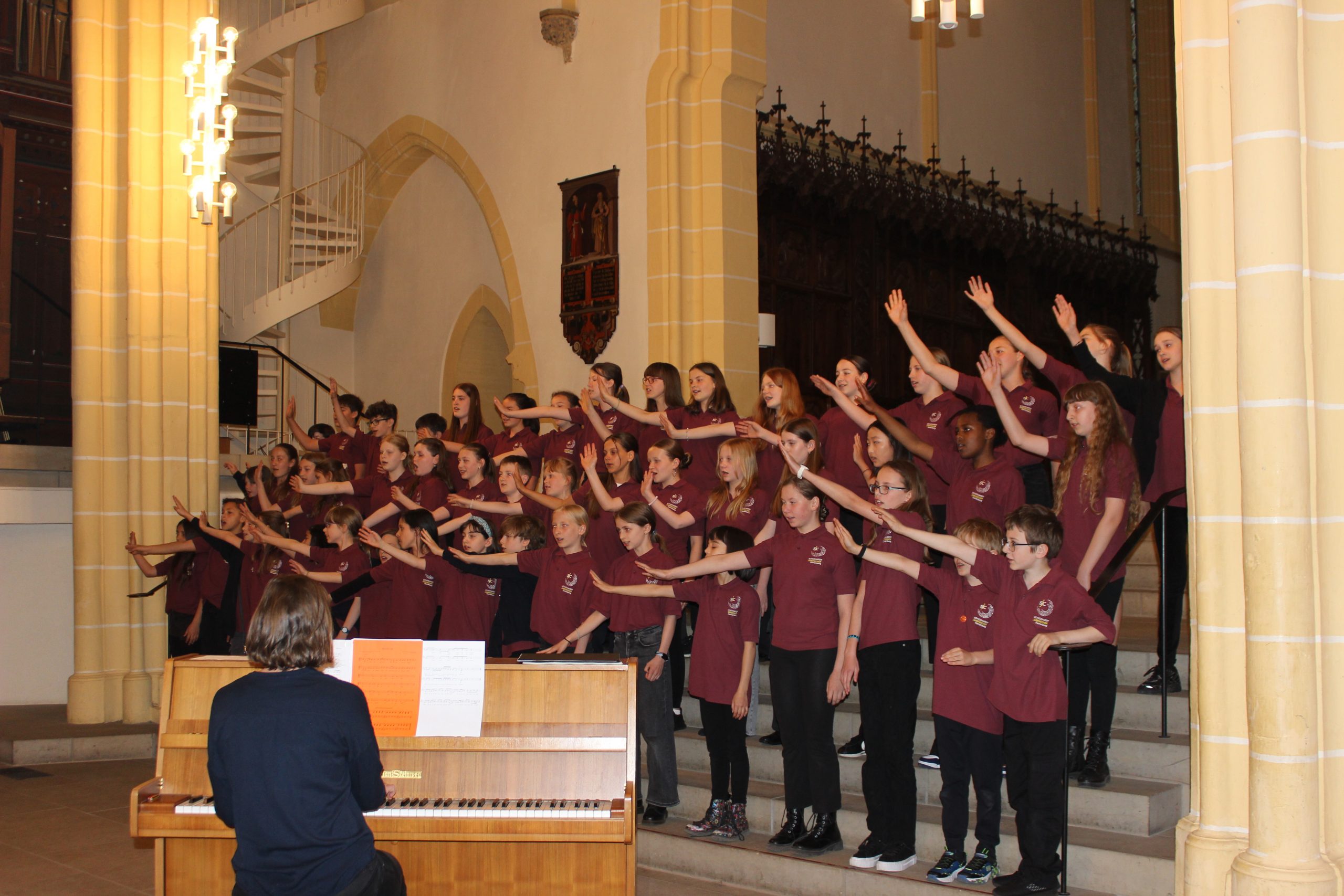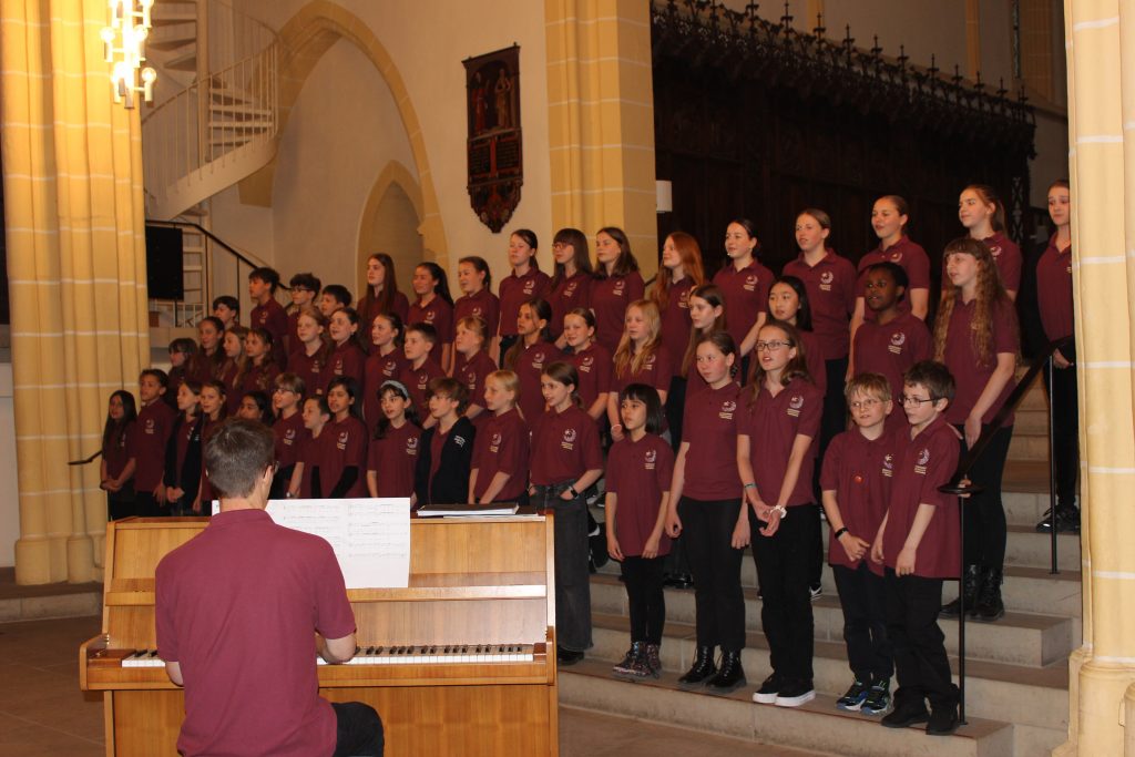Den Anfang machten alle Chöre gemeinsam. Mit „Feel the rhythm, feel the powerful beat“ geleitet von Patrick Erhard und begleitet von Johannes Fiedler wurden die Zuhörerinnen und Zuhörer in der vollbesetzten Stiftskirche gleich in den Sog der Musik gezogen. Nach der Begrüßung durch Christa Feige machte dann die Jugendkantorei der Stiftskirche den Anfang. Johannes Fiedler begleitete den Chor bei fünf Stücken aus dem Gloria RV 589. Im Anschluss betrat die Kinderkantorei unter Gesang die Bühne. Die Kinder im Grundschulalter präsentierten ein rundes Programm. Mit „Wir sind alle Menschenkinder“ endeten sie ihren Beitrag mit einem Appell an die Menschlichkeit.