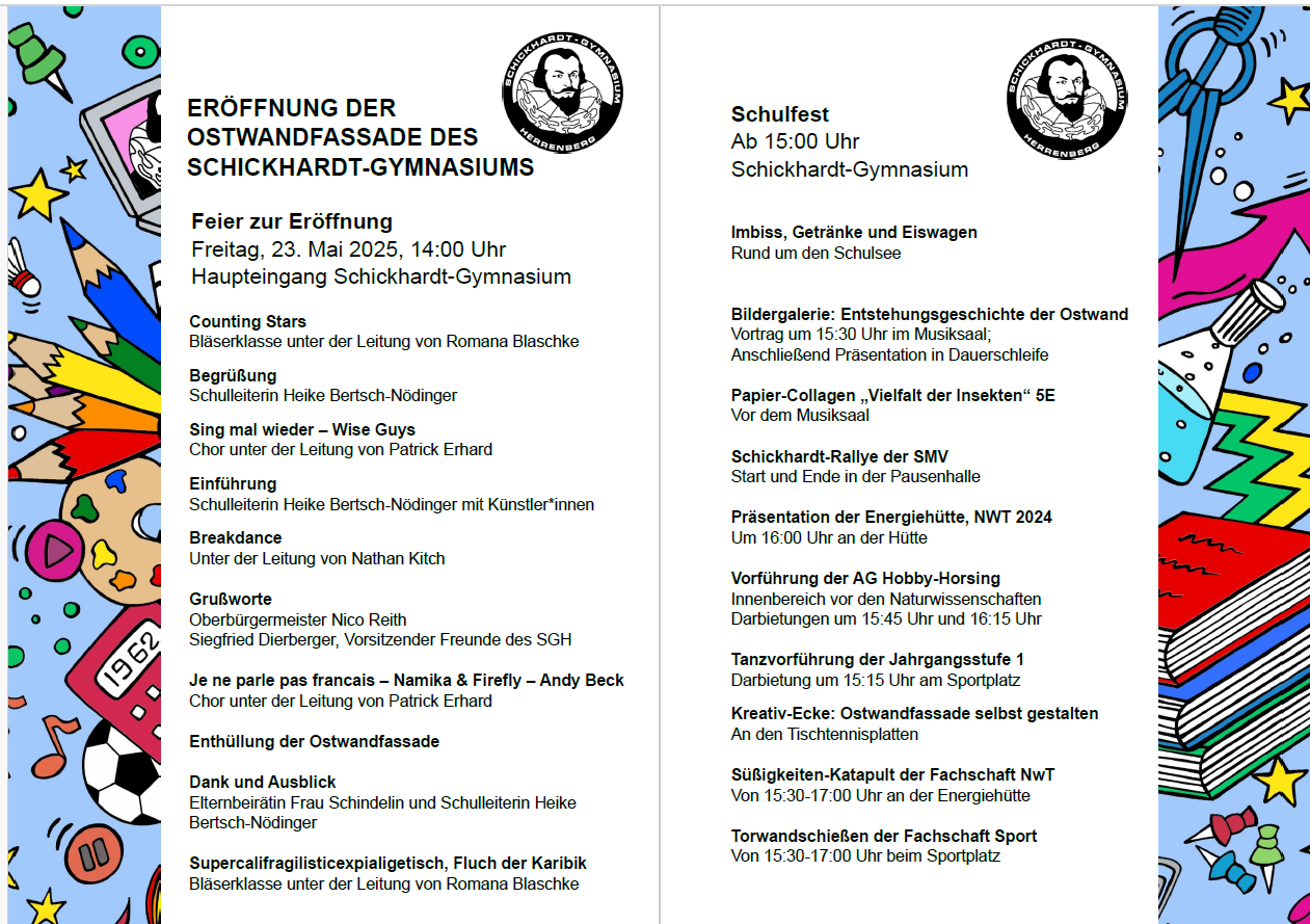 Tim Berger, 9d Eröffnung Ostwandfassade und Schulfest 21. Mai 202527. Mai 2025 Redaktion Schulhomepage Wir freuen uns auf viele tolle Darbietungen unserer Schülerinnen und Schüler am Freitag! Was genau geboten wird, können Sie hier lesen Allgemein