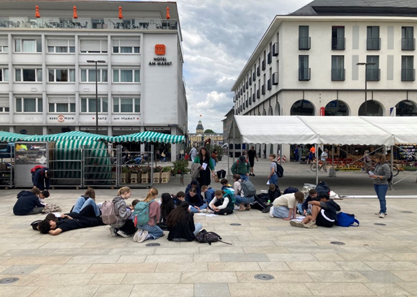 Als wir endlich am Hauptbahnhof in Karlsruhe ankamen, mussten wir nur 5 Minuten bis zum bekannten Zoo laufen. Hier mussten wir noch etwas auf unsere, nur recht wenigen Austauschschüler und -schülerinnen warten. Als wir komplett waren ging es auch schon los mit unserer ersten Rallye durch den Zoo in deutsch-französischen Gruppen. Diese erstreckte sich bis zum Mittagspicknick. Wir aßen alle in Ruhe unser mitgebrachtes Essen oder kauften uns bei kleinen Essensständen Crêpes oder Getränke. Nun liefen wir noch in die Innenstadt und begannen an einem kleinen Kreisverkehr unsere zweite Rally, die uns durch die ganze Innenstadt bis zum Schloss führen sollte. Über Teamwork und gemeinsames Vorlesen erfuhren wir viel über Karlsruhe und Gebäude in der Innenstadt. Danach durften wir noch auf eigene Faust in einer großen Straße umherbummeln.