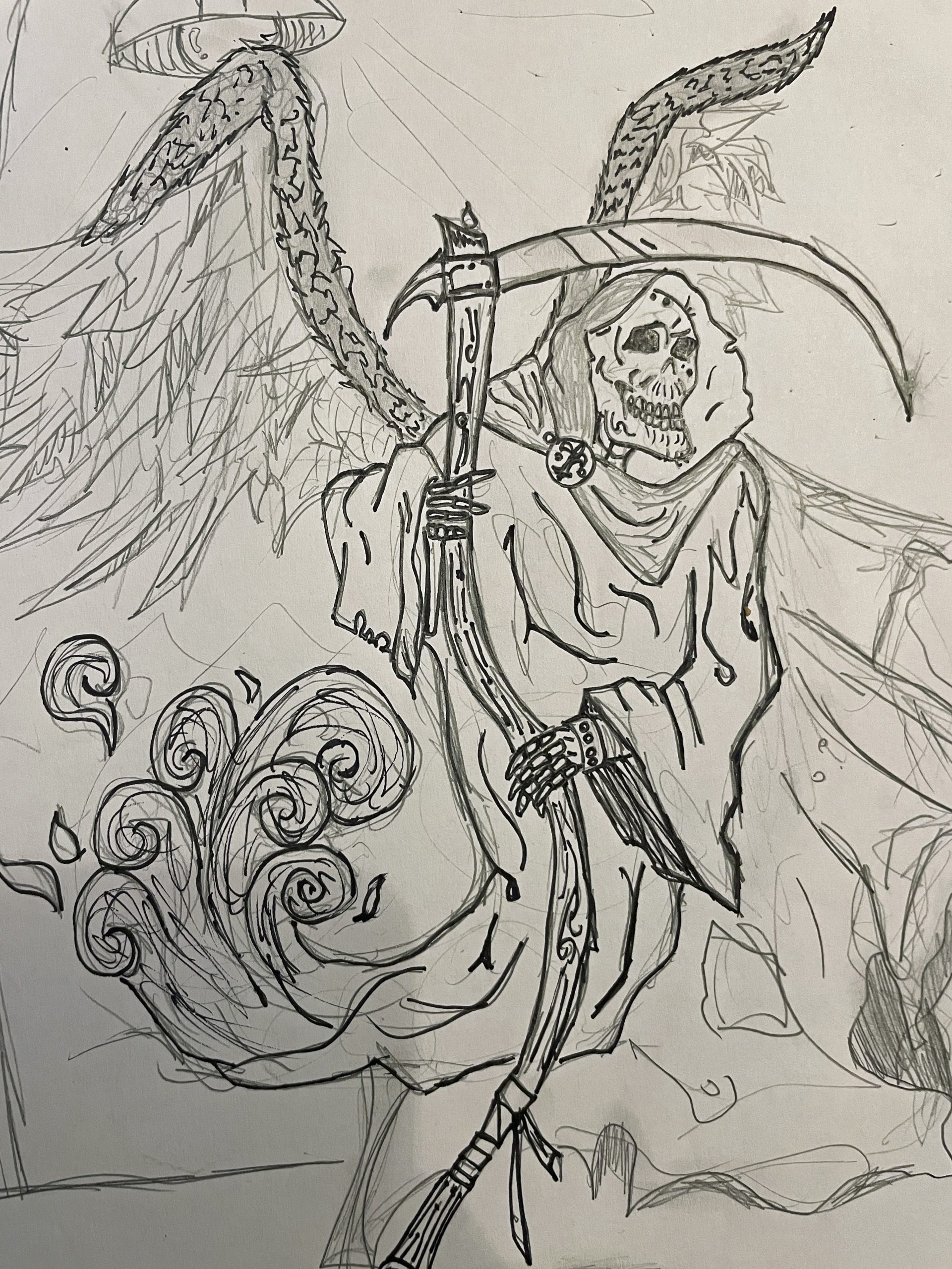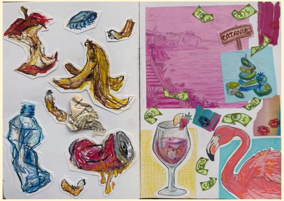 Wir haben sie gefragt, wie sie die Arbeit an ihrem Skizzenheft zu der gestellten Aufgabe „Mein Ding“ empfunden hat: „Am Anfang fand ich das Thema echt schwer“, erzählte Annabella. „Ich sollte mir Gedanken machen, was Dinge für mich bedeuten – also nicht nur Sachen, die man besitzt, sondern auch, was sie mit einem machen. Die Songs „Wildberry Lillet“ von Nina Chuba und „Dinge“ von Deichkind wurden beim Thema als Inspiration genannt. Der eine Song zeigt eher, wie Dinge cool wirken können, der andere kritisiert, dass wir manchmal zu viel haben. Die Arbeit am Skizzenheft war intensiv, manchmal echt knifflig, aber auch sehr spannend. Den Großteil der Bilder habe ich in den Osterferien gemacht. Manchmal kamen die Ideen ganz plötzlich, manche Ideen haben sich erst beim Zeichnen richtig entwickelt. Am Ende hat es unheimlich viel Spaß gemacht. Ich freue mich riesig darüber, dass mein Skizzenheft den Leuten von der Kulturakademie so gut gefallen hat, dass ich zum Workshop nach Schloss Rotenfels eingeladen wurde.“