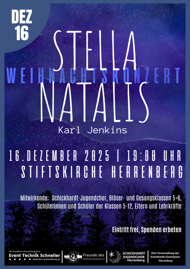 Im ersten Teil des Konzerts treten die Sing- und Bläserklasse und der Schickhardt Jugendchor auf. Im zweiten Teil erklingen Auszüge aus Stella Natalis von Karl Jenkins – ein musikalisch wie inhaltlich vielfältiges Werk, dass verschiedene Themen, Bilder, Gefühle und Assoziationen rund um die Advents- und Weihnachtszeit aufgreift und feiert. Der Komponist ist für einen genreübergreifenden Kompositionsstil bekannt. Seine Musik verbindet häufig Elemente aus Klassik, Weltmusik, Jazz und Pop zu einem oft meditativen und emotional zugänglichen Klangbild. Der noch lebende Jenkins gilt als einer der Popstars unter den Komponisten.