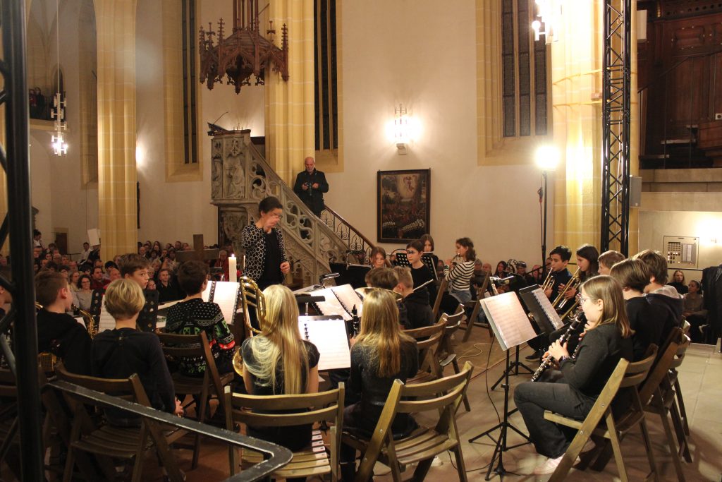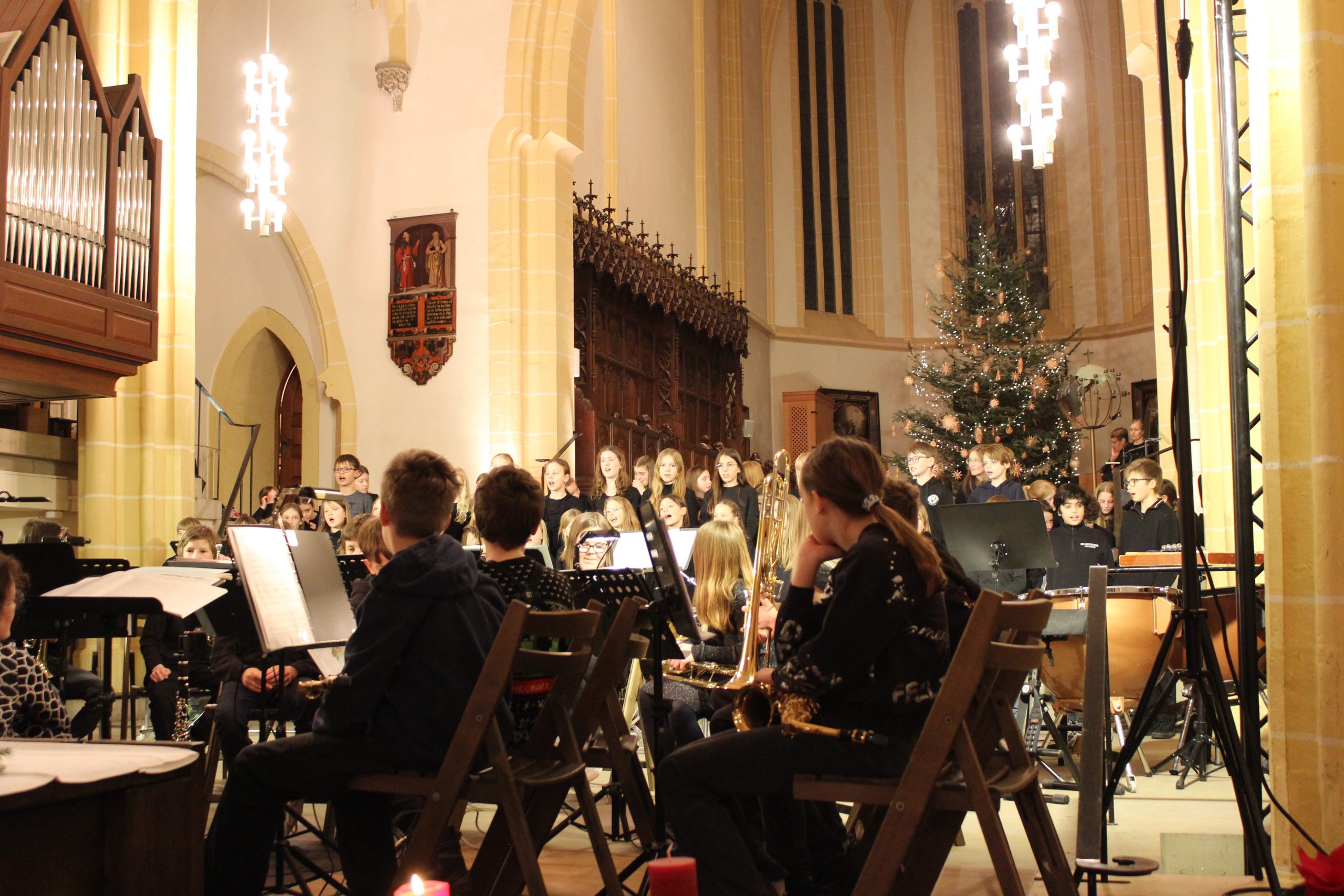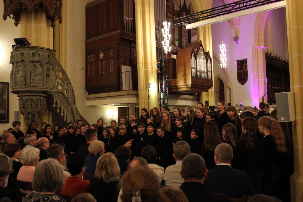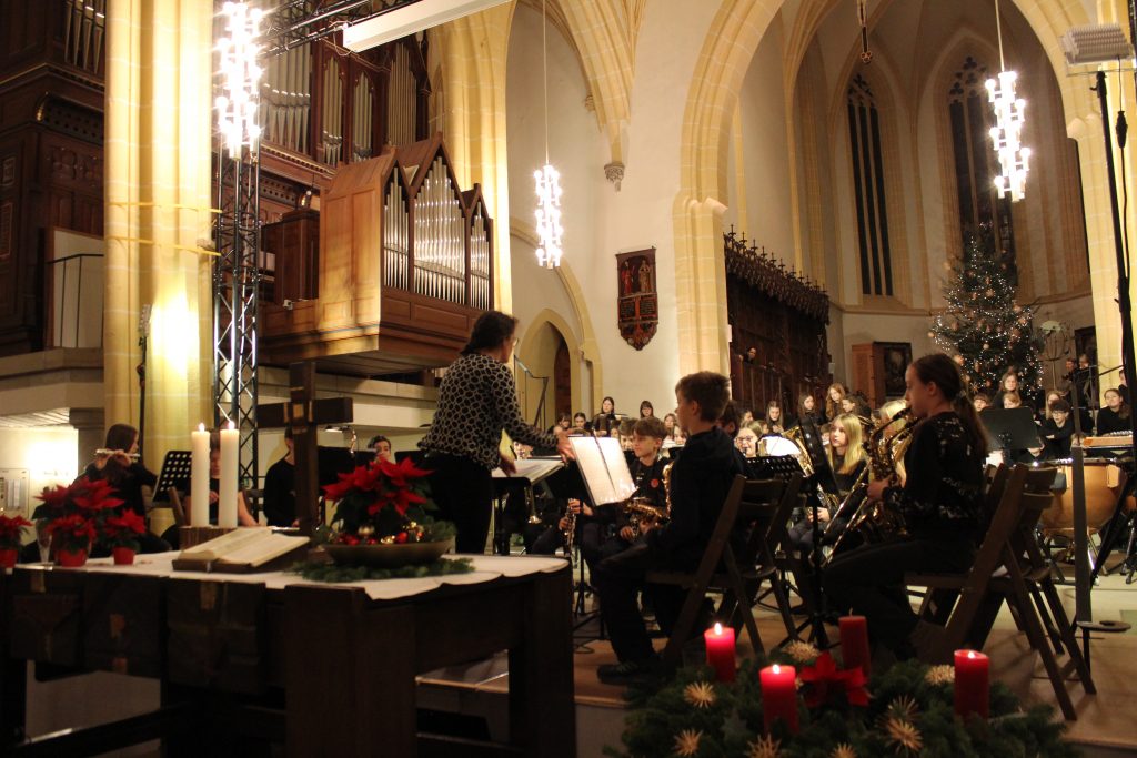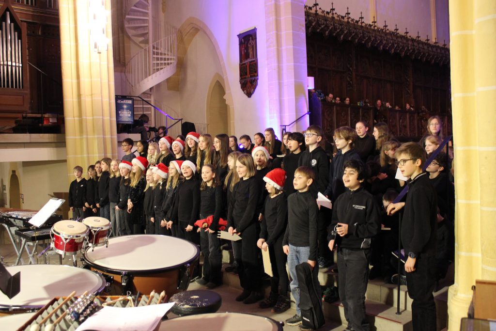 Nach der Begrüßung durch Musiklehrer Patrick Erhard folgte ein gemeinsames Lied, bevor in einem ersten Block die jüngsten Ensembles ihr Können präsentierten. Die Bläserklasse 6d gab unter Leitung von Romana Blaschke das Thema aus dem Film „Forrest Gump“ zum Besten bevor der E- Chor, der jüngste Chor unserer Schule, schwungvoll das Lied „Weihnachtswichtel“ präsentierte. Clarissa Oesterle begleitete dabei am Klavier. Nach nur 3 Monaten Instrumentalunterricht hatte nun die Bläserklasse 5c ihren ersten Auftritt vor großem Publikum. Sie spielte das Stück „Hänsel und Gretel“. Anschließend stimmten die Bläserinnen und Bläser, sowie die Sängerinnen und Sänger der Klasse 6e zu dem Lied „Hört der Engel helle Lieder“ mit ein. Die bekannten Harmonien versetzten das Publikum gleich in Weihnachtsstimmung, ebenso wie das Lied „The first Noel“, das von der Gesangsklasse 5d präsentiert wurde. Mit „Musica dei“ gehörte die Bühne noch einmal dem E- Chor. Im Anschluss spielte die Bläserklasse 6d das Lied „Tochter Zion“. Zum Abschluss des ersten Blockes vereinten sich die Stimmen der Gesangsklasse 6e aus allen Ecken des Kirchenraumes zum Lobgesang „All praise to thee“. Der folgende Applaus feierte die jüngsten Musikerinnen und Musiker lautstark.