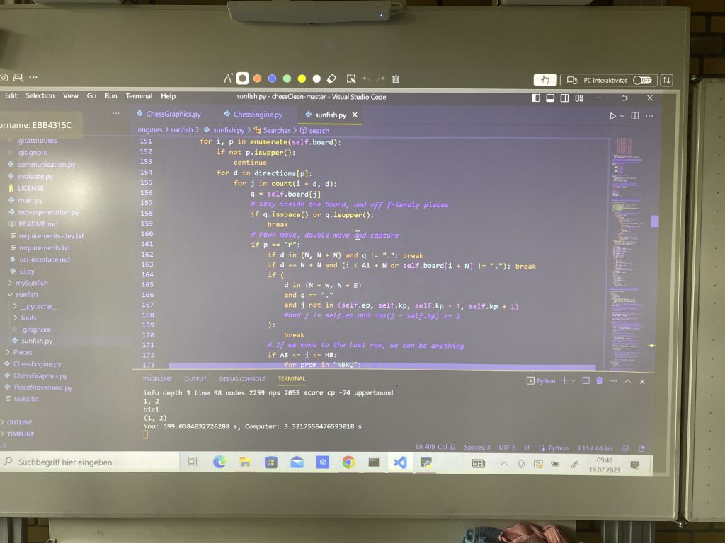 Die Entwicklung eines Schachcomputers beginnt damit, dass Programmierer eine geeignete Computersprache wählen, um die Schachregeln in einem Computerprogramm umzusetzen. Dadurch kann der Computer verstehen, wie sich die Schachfiguren bewegen und welche Züge erlaubt sind. Die Gruppe hat sich entschieden, die Programmiersprache „Python“ zu wählen, zwar ist sie etwas langsamer als die anderen Programmiersprachen, dafür aber deutlich einfacher und verständlicher.