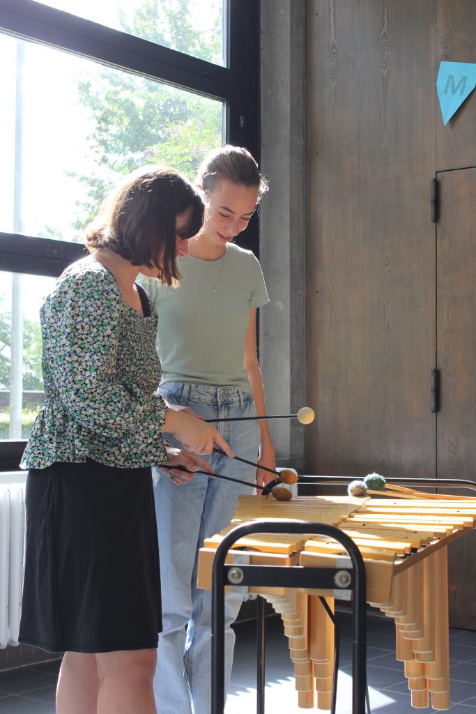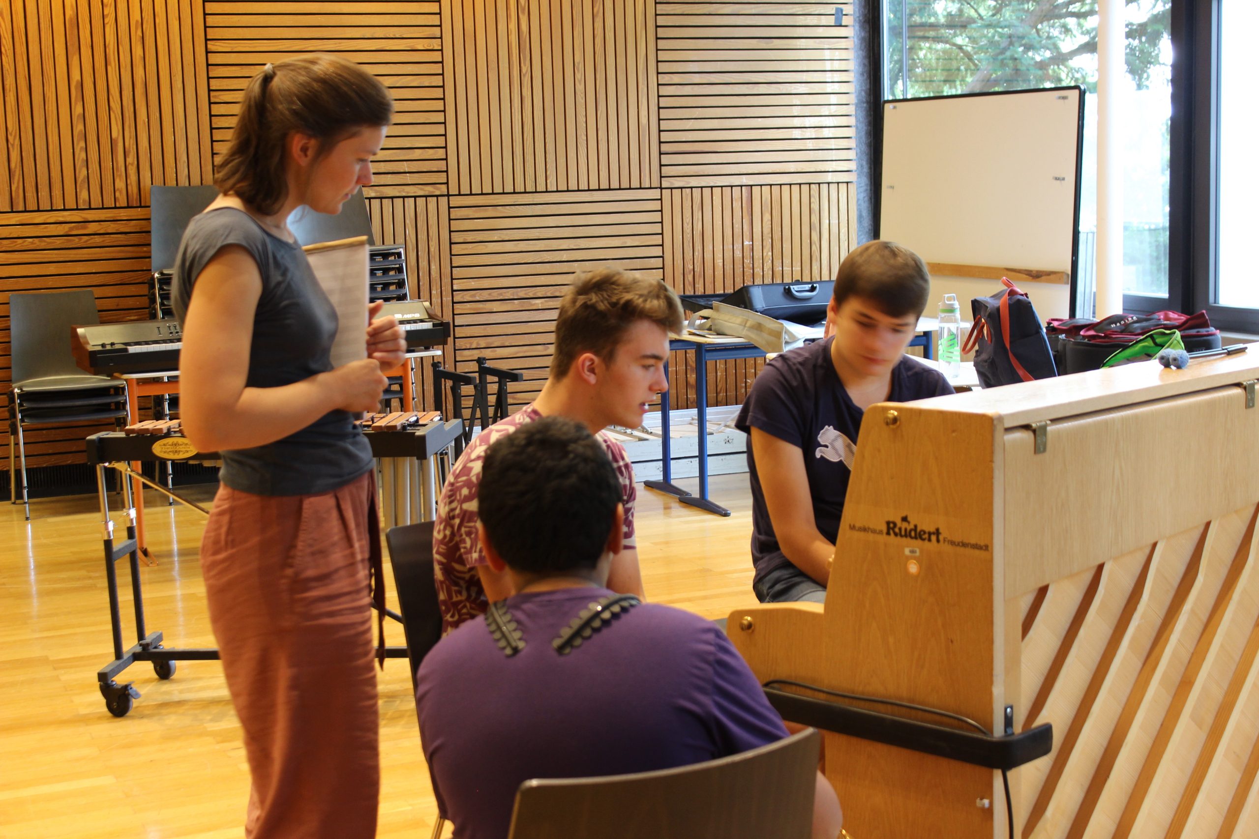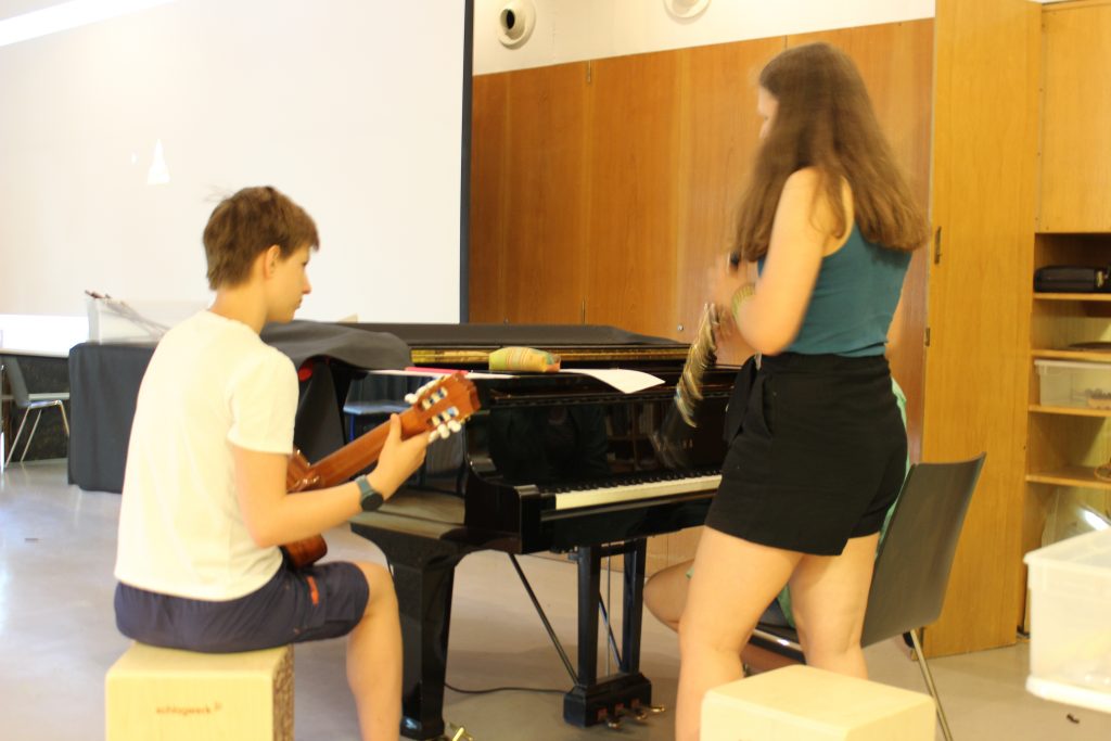 Am ersten Tag haben sie sich mit einer Szene aus dem Film „Lama Drama“ beschäftigt. Zuerst schauten die Schülerinnen und Schüler die Szene ohne Ton an und sollten dann die passende Musik dazu erfinden, zur Verfügung standen ihnen verschiedene Instrumente aus dem Musiksaal.