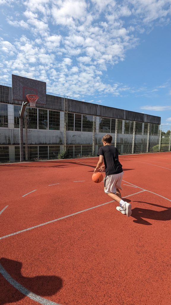 Im Basketball-Projekt fing die Gruppe zunächst an, sich zu dehnen und sich aufzuwärmen. Daraufhin folgten verschiedene Übungen, bei denen sie beispielsweise das Dribbeln verbesserten, welches erforderlich ist, um die Gegner auszuspielen. Zudem trainierten sie ihre Wurftechnik. Hierbei ist wichtig zu beachten, dass eine unterschiedliche Punktzahl erzielt werden kann, je nachdem von welcher Position man wirft. Außerdem machten sie auch Taktikübungen, um ihr Spiel zu verbessern. Am letzten Tag spielten alle Teilnehmerinnen und Teilnehmer ein Turnier, bei dem sie das Erlernte anwenden konnt