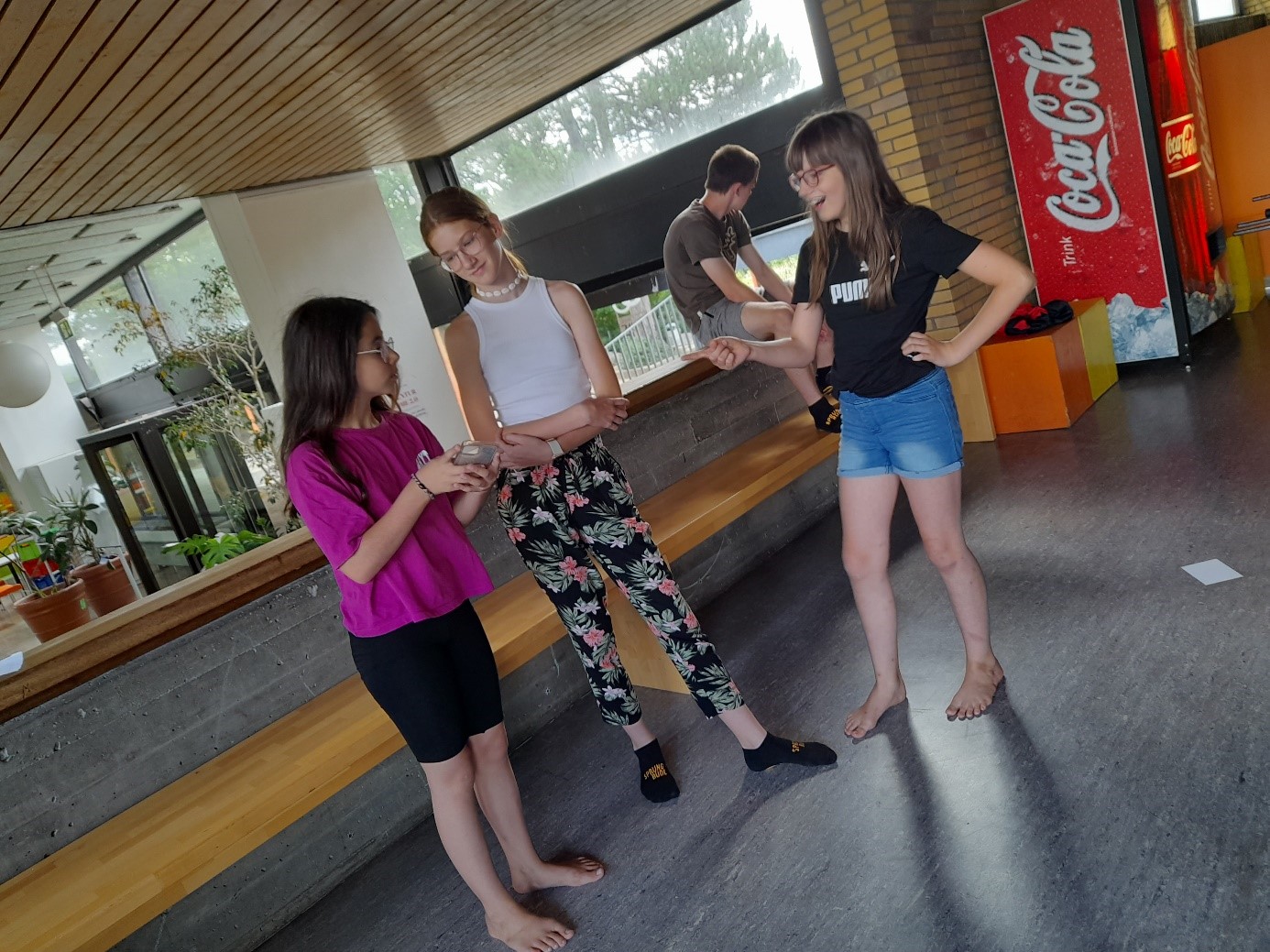 Das Leitungsteam, das schon etwas länger tanzt, brachte der Gruppe verschiedene Tanzschritte bei, welche diese zu passender Hip Pop-Musik einstudierte. Beim Tanzen ist wichtig zu beachten, dass man eine gute Balance hat. Zudem braucht man ein gutes Gedächtnis. Manchmal kombinierten sie noch andere Tanzschritte mit der bisherigen Tanzchoreo. Das Tanzen machte den Teilnehmerinnen und Teilnehmern viel Spaß, weil sie ihre eigenen Choreographien erfinden und sich über Danceskills austauschen konnten.