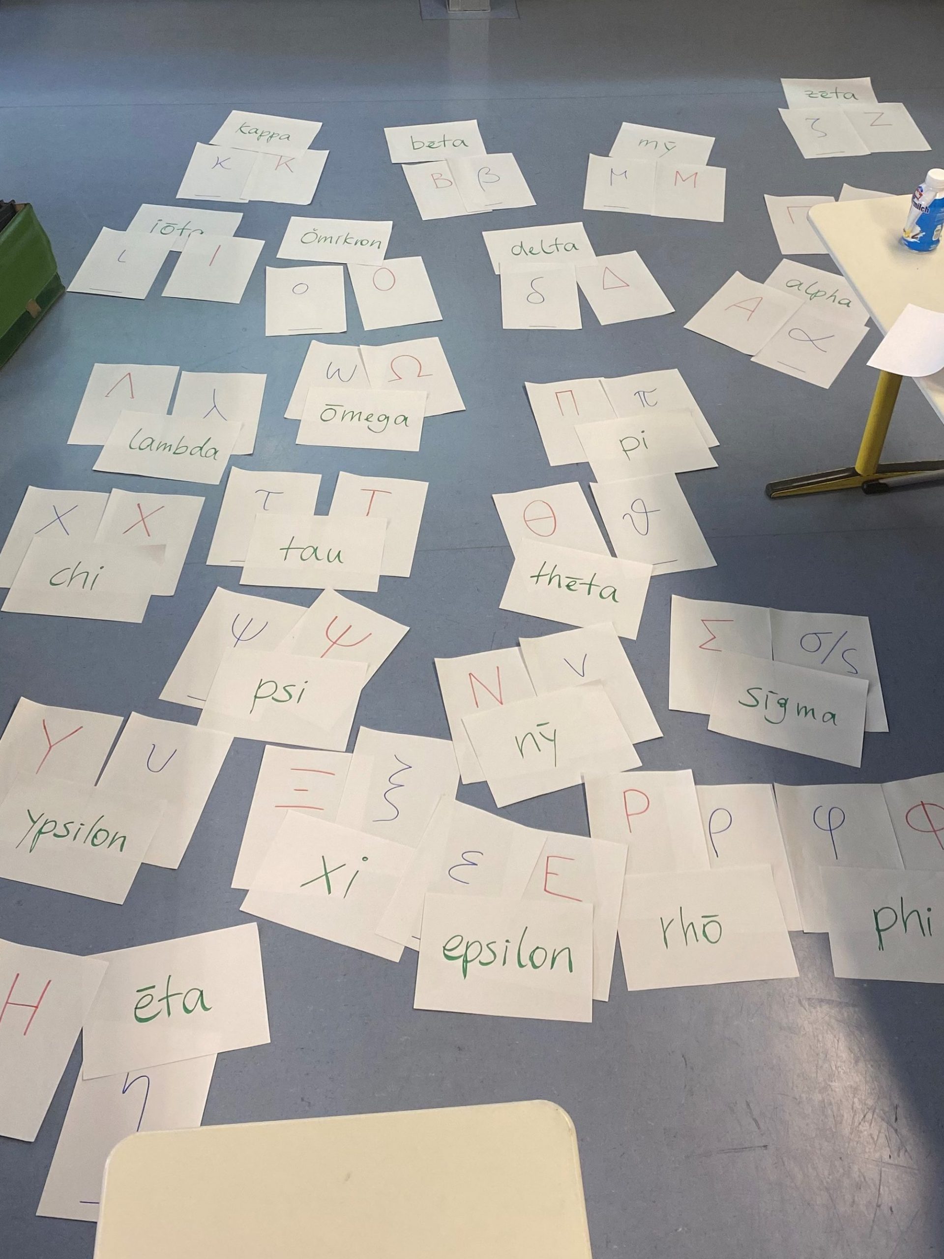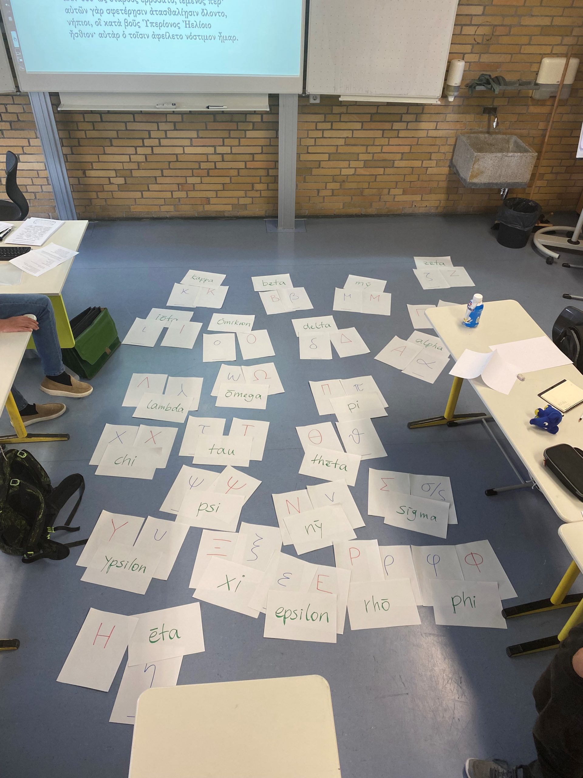 Am ersten Tag haben sich die Projektleiter Herr Ayaita und Frau Kudella dazu entschieden, sich mit Altgriechisch zu beschäftigen. Zunächst haben sie sich das griechische Alphabet angeschaut, da es aus komplett anderen Buchstaben besteht und auch ein paar grundlegende Wörter. Einige griechische Buchstaben und Wörter kennt man auch aus dem Alltag, z.B. Alpha, Beta und Gamma aus der Mathematik. Bis heute werden altgriechische Wörter und Buchstaben aktiv in Formeln oder wissenschaftlichen Beschreibungen verwendet, da die altgriechische Ära die Zeit der wissenschaftlichen Entdeckungen war. Außerdem haben sie sich mit der Geographie beschäftigt.
