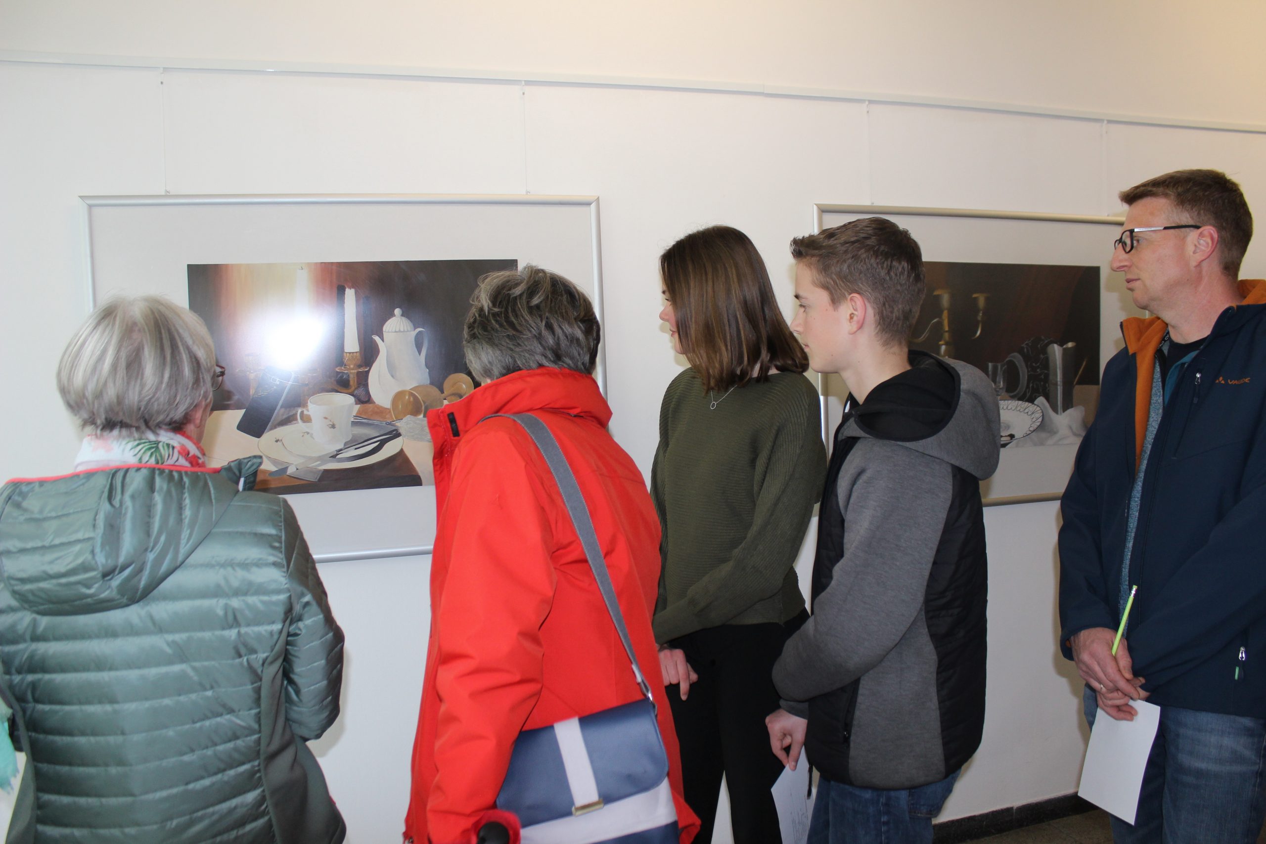 Der Titel der Ausstellung ist eine Erinnerung an die Vergangenheit, als Oma und Opa die ersten Bewunderer der Werke waren. Eine Zeitreise zu einem eigenen Genre der Malerei, das eine lange Tradition aufweist und mit modernen Elementen neu interpretiert wird, findet im ersten Stock statt, wo die Schülerinnen des Kurses großformatige Stillleben ausstellen. Diese Bilder faszinieren durch viele Details und die Integration moderner Elemente in die traditionelle Kompositionsweise. Wencke Roth betonte in ihrer Begrüßungsrede das große Engagement der Schülerinnen, das in diesen Bildern steckte, denn teilweise malten sie fünf Monate an einem Bild und alle trafen sich sogar in den Osterferien einen ganzen Tag in der Schule um an den Stillleben zu arbeiten.