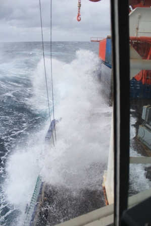 Über Lautsprecher wurde von der Brücke bekanntgegeben, dass über Nacht das Wetter sehr schlecht werden soll. Alle Gegenstände, besonders Computer, Fotokameras und Forschungsgeräte, sollen gesichert werden, damit nichts herunter- bzw. umfallen und beschädigt werden kann. Auch für die Betten gibt es ein spezielles Brett, welches verhindern soll, dass man bei starkem Wellengang im Schlaf aus dem Bett rollt. Da ich oben schlafe, werde ich es sicherheitshalber anbringen, denn 7 Meter hohe Wellen, bei Windgeschwindigkeiten bis zu 12 Beaufort, können das Schiff ganz schön ins Schwanken bringen. Solange wir in dieser Schlechtwetterfront hängen, wird das Schiff an Ort und Stelle bleiben. Wenn nötig bis zu 2 Tagen. Alle Arbeiten wurden bis auf weiteres verschoben. Ich war sicherheitshalber schon beim Arzt und habe mir Medikamente gegen Seekrankheit geben lassen.