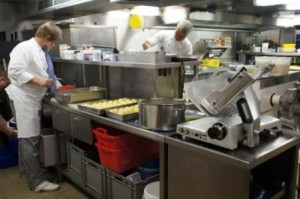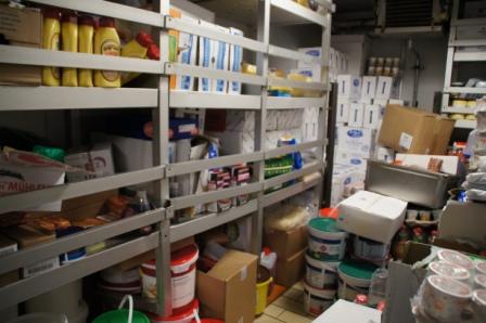 Die Vorräte werden in 5 verschiedenen Kühl- bzw. Gefrierräumen aufbewahrt. Das Foto zeigt nur einen kleinen Ausschnitt aus einem der Kühlräume. Unglaublich, wie sich die Köche dort zurechtfinden. Für Micha, den Bäcker, beginnt der Arbeitstag um halb 5, die anderen stoßen um 6 Uhr dazu. Gekocht und gebacken wird bis halb 1, dann ist Mittagspause. Zwischen 13 und 14 Uhr wird das Abendessen vorbereitet. Ab halb 7 haben sie Feierabend.